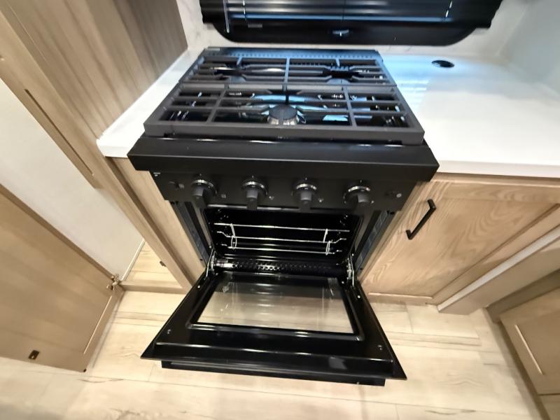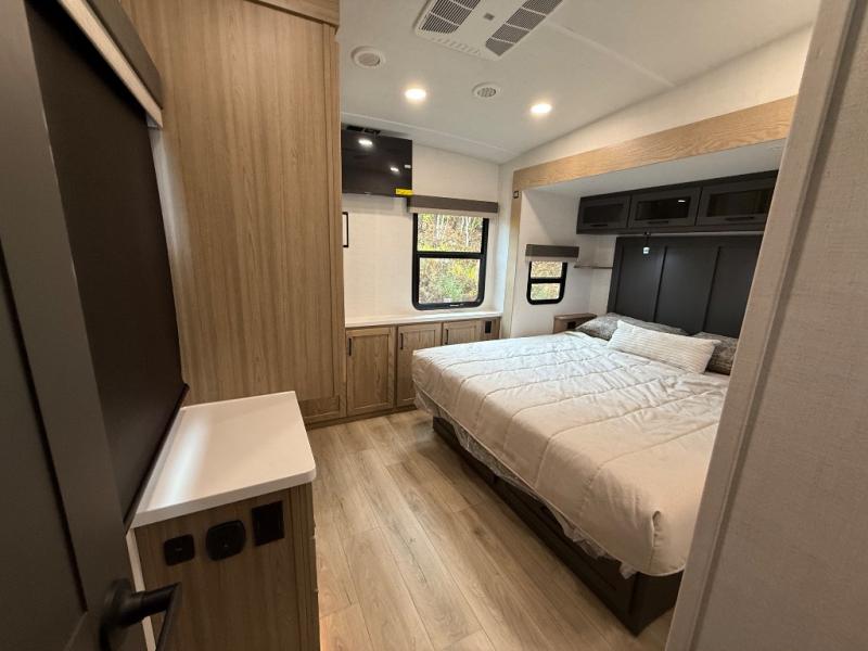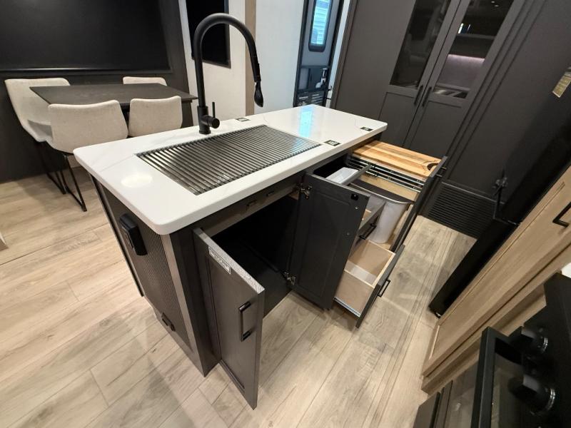 The gourmet kitchen is ready for your favorite meals, featuring a large island, solid-surface countertops, and top-quality appliances that make cooking a pleasure—not a chore. When the day winds down, retreat to your private master suite with a king-size bed, tons of storage, and a restful atmosphere that guarantees sweet dreams no matter where you’re parked.