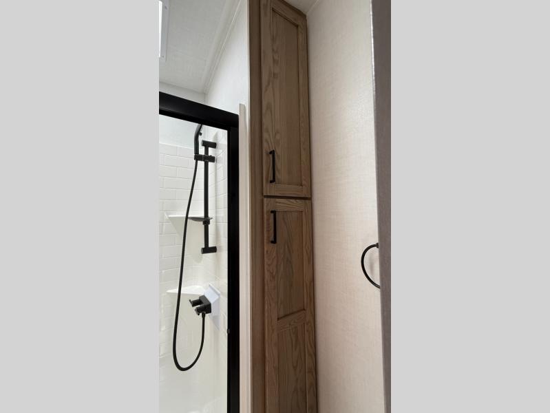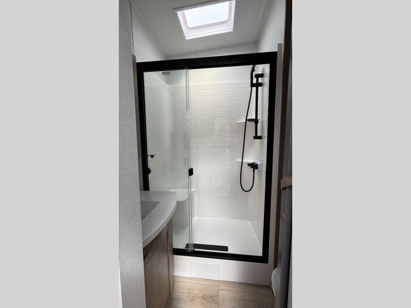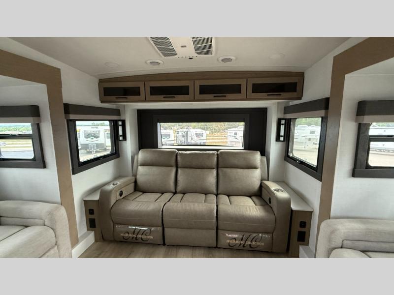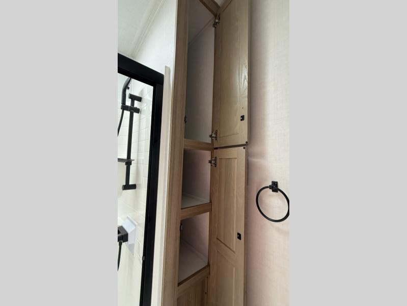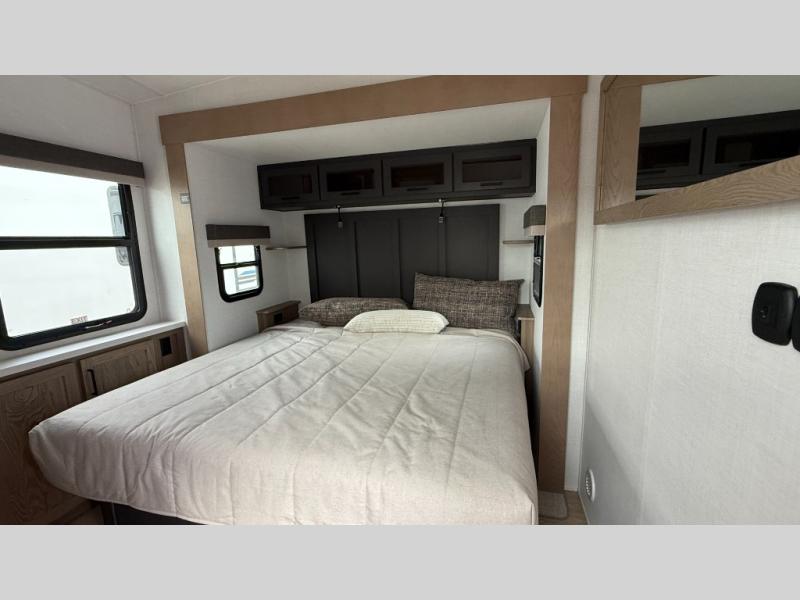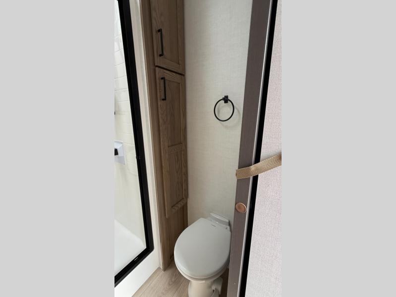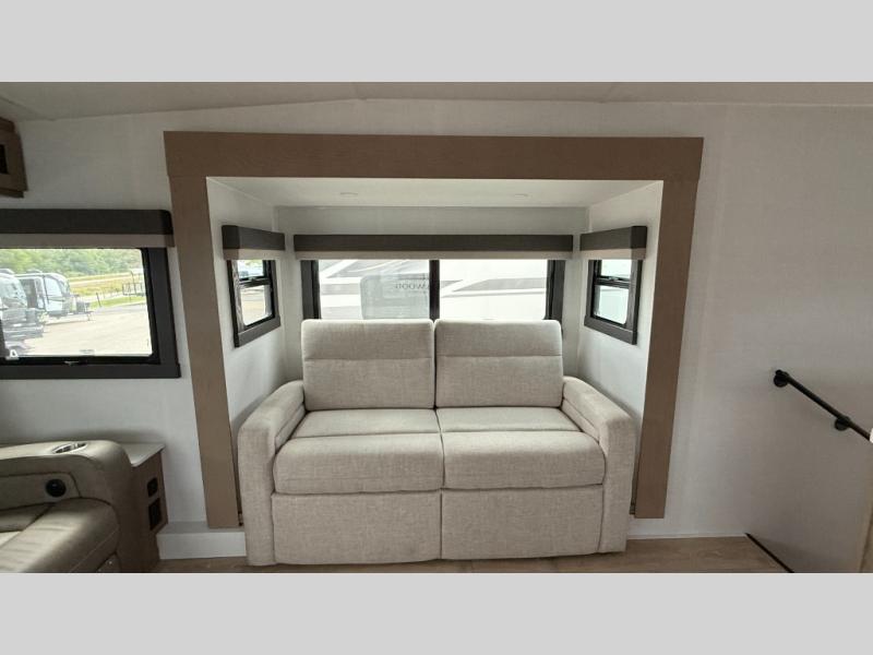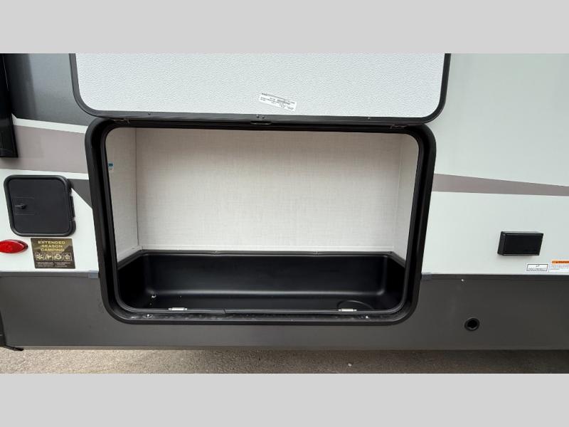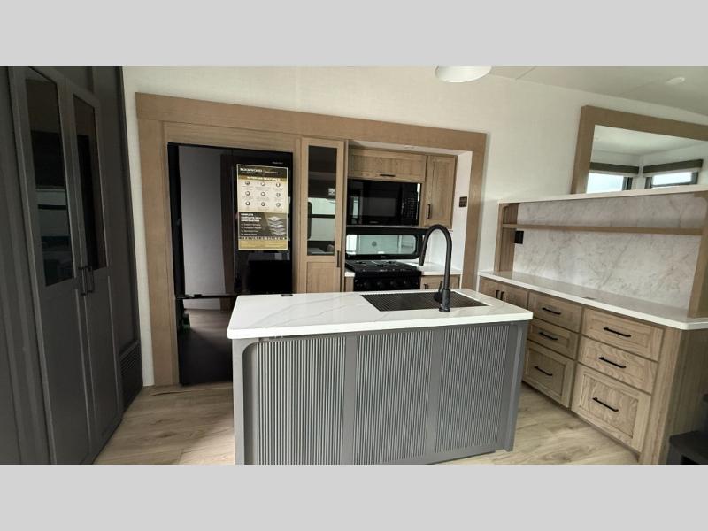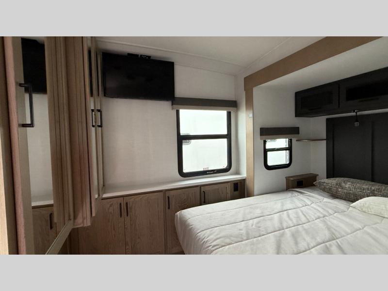 This fifth wheel is designed for comfort, connection, and relaxation on the road. The 72" x 80" king bed in the bedroom offers a spacious and restful retreat after a long day. Mealtime is a time to gather, and the rotating table with chairs creates the perfect setting to sit down, share stories, and reflect on the day’s adventures. For more laid-back evenings, the front living area features a Televator TV, turning the space into a cozy home theater for movie nights with the whole crew. When it’s time to wind down, two 68" hide-a-beds provide additional sleeping space, ensuring everyone has a comfortable place to rest.