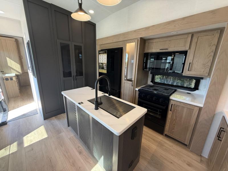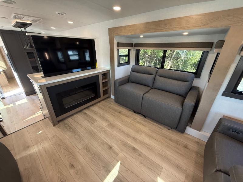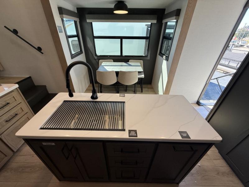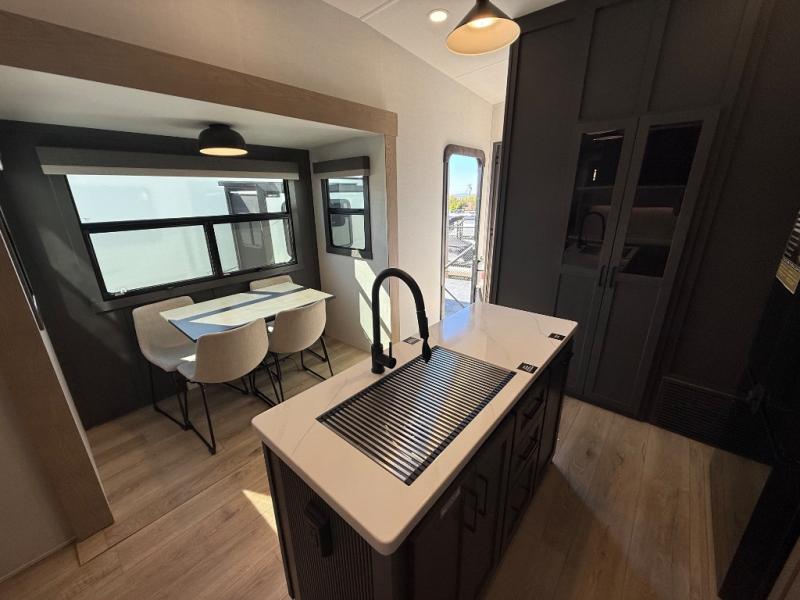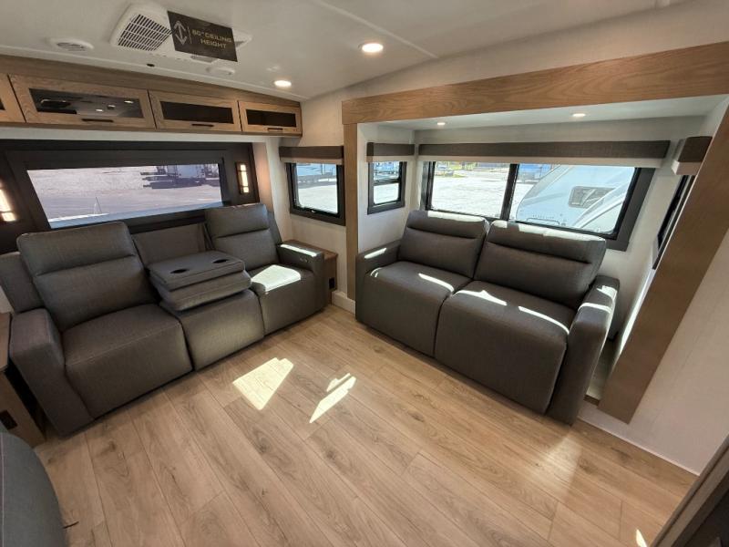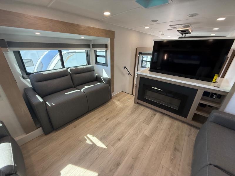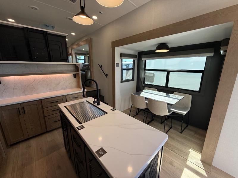 This fifth wheel is designed for comfort, connection, and relaxation on the road. The 72" x 80" king bed in the bedroom offers a spacious and restful retreat after a long day. Mealtime is a time to gather, and the rotating table with chairs creates the perfect setting to sit down, share stories, and reflect on the day’s adventures. For more laid-back evenings, the front living area features a Televator TV, turning the space into a cozy home theater for movie nights with the whole crew. When it’s time to wind down, two 68" hide-a-beds provide additional sleeping space, ensuring everyone has a comfortable place to rest.