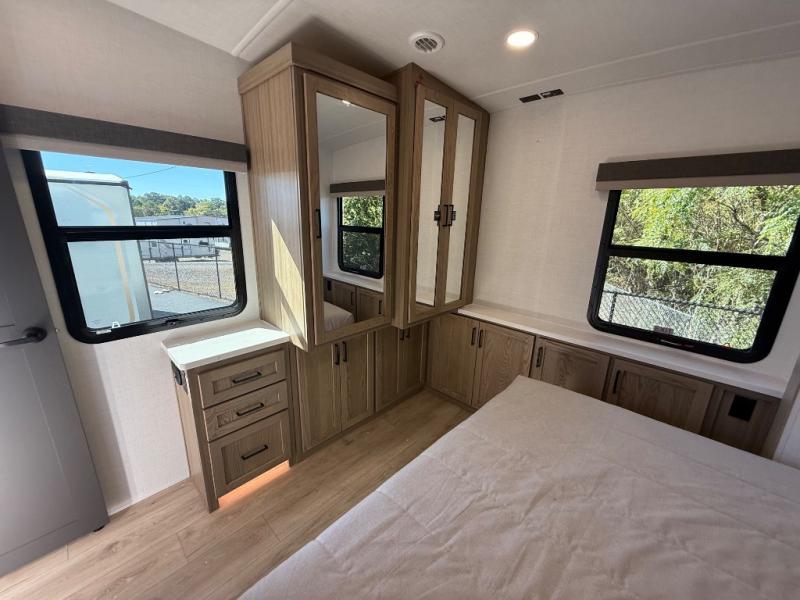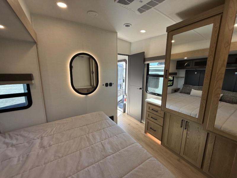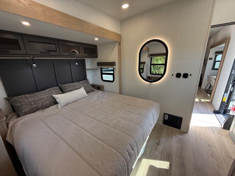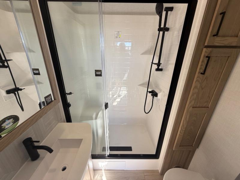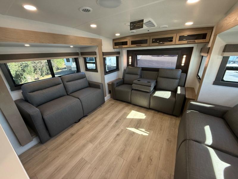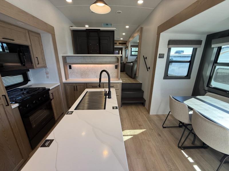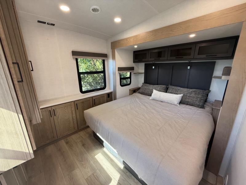 This fifth wheel is designed for comfort, connection, and relaxation on the road. The 72" x 80" king bed in the bedroom offers a spacious and restful retreat after a long day. Mealtime is a time to gather, and the rotating table with chairs creates the perfect setting to sit down, share stories, and reflect on the day’s adventures. For more laid-back evenings, the front living area features a Televator TV, turning the space into a cozy home theater for movie nights with the whole crew. When it’s time to wind down, two 68" hide-a-beds provide additional sleeping space, ensuring everyone has a comfortable place to rest.