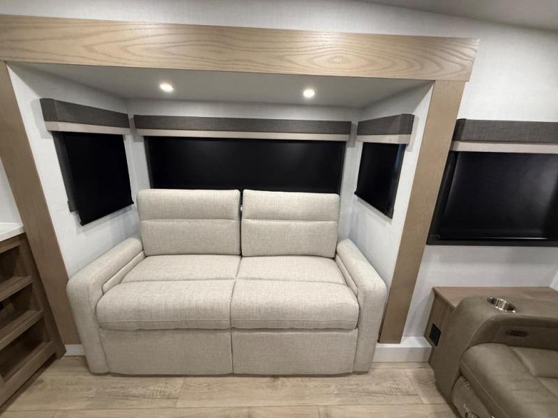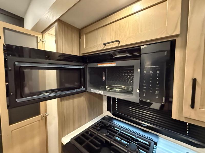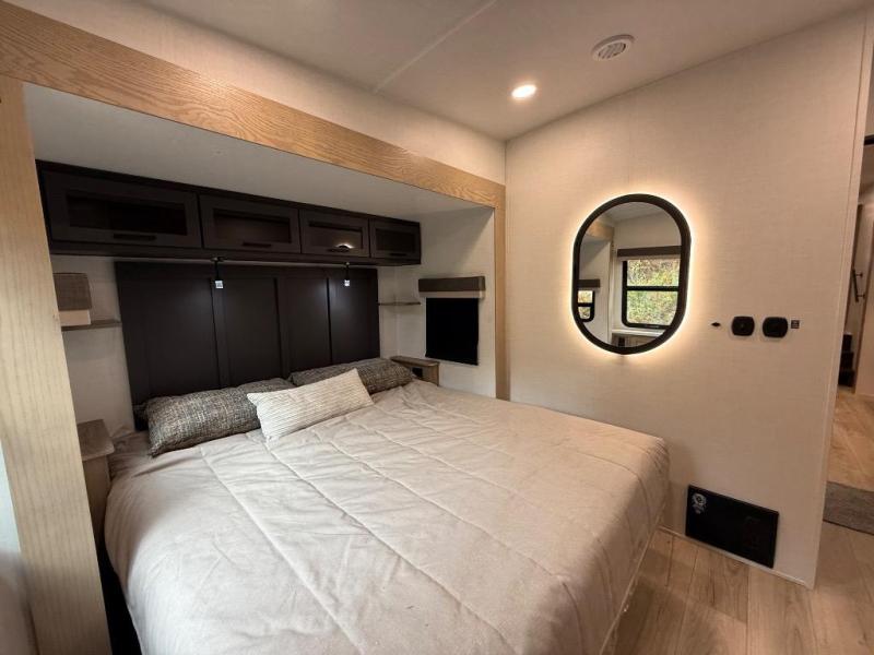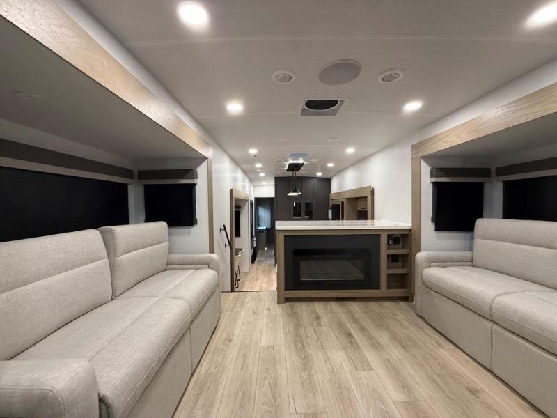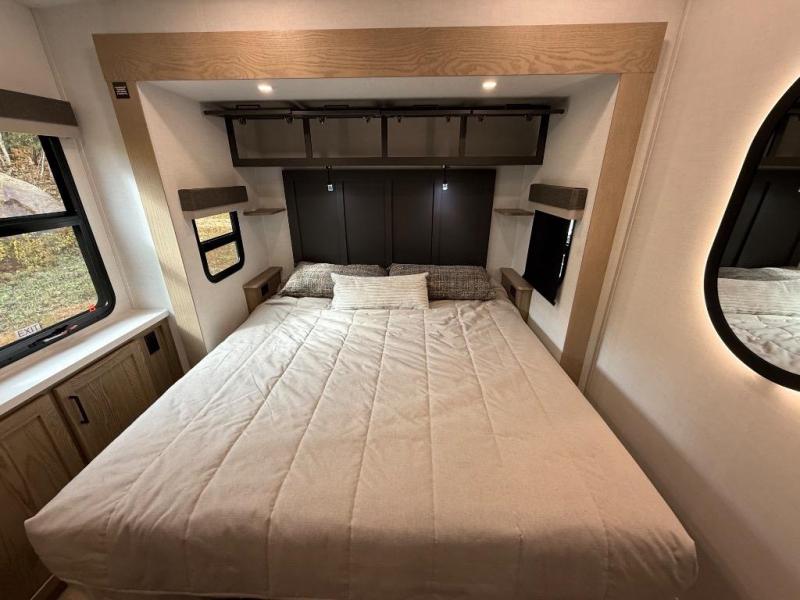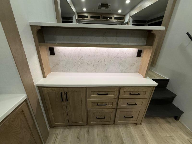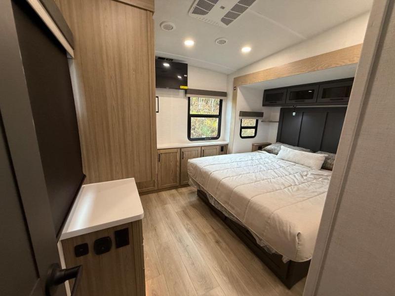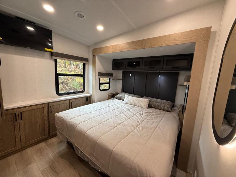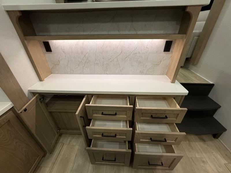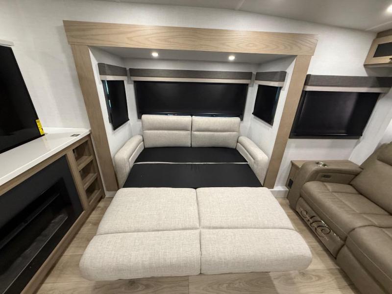 This fifth wheel is designed for comfort, connection, and relaxation on the road. The 72" x 80" king bed in the bedroom offers a spacious and restful retreat after a long day. Mealtime is a time to gather, and the rotating table with chairs creates the perfect setting to sit down, share stories, and reflect on the day’s adventures. For more laid-back evenings, the front living area features a Televator TV, turning the space into a cozy home theater for movie nights with the whole crew. When it’s time to wind down, two 68" hide-a-beds provide additional sleeping space, ensuring everyone has a comfortable place to rest.