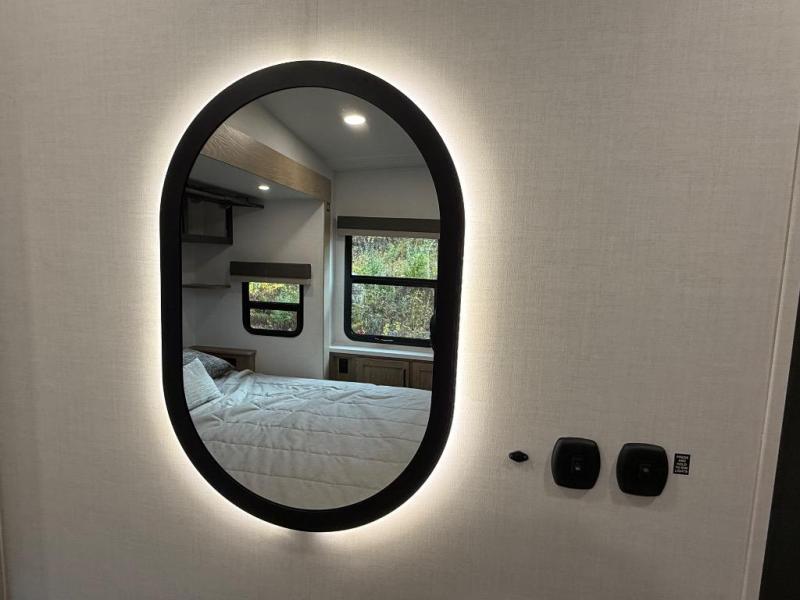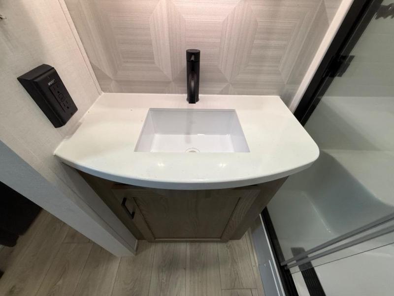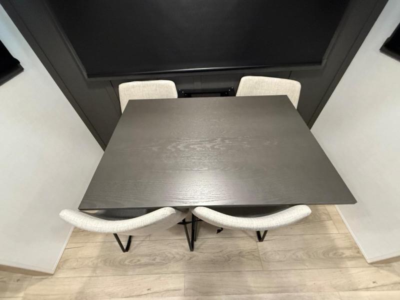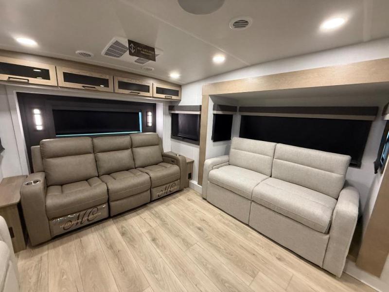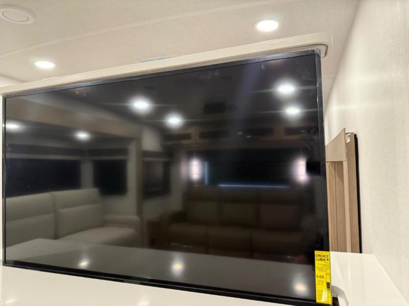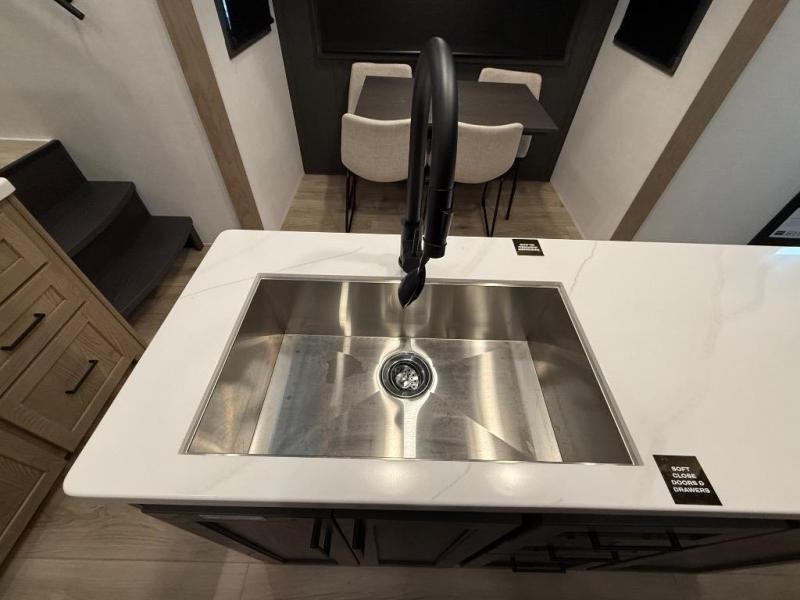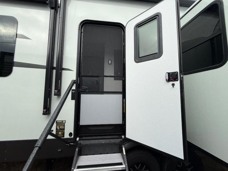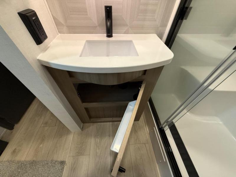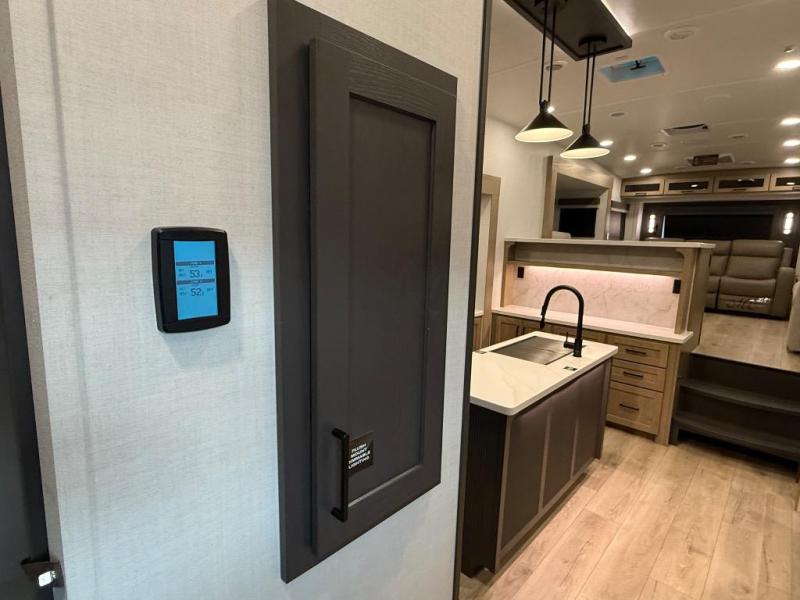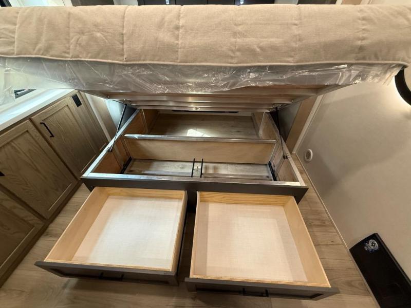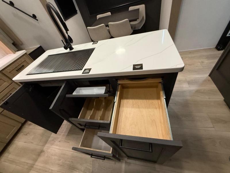 This fifth wheel is designed for comfort, connection, and relaxation on the road. The 72" x 80" king bed in the bedroom offers a spacious and restful retreat after a long day. Mealtime is a time to gather, and the rotating table with chairs creates the perfect setting to sit down, share stories, and reflect on the day’s adventures. For more laid-back evenings, the front living area features a Televator TV, turning the space into a cozy home theater for movie nights with the whole crew. When it’s time to wind down, two 68" hide-a-beds provide additional sleeping space, ensuring everyone has a comfortable place to rest.