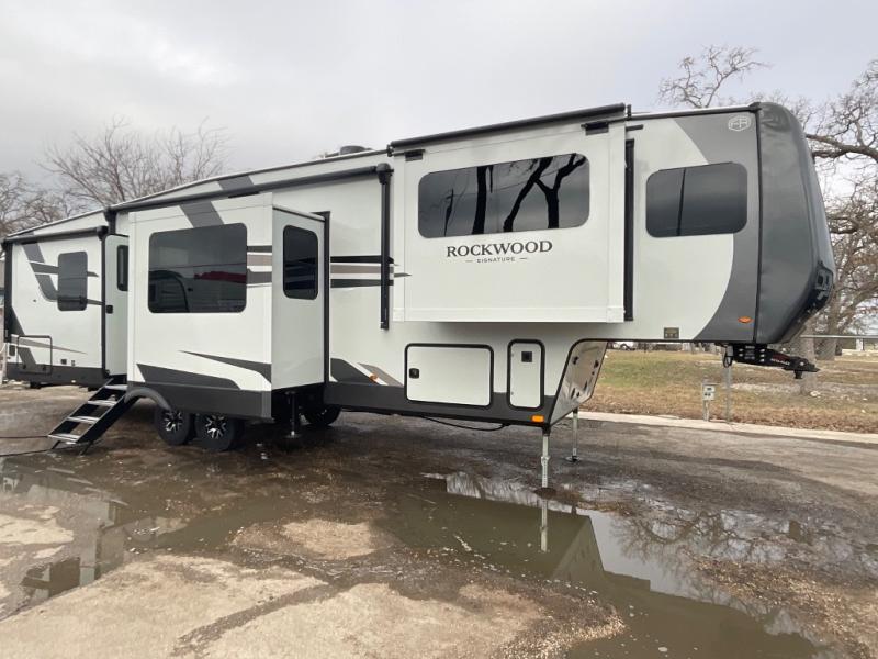 With any Rockwood Signature fifth wheel or travel trailer by Forest River RV, you will enjoy superior construction that includes a fully laminated walkable roof, 6-sided full-aluminum frame, and a painted fiberglass front cap with Clear Coat for added durability. Outside, you'll find a 200W solar panel for off-grid capabilities, slam baggage doors, and Key-Alike lock system for added convenience. Head inside to find soft close roller bearing drawers, roller shades, and residential style gas range. These travel trailer and fifth wheels also feature Goodyear Endurance tires with a tire pressure monitoring system plus Dexter Torflex torsion axles for smooth towing!