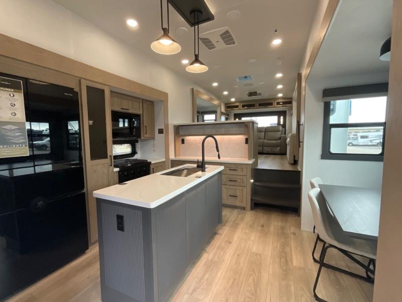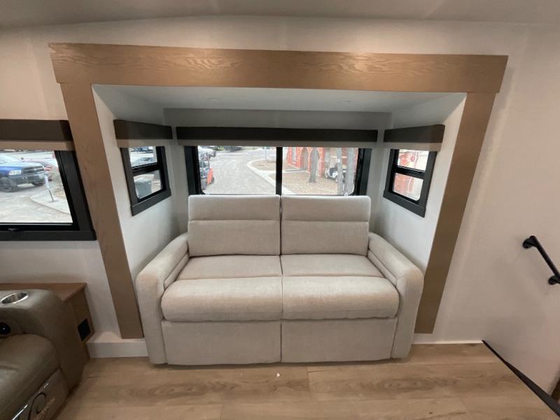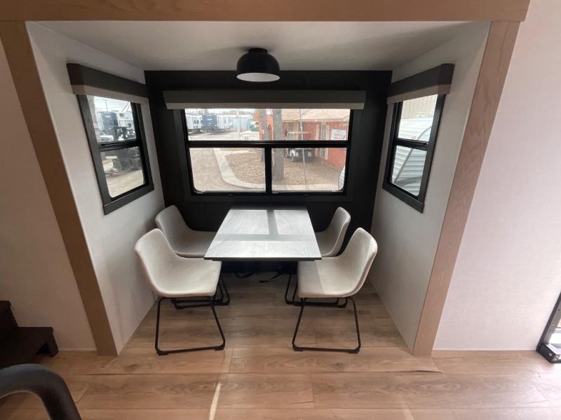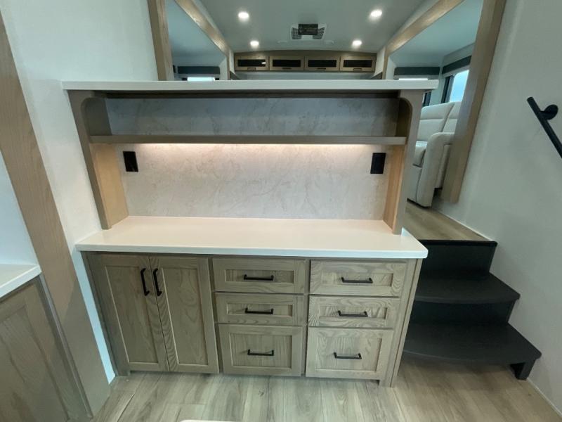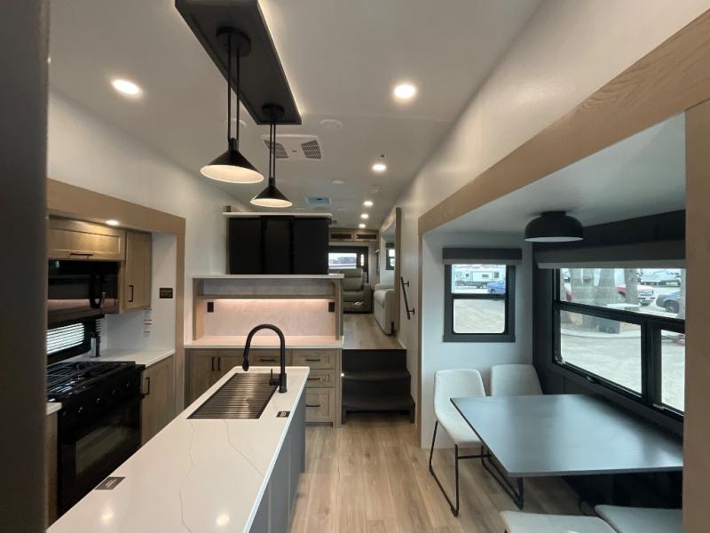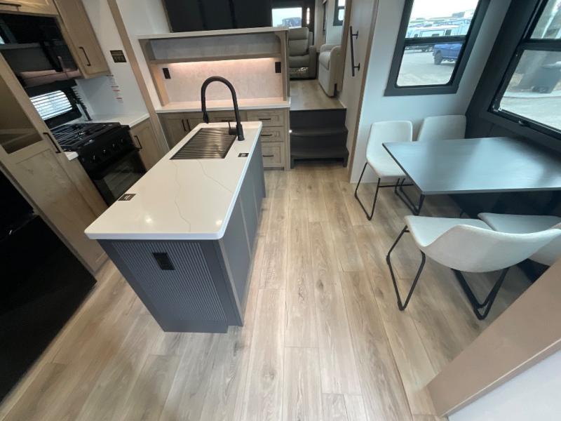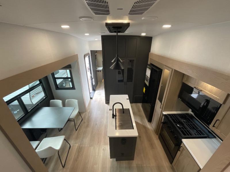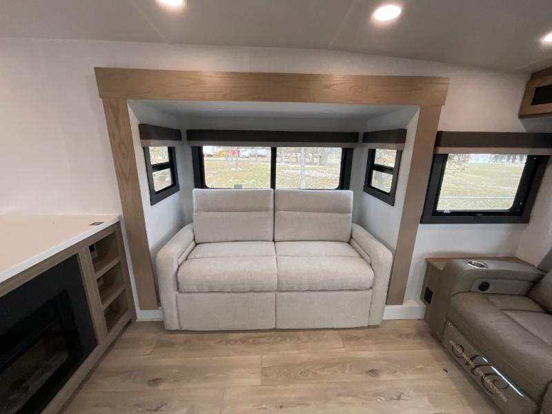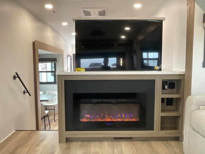 This fifth wheel is designed for comfort, connection, and relaxation on the road. The 72" x 80" king bed in the bedroom offers a spacious and restful retreat after a long day. Mealtime is a time to gather, and the rotating table with chairs creates the perfect setting to sit down, share stories, and reflect on the day’s adventures. For more laid-back evenings, the front living area features a Televator TV, turning the space into a cozy home theater for movie nights with the whole crew. When it’s time to wind down, two 68" hide-a-beds provide additional sleeping space, ensuring everyone has a comfortable place to rest.
