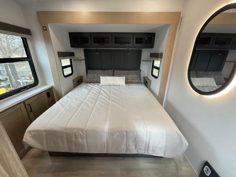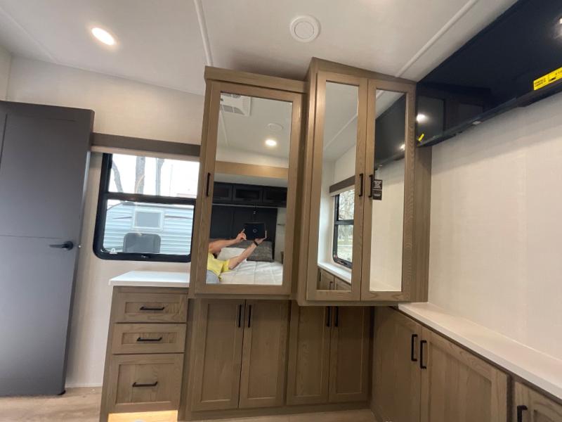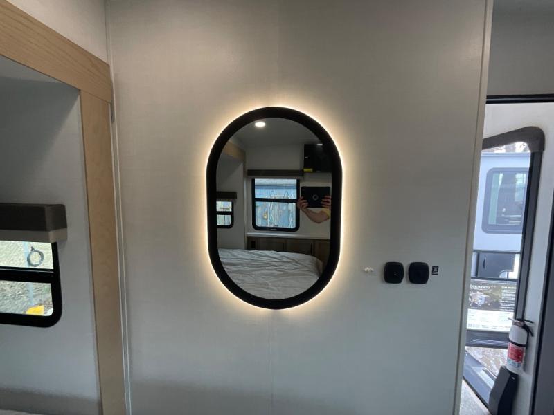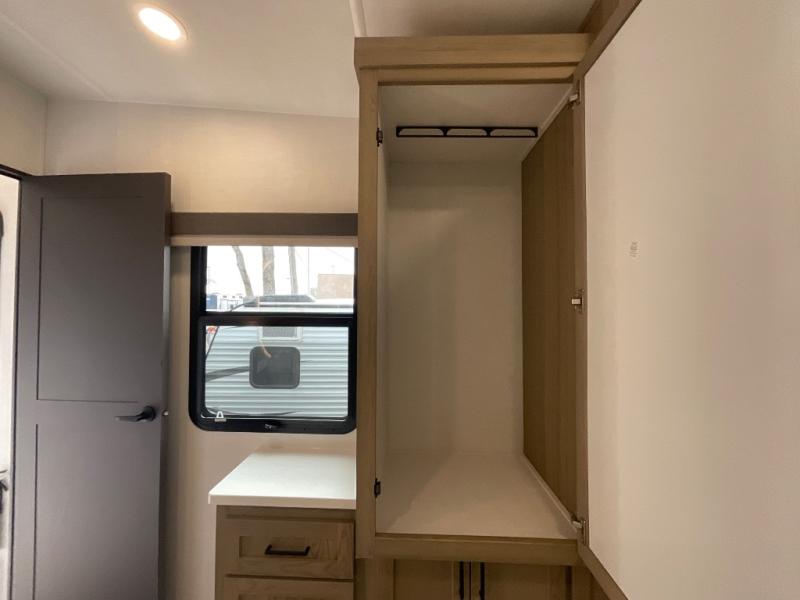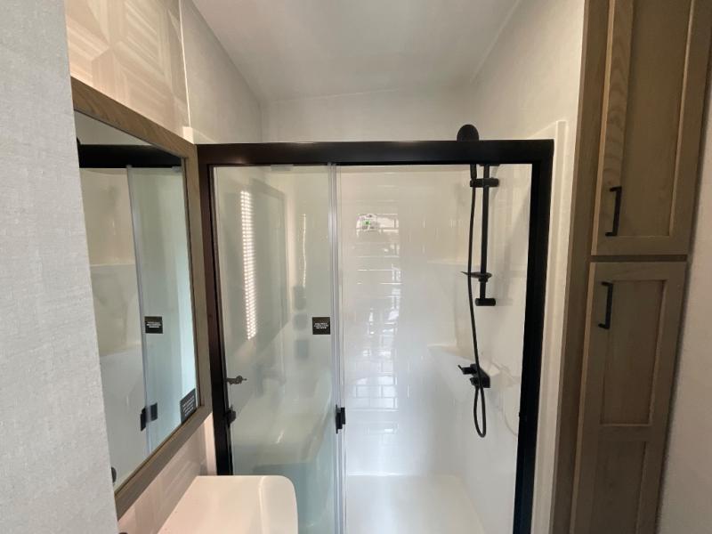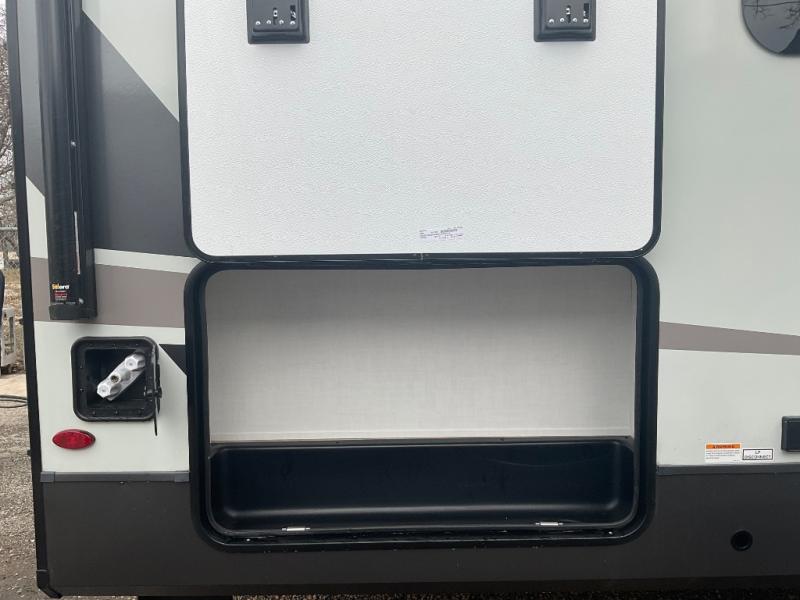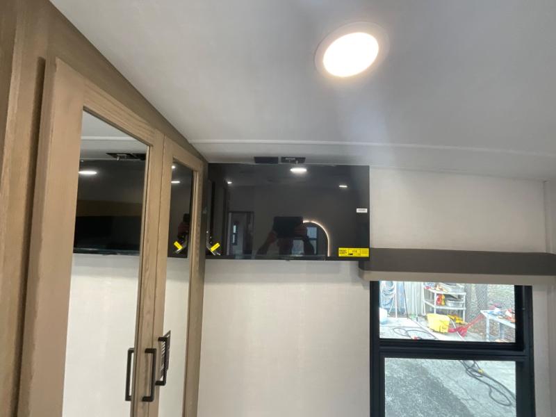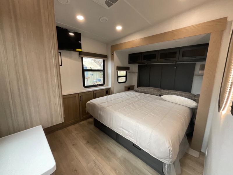 This fifth wheel is designed for comfort, connection, and relaxation on the road. The 72" x 80" king bed in the bedroom offers a spacious and restful retreat after a long day. Mealtime is a time to gather, and the rotating table with chairs creates the perfect setting to sit down, share stories, and reflect on the day’s adventures. For more laid-back evenings, the front living area features a Televator TV, turning the space into a cozy home theater for movie nights with the whole crew. When it’s time to wind down, two 68" hide-a-beds provide additional sleeping space, ensuring everyone has a comfortable place to rest.