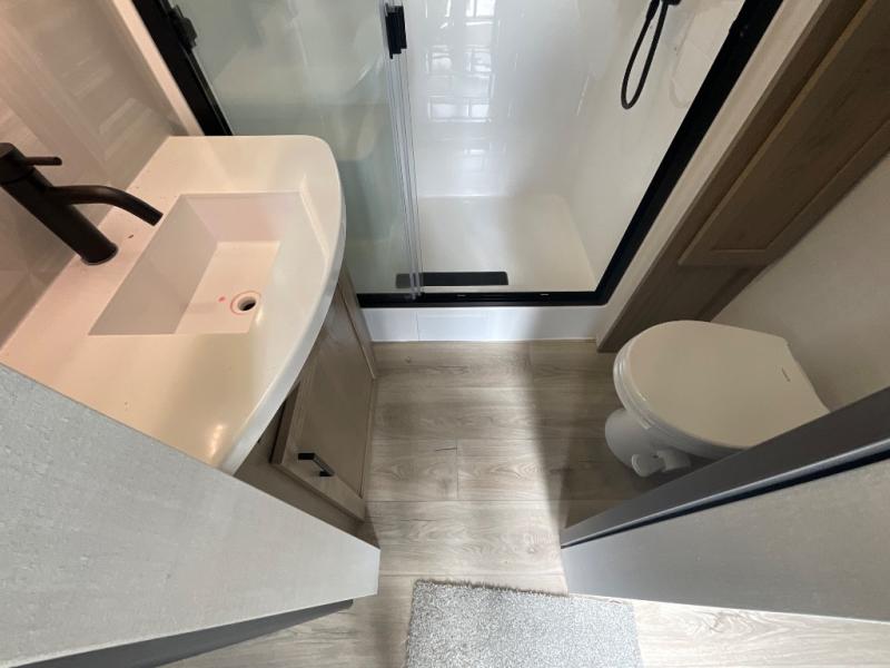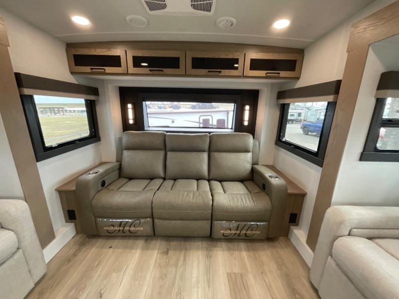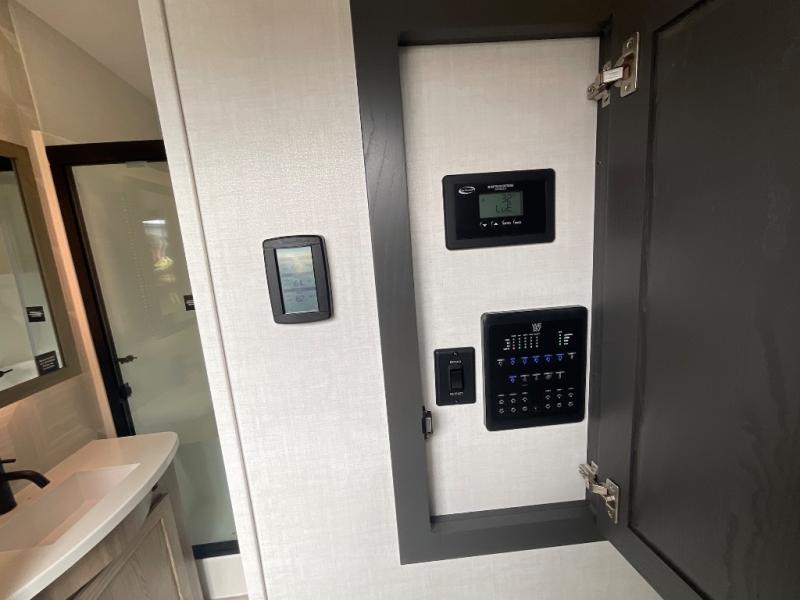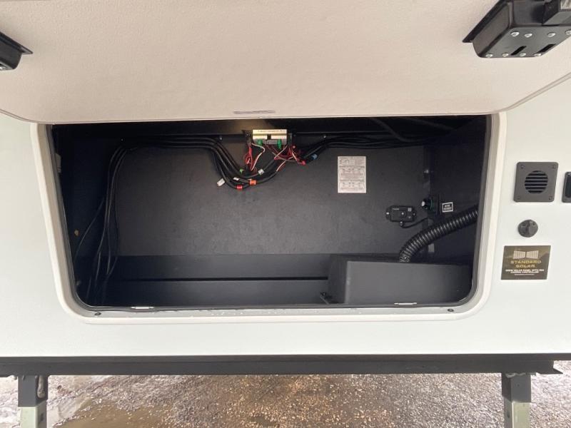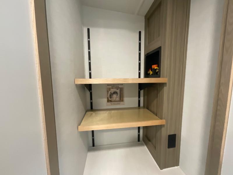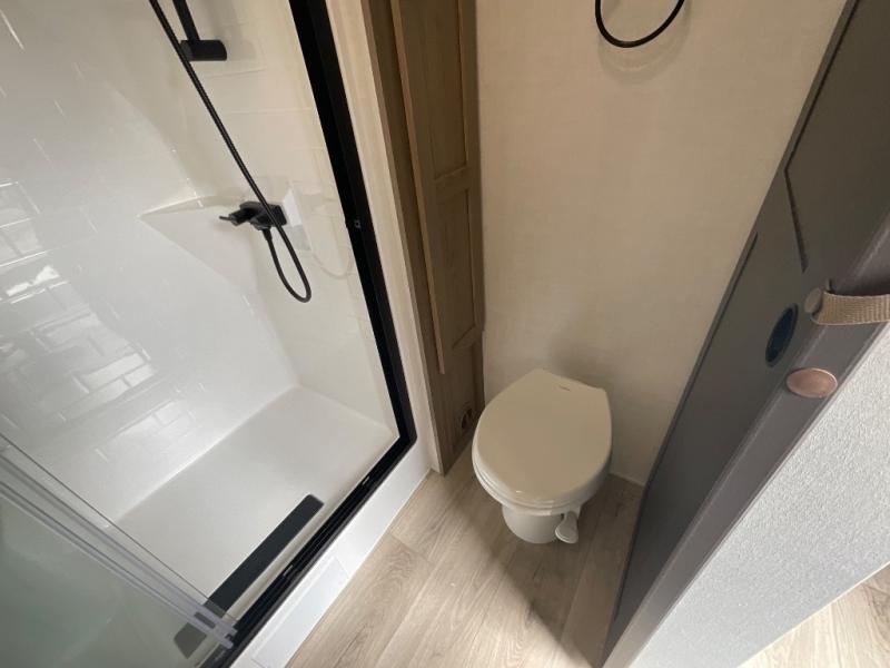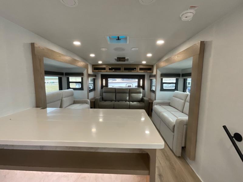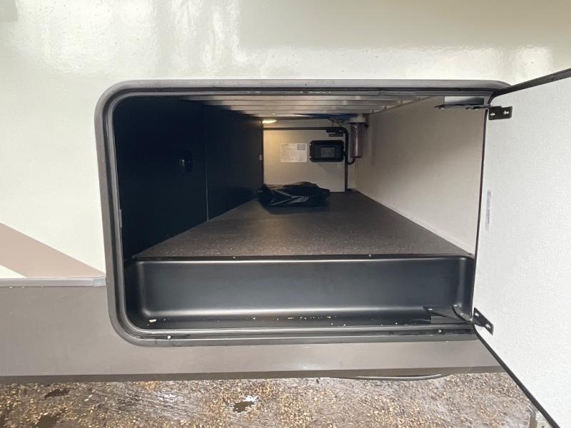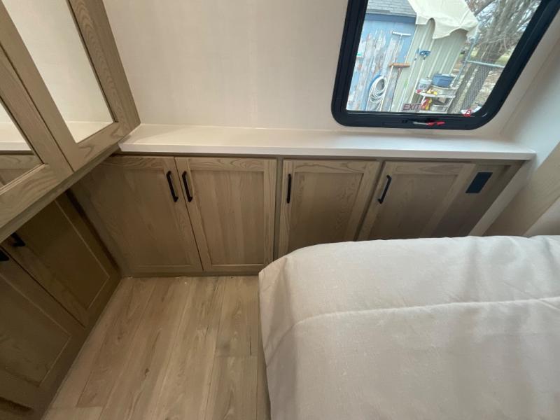 This fifth wheel is designed for comfort, connection, and relaxation on the road. The 72" x 80" king bed in the bedroom offers a spacious and restful retreat after a long day. Mealtime is a time to gather, and the rotating table with chairs creates the perfect setting to sit down, share stories, and reflect on the day’s adventures. For more laid-back evenings, the front living area features a Televator TV, turning the space into a cozy home theater for movie nights with the whole crew. When it’s time to wind down, two 68" hide-a-beds provide additional sleeping space, ensuring everyone has a comfortable place to rest.