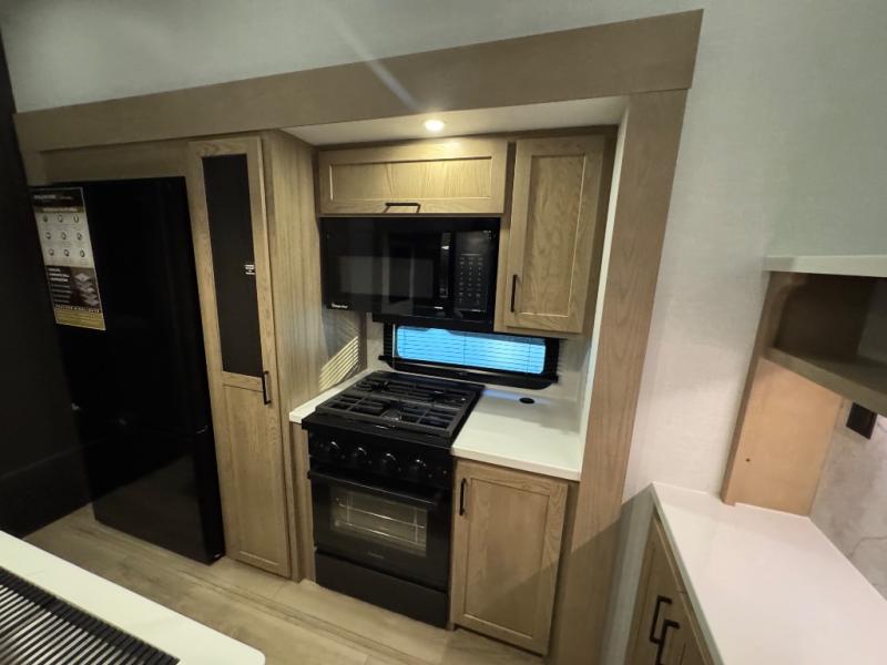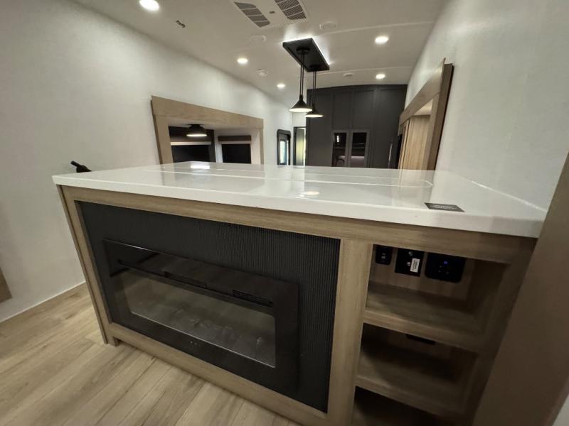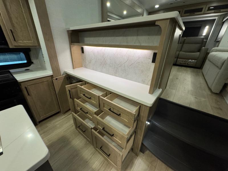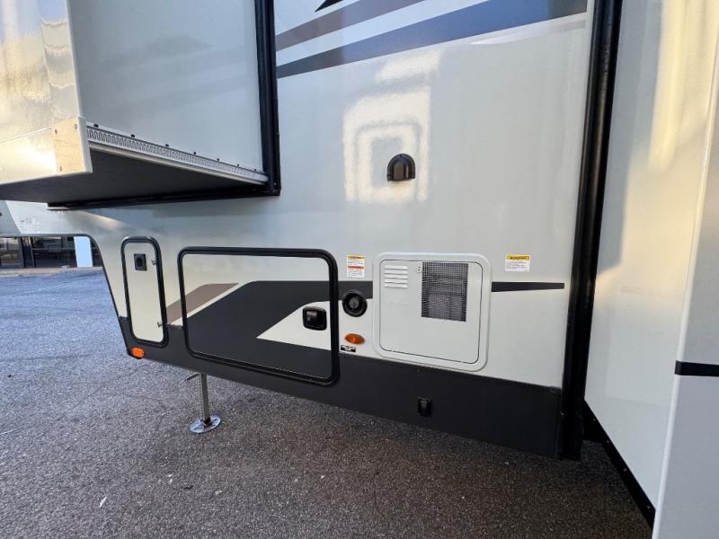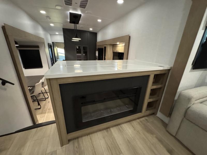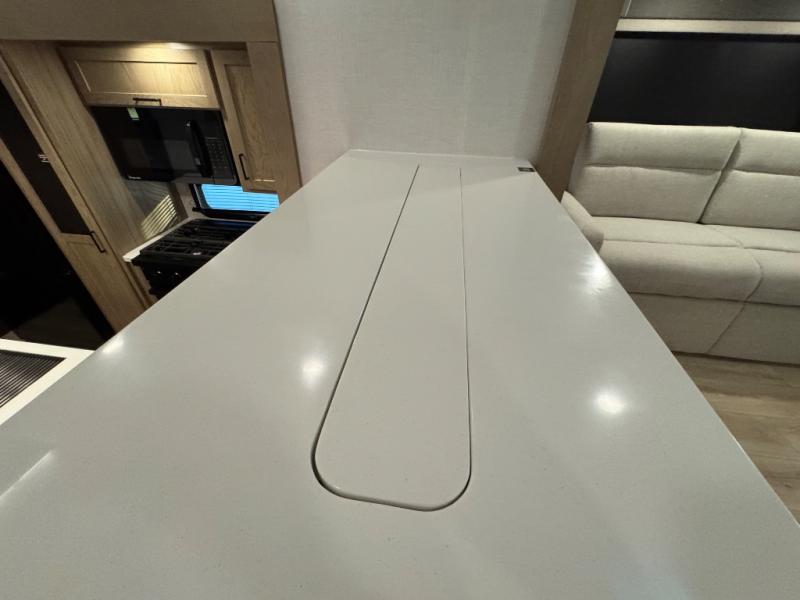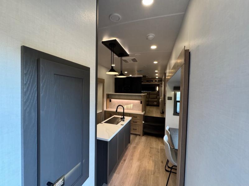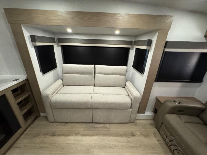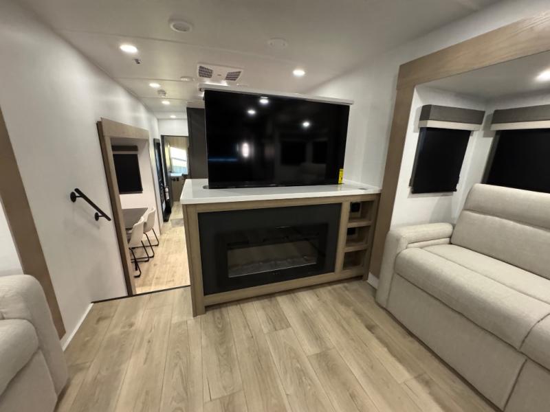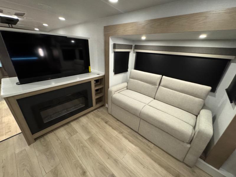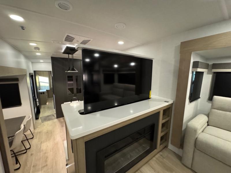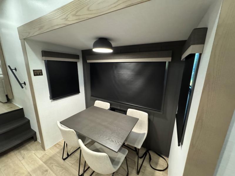 This fifth wheel is designed for comfort, connection, and relaxation on the road. The 72" x 80" king bed in the bedroom offers a spacious and restful retreat after a long day. Mealtime is a time to gather, and the rotating table with chairs creates the perfect setting to sit down, share stories, and reflect on the day’s adventures. For more laid-back evenings, the front living area features a Televator TV, turning the space into a cozy home theater for movie nights with the whole crew. When it’s time to wind down, two 68" hide-a-beds provide additional sleeping space, ensuring everyone has a comfortable place to rest.