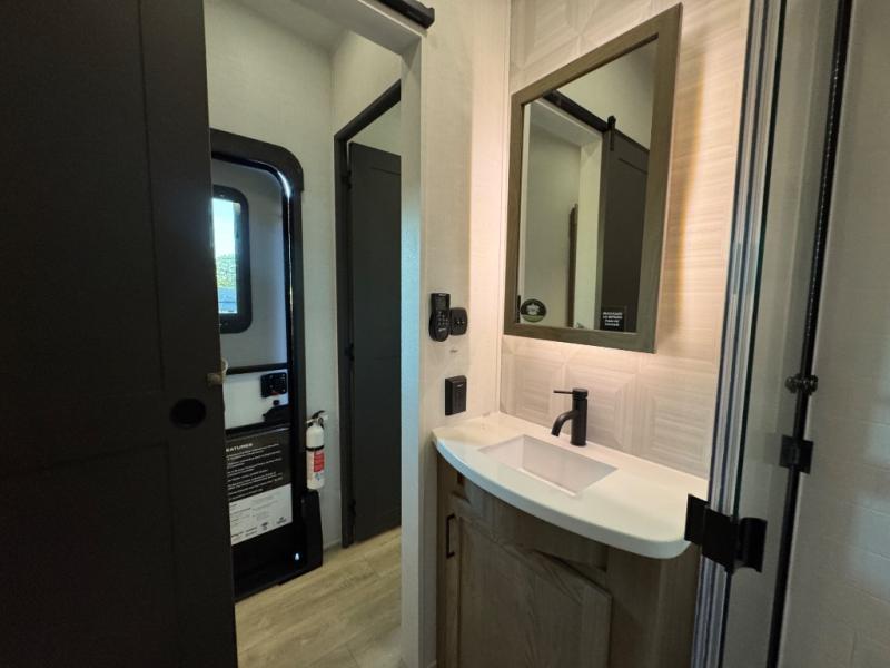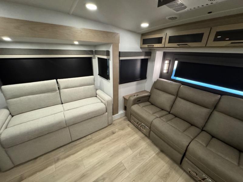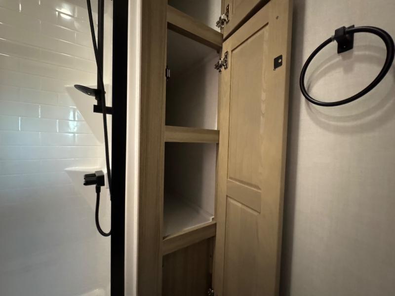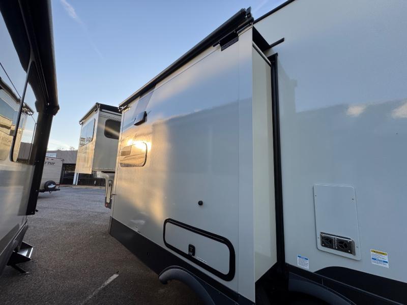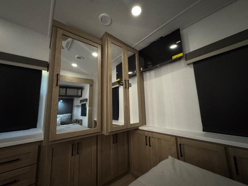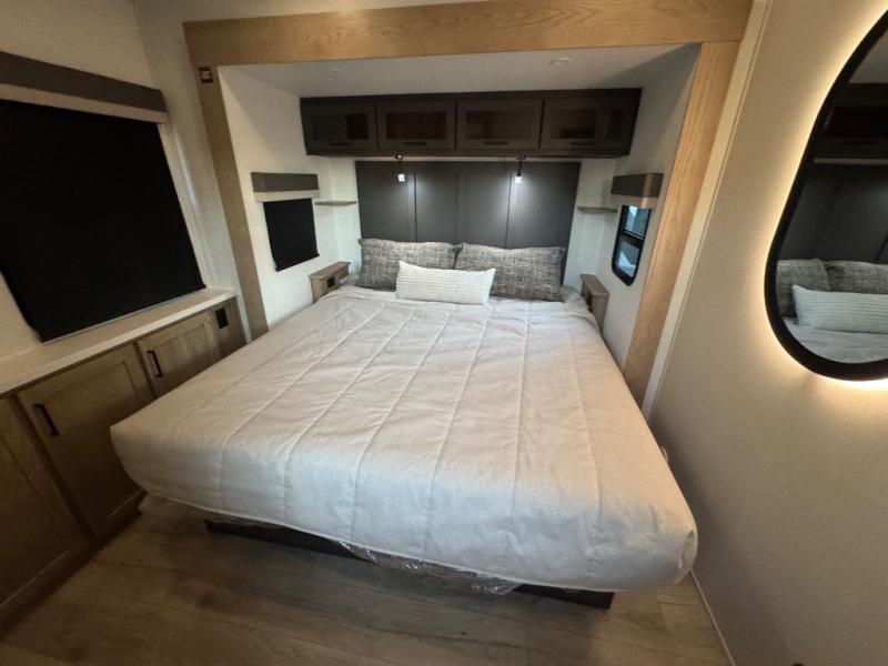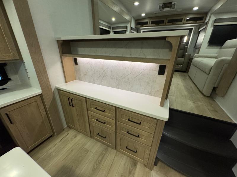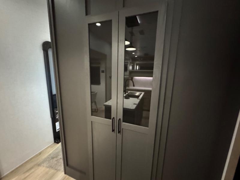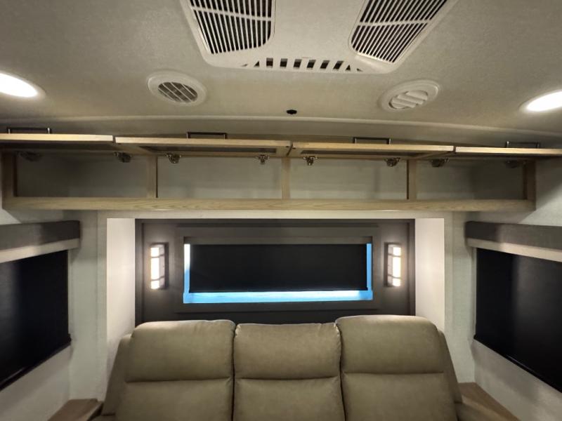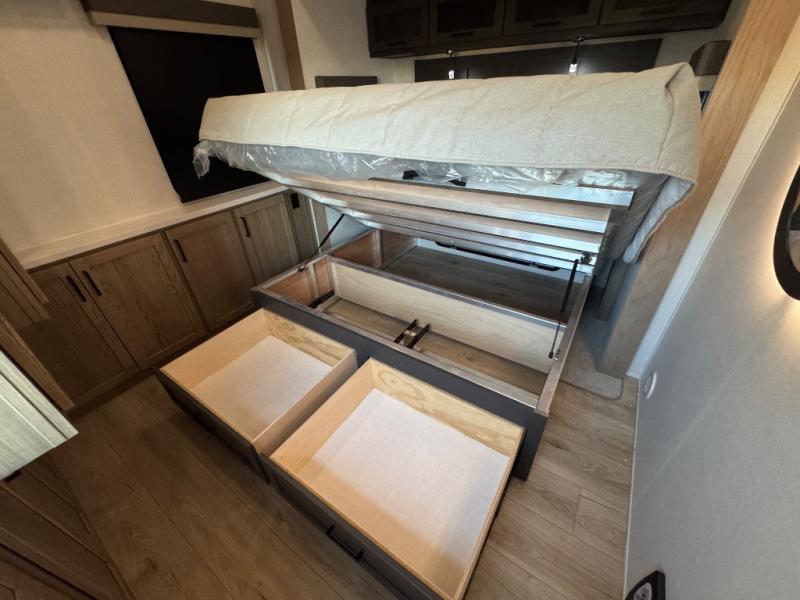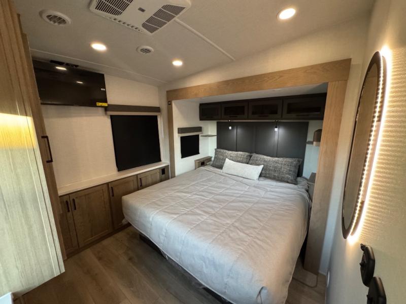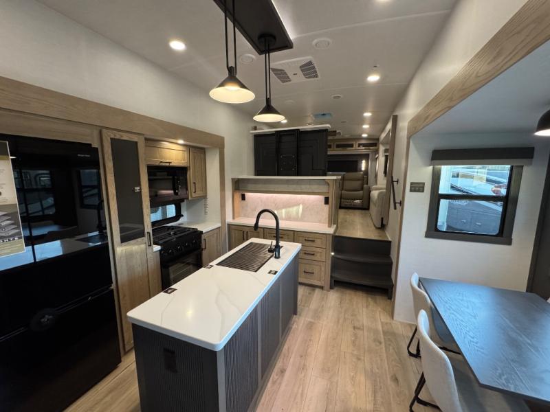 This fifth wheel is designed for comfort, connection, and relaxation on the road. The 72" x 80" king bed in the bedroom offers a spacious and restful retreat after a long day. Mealtime is a time to gather, and the rotating table with chairs creates the perfect setting to sit down, share stories, and reflect on the day’s adventures. For more laid-back evenings, the front living area features a Televator TV, turning the space into a cozy home theater for movie nights with the whole crew. When it’s time to wind down, two 68" hide-a-beds provide additional sleeping space, ensuring everyone has a comfortable place to rest.