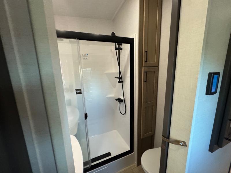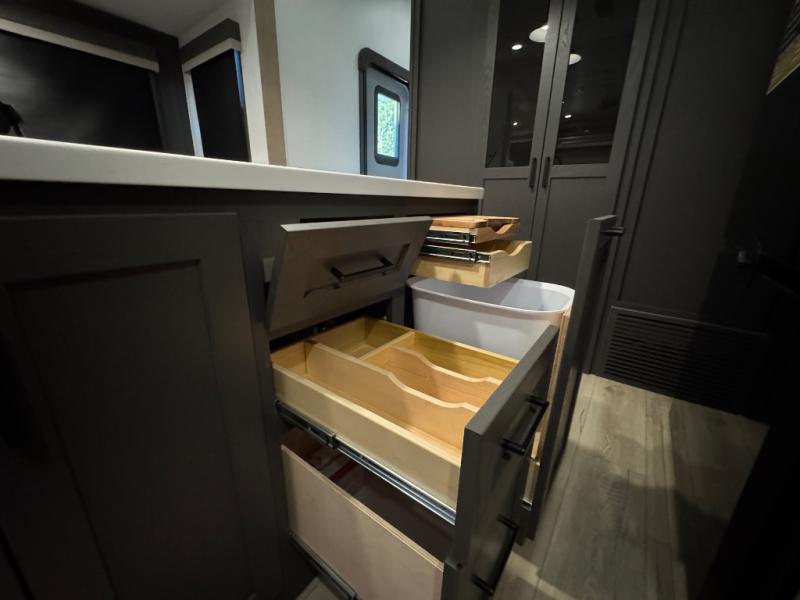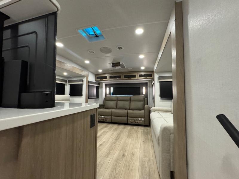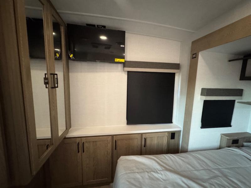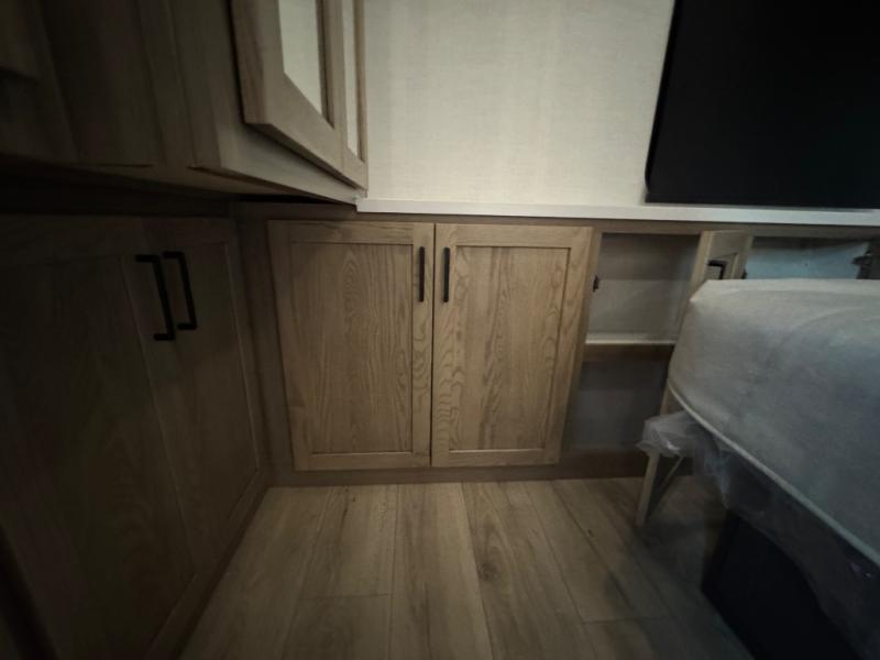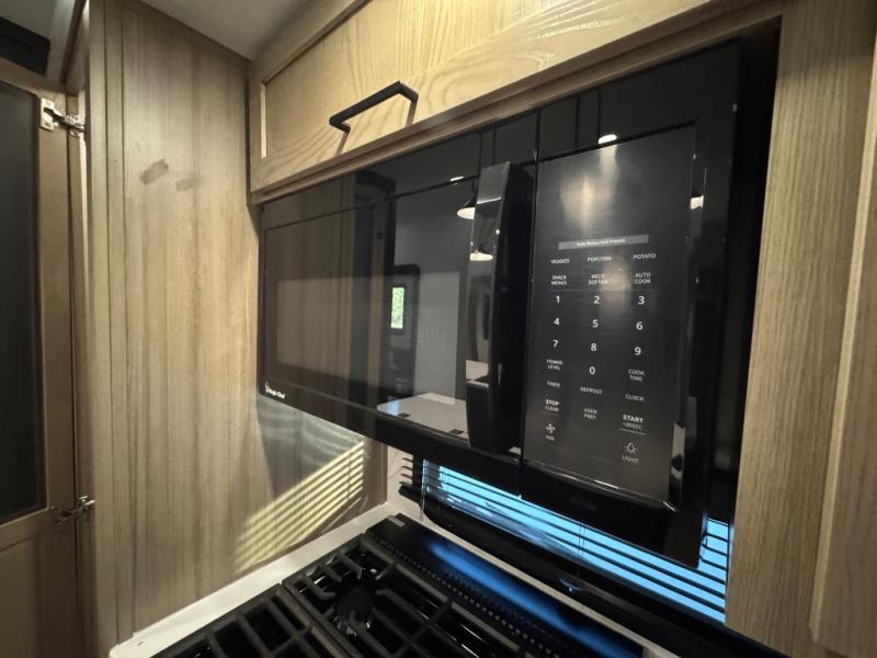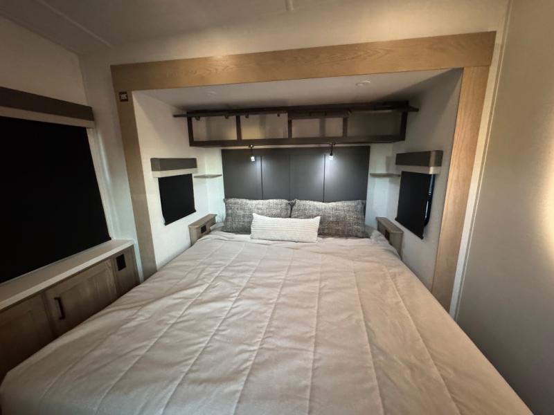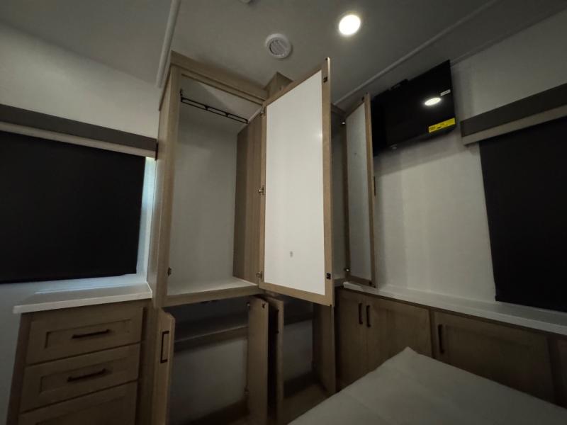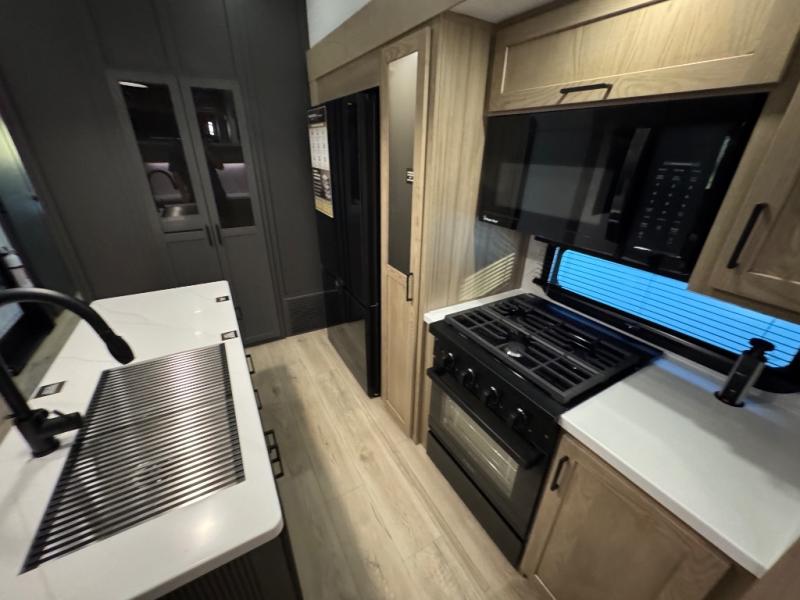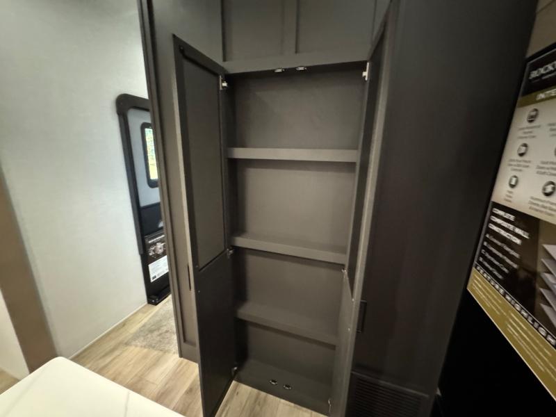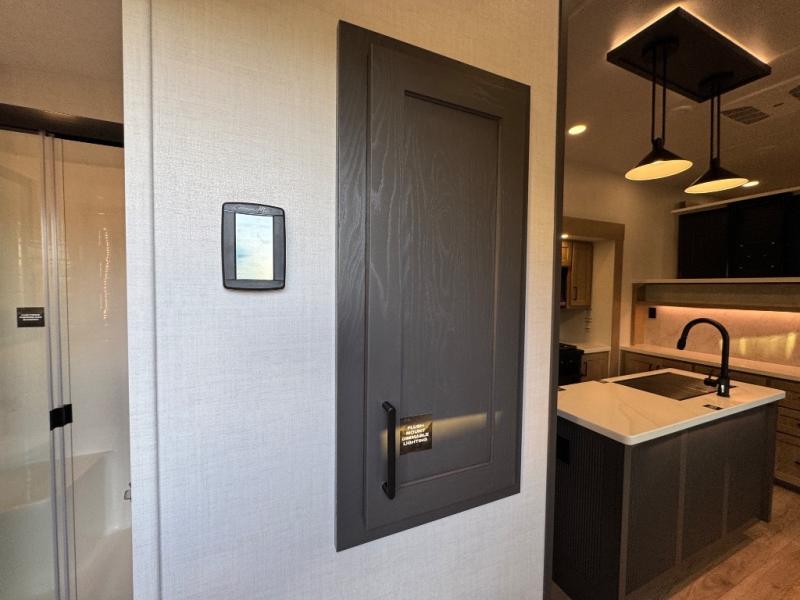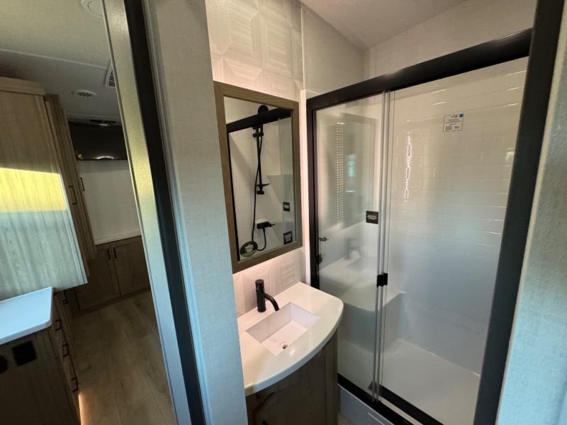 This fifth wheel is designed for comfort, connection, and relaxation on the road. The 72" x 80" king bed in the bedroom offers a spacious and restful retreat after a long day. Mealtime is a time to gather, and the rotating table with chairs creates the perfect setting to sit down, share stories, and reflect on the day’s adventures. For more laid-back evenings, the front living area features a Televator TV, turning the space into a cozy home theater for movie nights with the whole crew. When it’s time to wind down, two 68" hide-a-beds provide additional sleeping space, ensuring everyone has a comfortable place to rest.