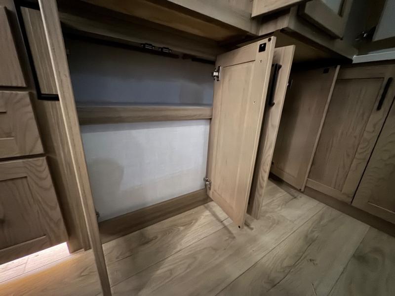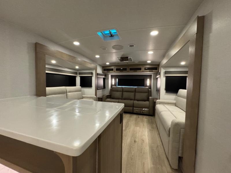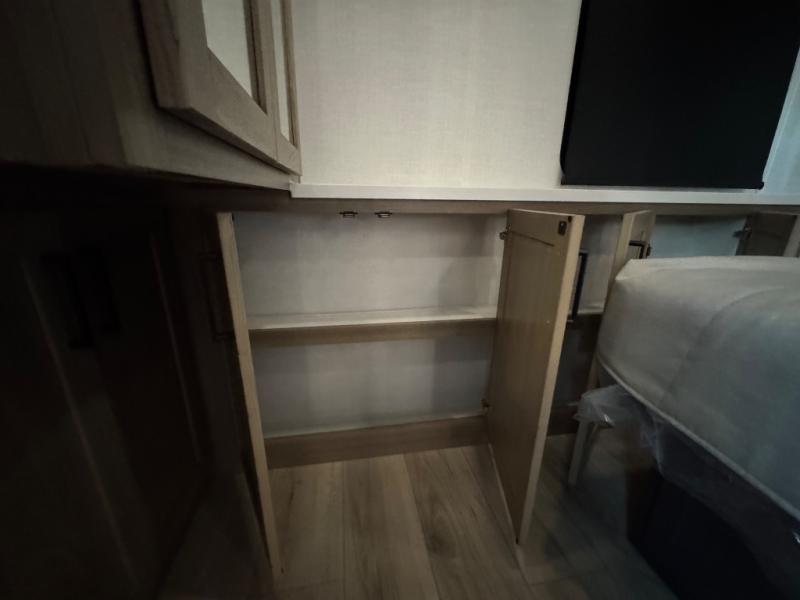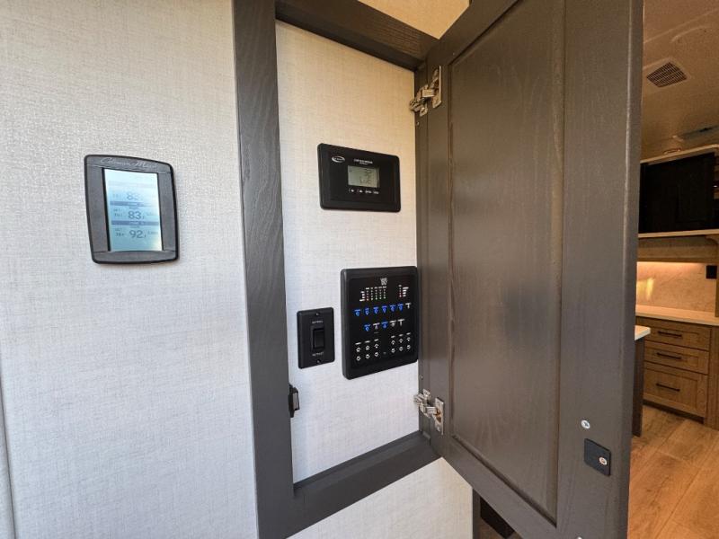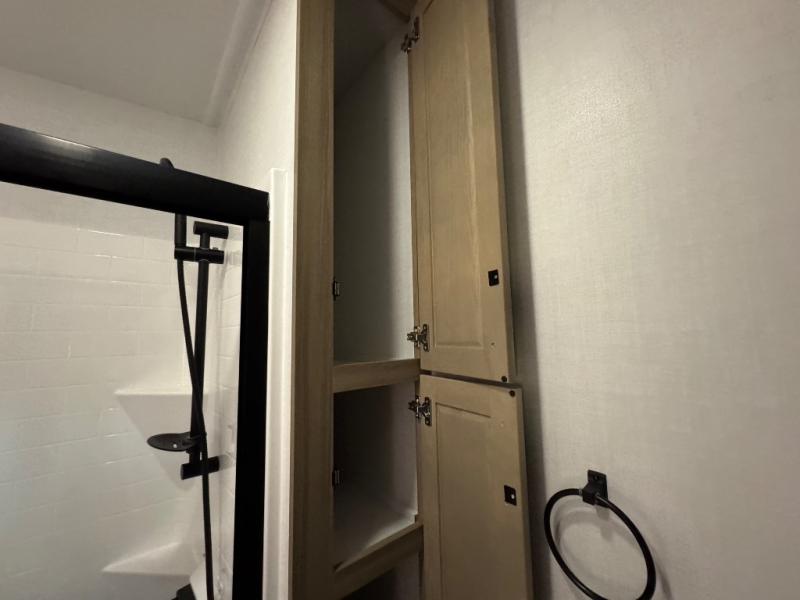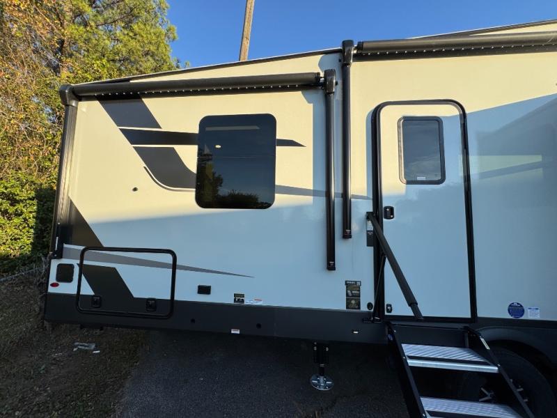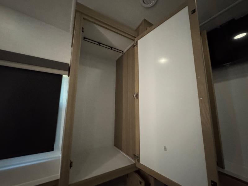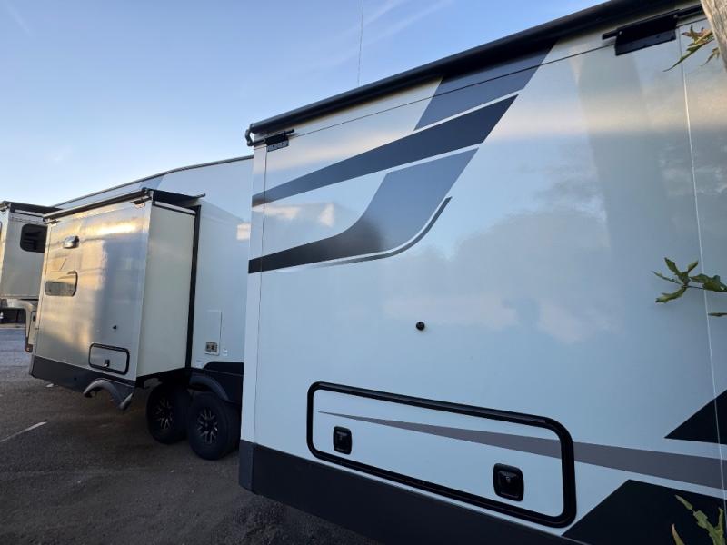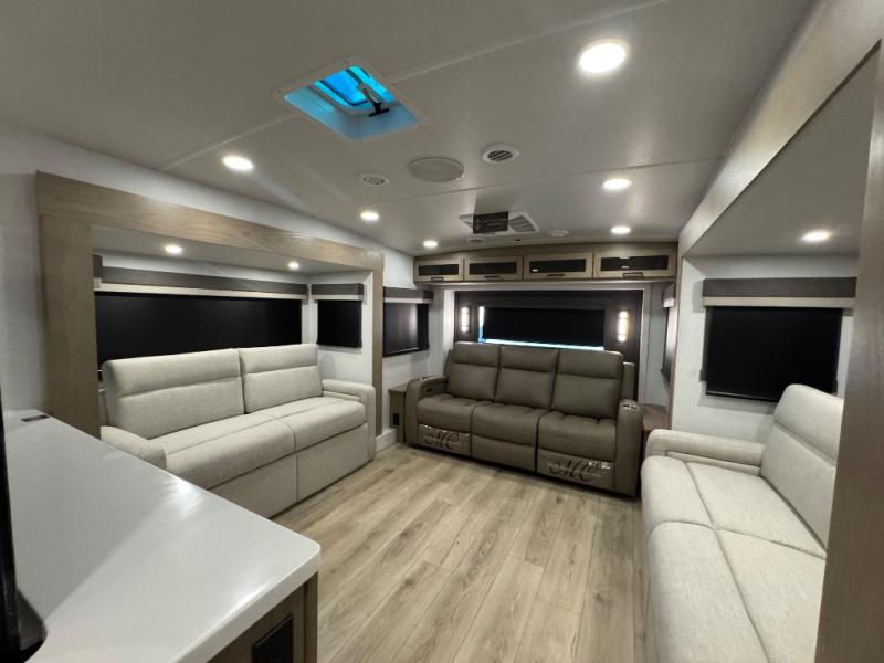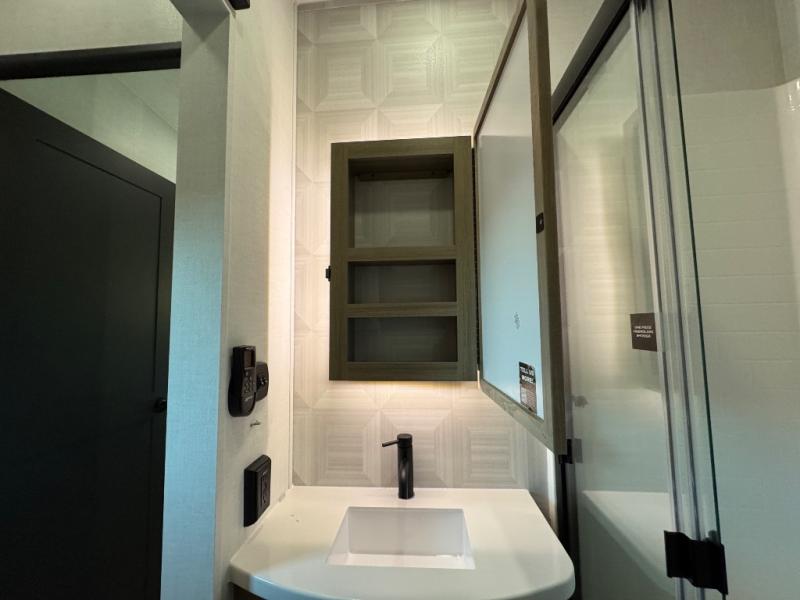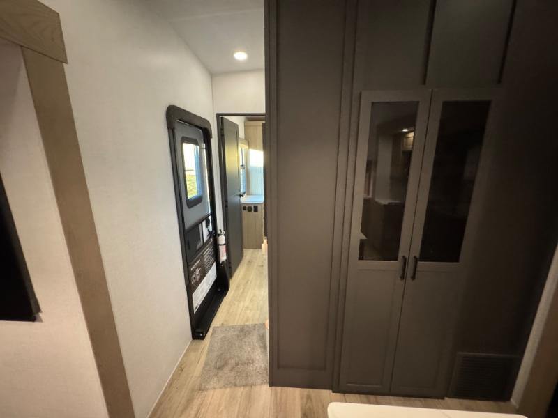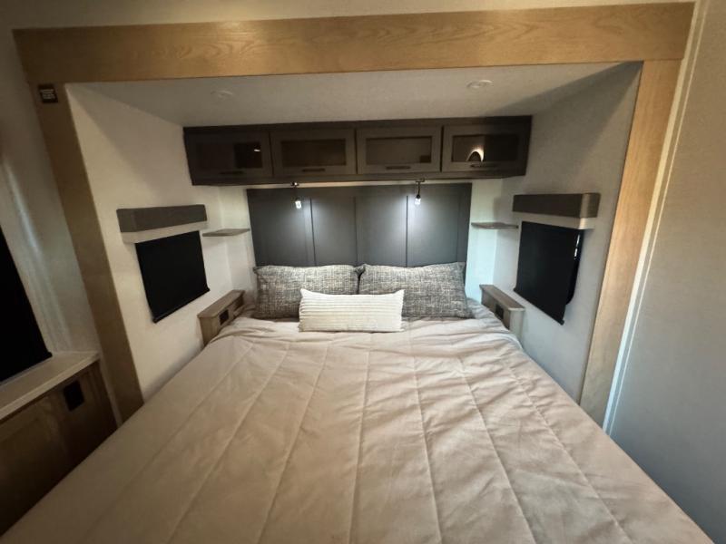 This fifth wheel is designed for comfort, connection, and relaxation on the road. The 72" x 80" king bed in the bedroom offers a spacious and restful retreat after a long day. Mealtime is a time to gather, and the rotating table with chairs creates the perfect setting to sit down, share stories, and reflect on the day’s adventures. For more laid-back evenings, the front living area features a Televator TV, turning the space into a cozy home theater for movie nights with the whole crew. When it’s time to wind down, two 68" hide-a-beds provide additional sleeping space, ensuring everyone has a comfortable place to rest.