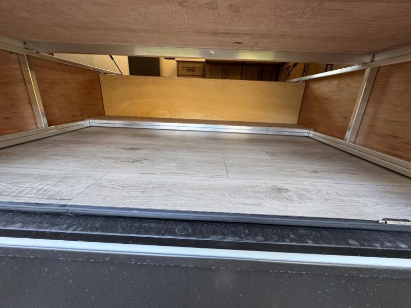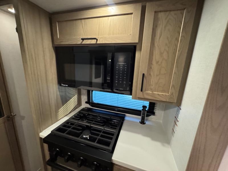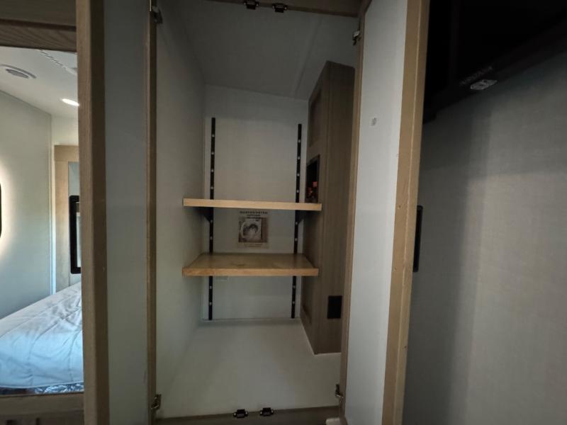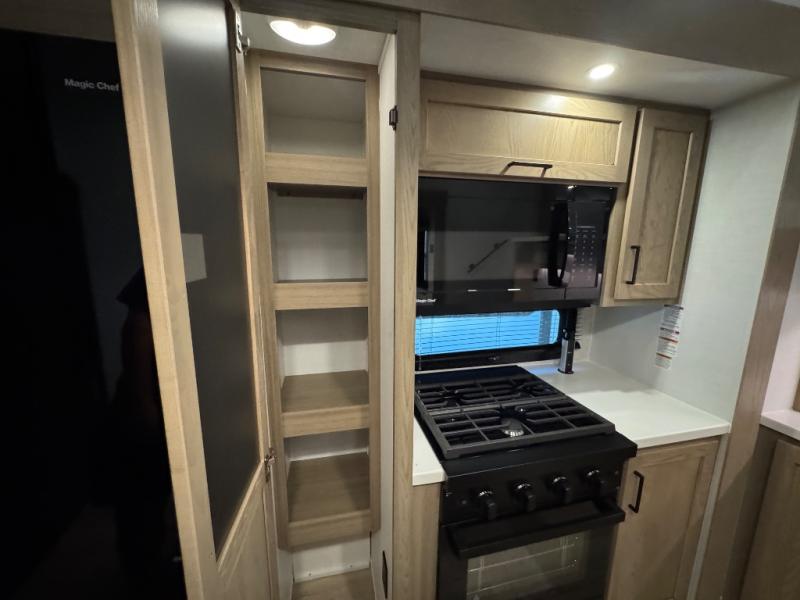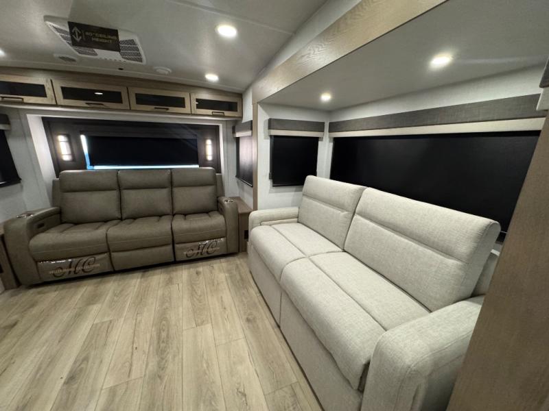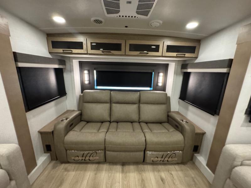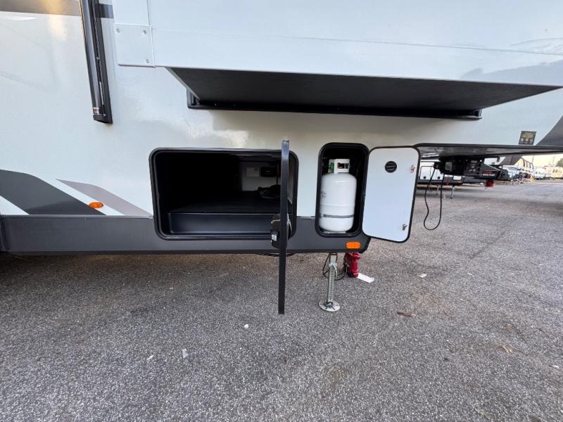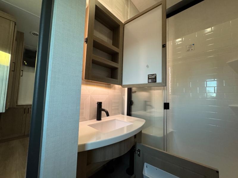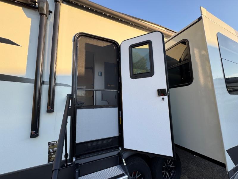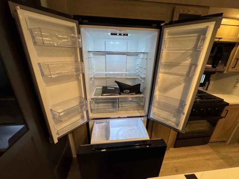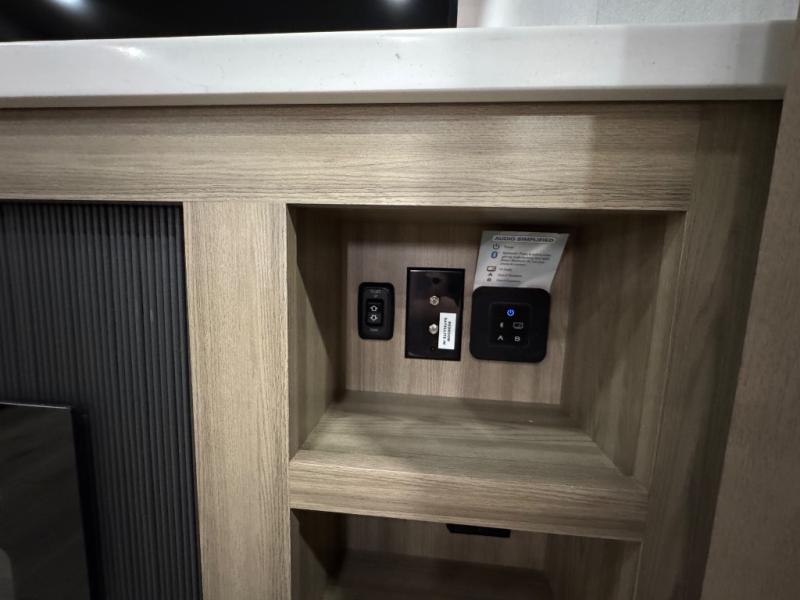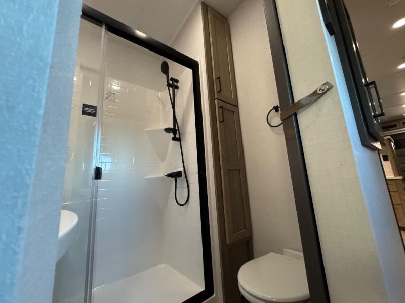 This fifth wheel is designed for comfort, connection, and relaxation on the road. The 72" x 80" king bed in the bedroom offers a spacious and restful retreat after a long day. Mealtime is a time to gather, and the rotating table with chairs creates the perfect setting to sit down, share stories, and reflect on the day’s adventures. For more laid-back evenings, the front living area features a Televator TV, turning the space into a cozy home theater for movie nights with the whole crew. When it’s time to wind down, two 68" hide-a-beds provide additional sleeping space, ensuring everyone has a comfortable place to rest.