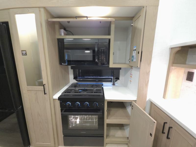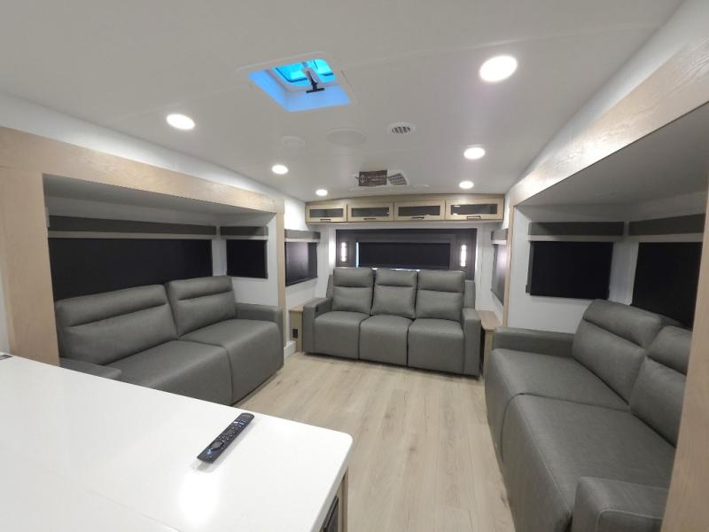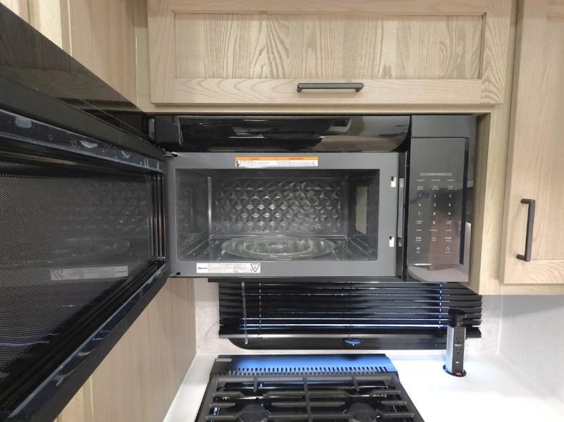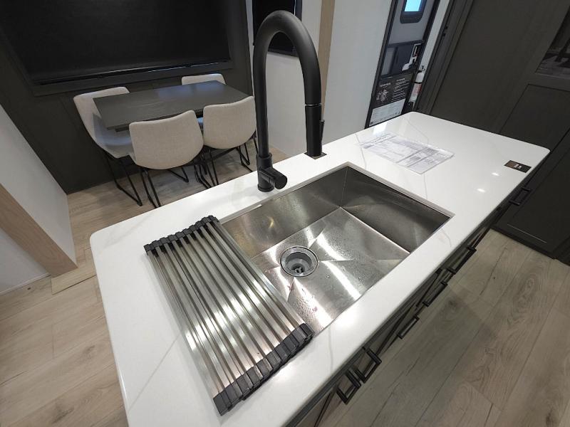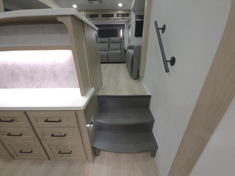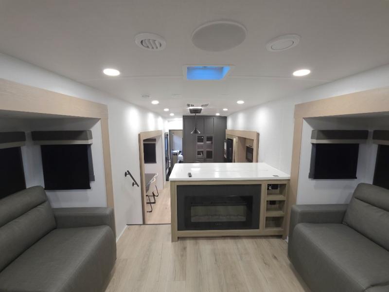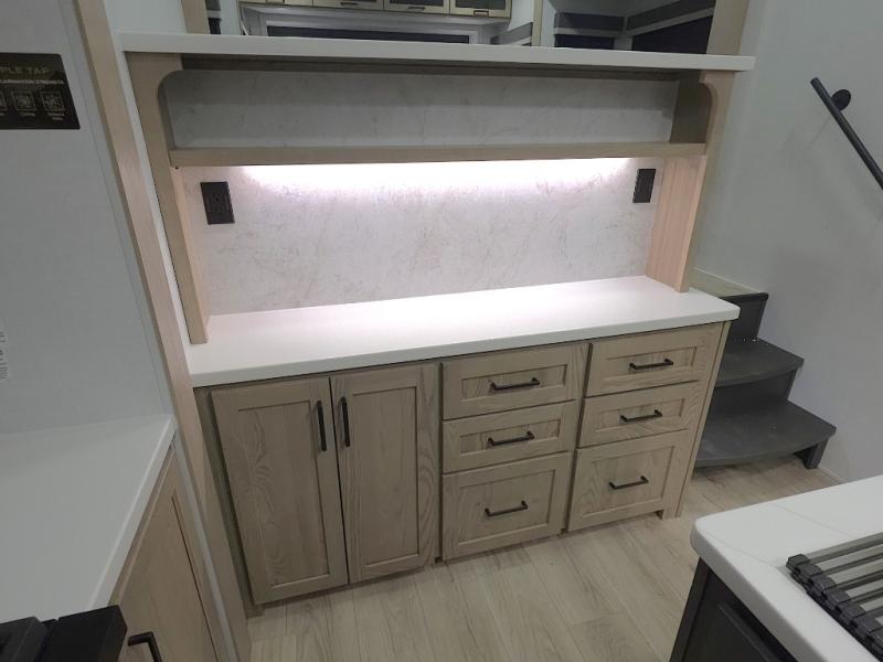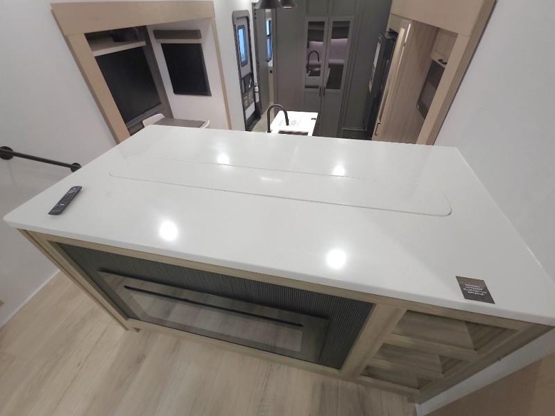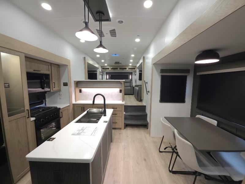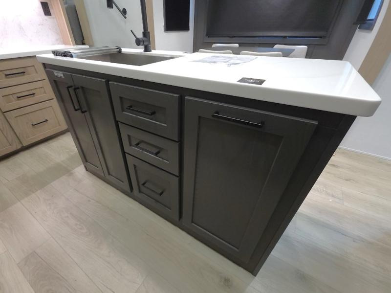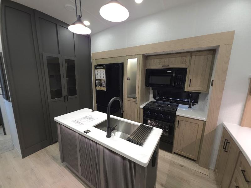 The central kitchen features a large island ideal for prepping meals, serving snacks, or gathering with loved ones. With residential style appliances and ample storage, cooking on the road has never been easier.