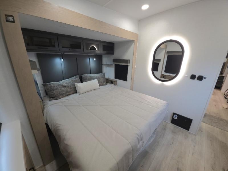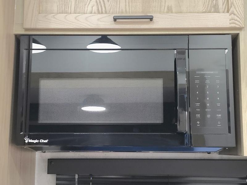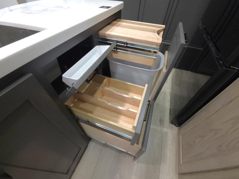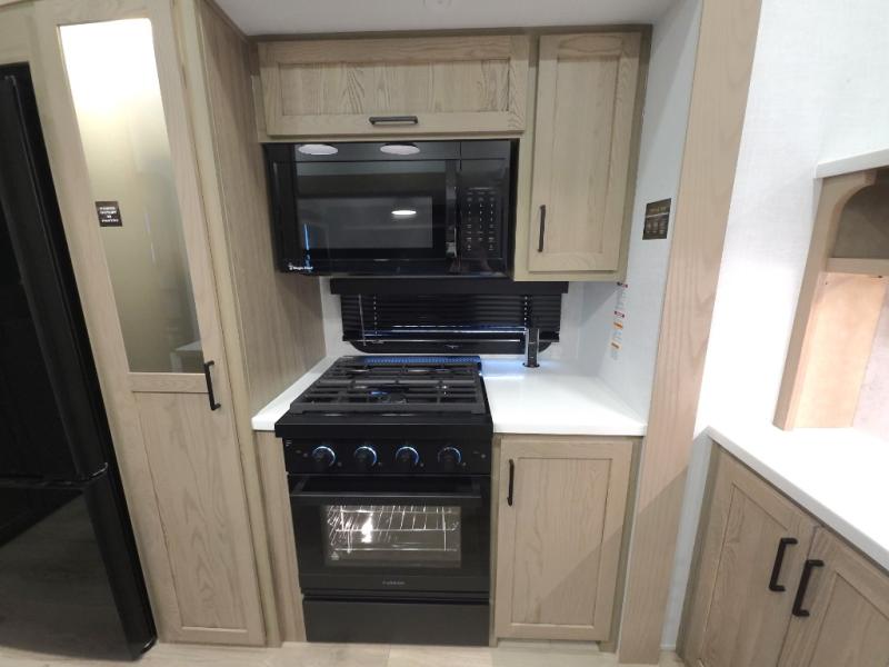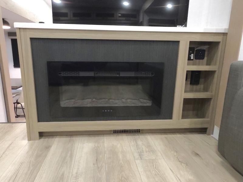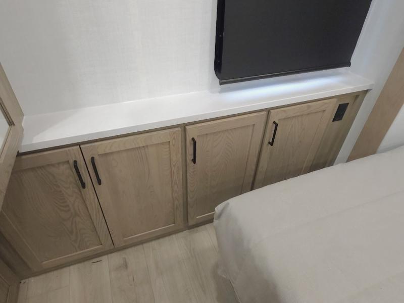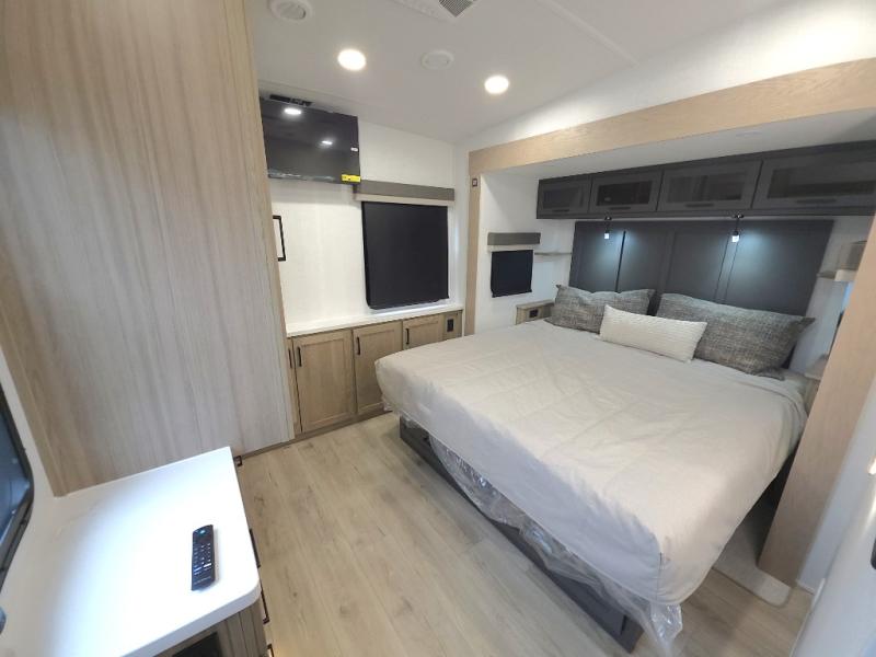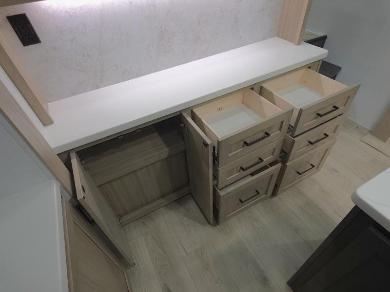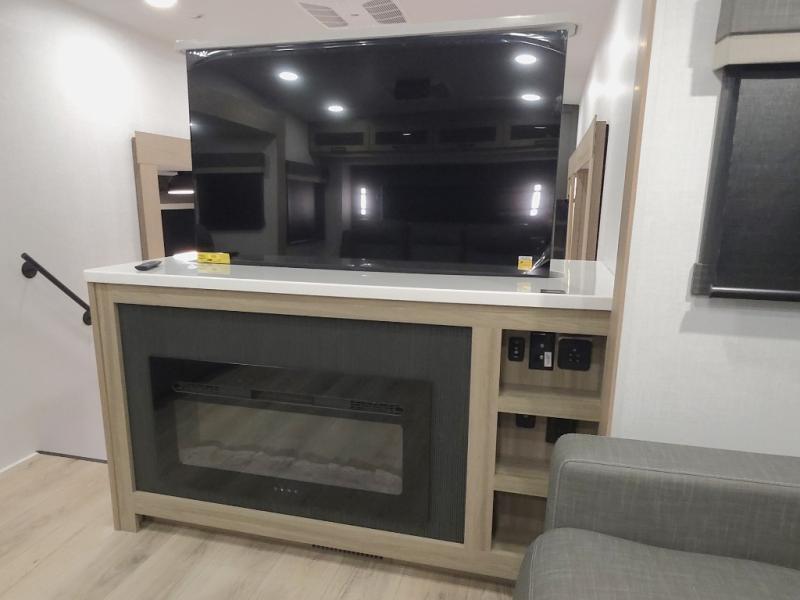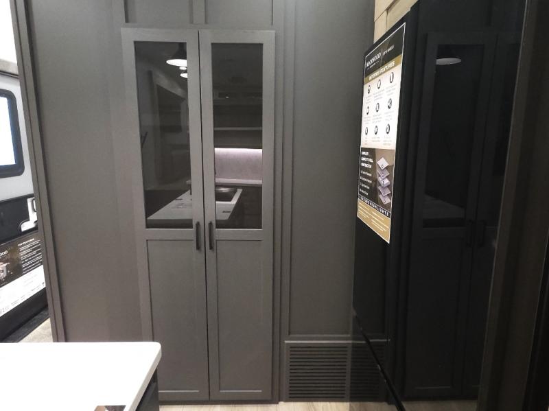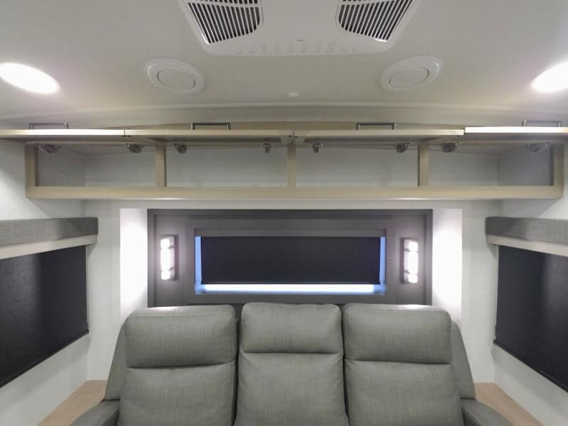 The central kitchen features a large island ideal for prepping meals, serving snacks, or gathering with loved ones. With residential style appliances and ample storage, cooking on the road has never been easier.