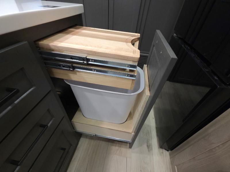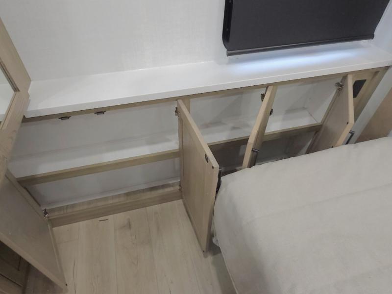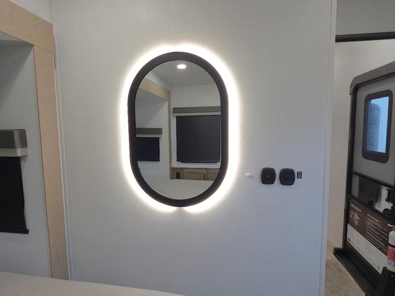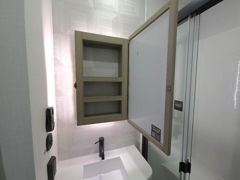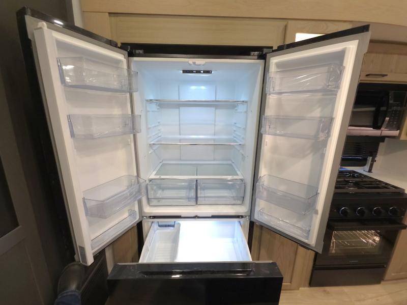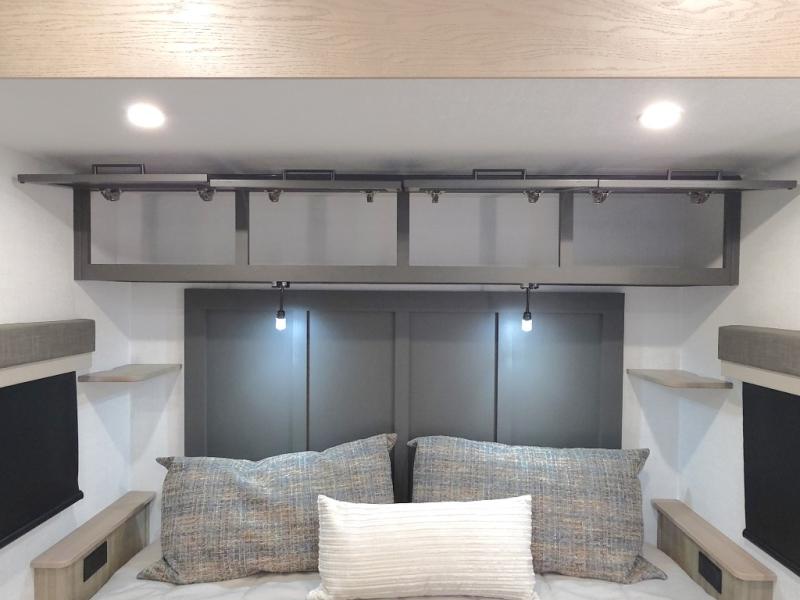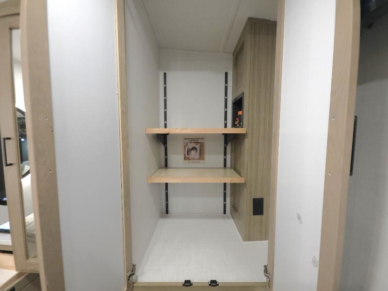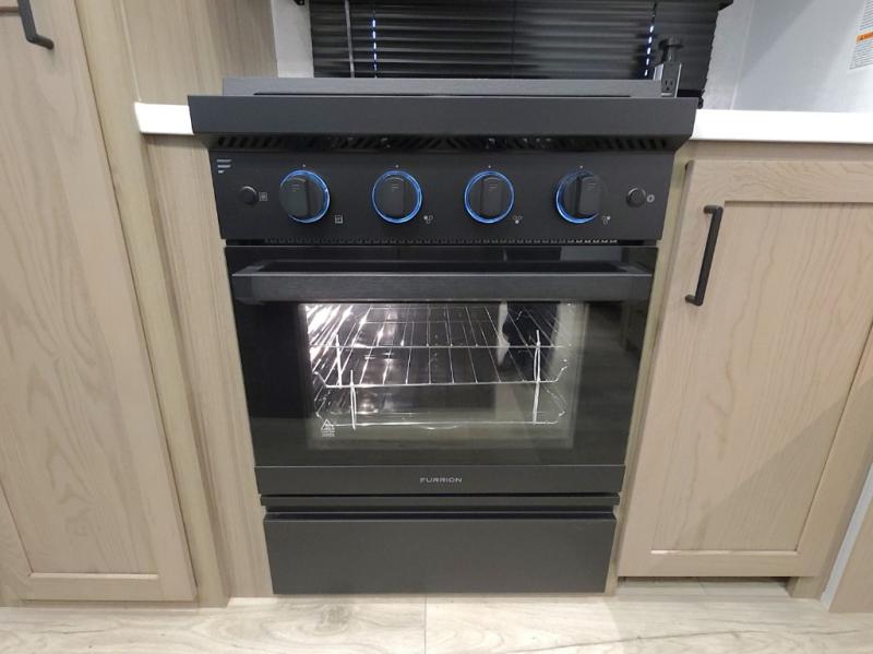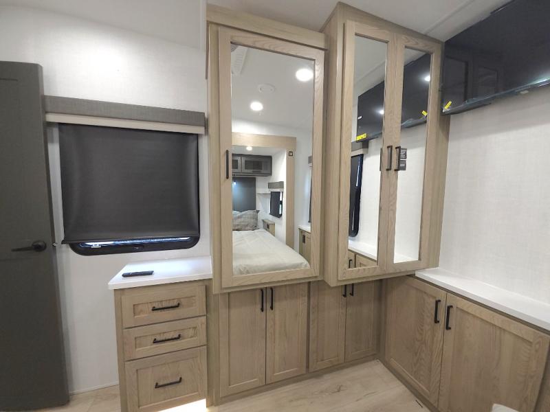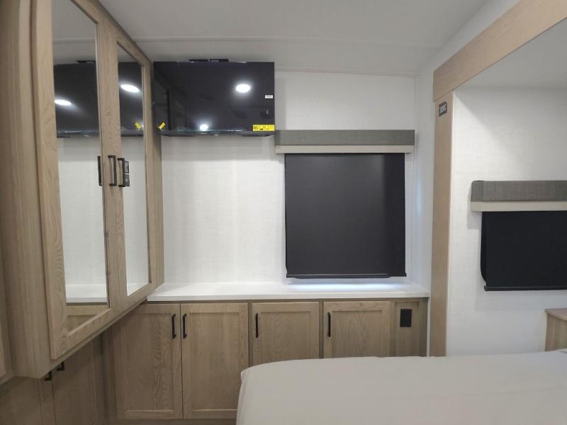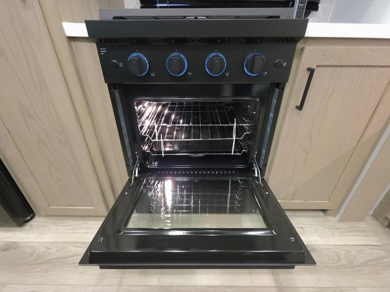The central kitchen features a large island ideal for prepping meals, serving snacks, or gathering with loved ones. With residential style appliances and ample storage, cooking on the road has never been easier.