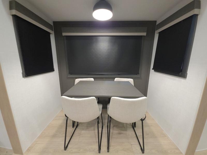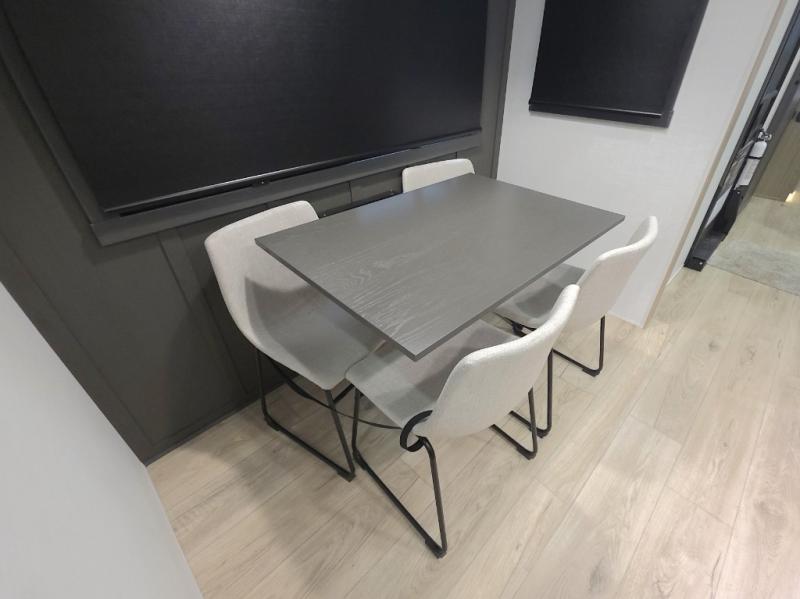 The rotating dinette table with chairs creates a comfortable place to eat, play games, or recap the day's adventures.