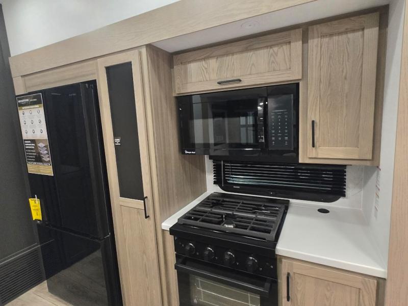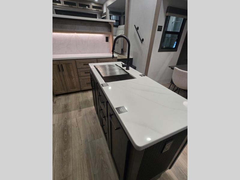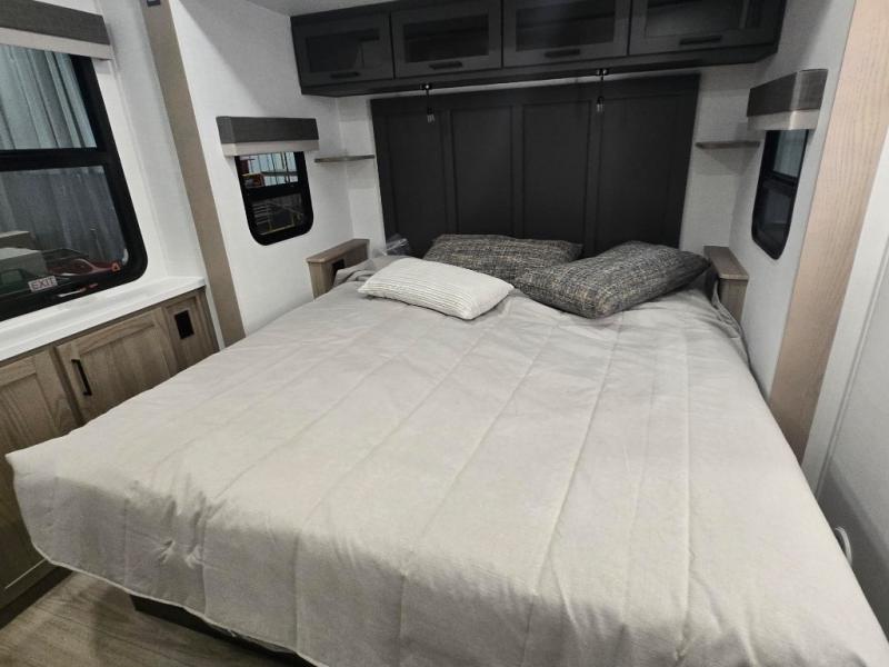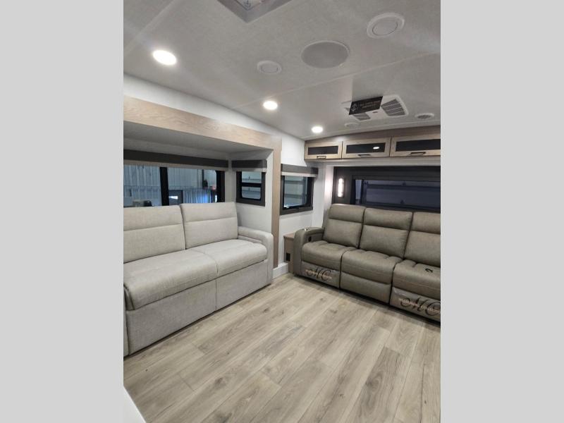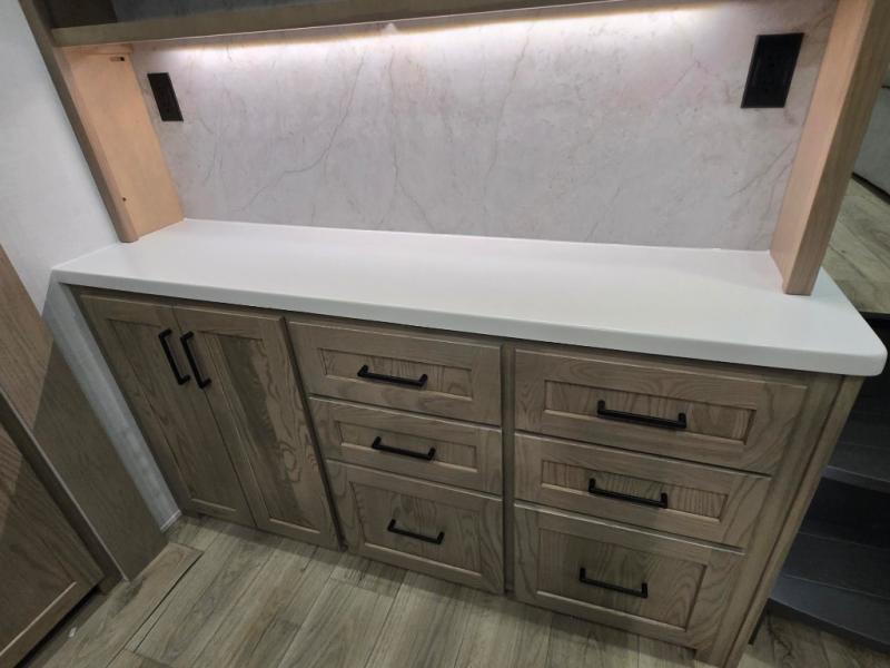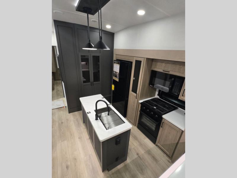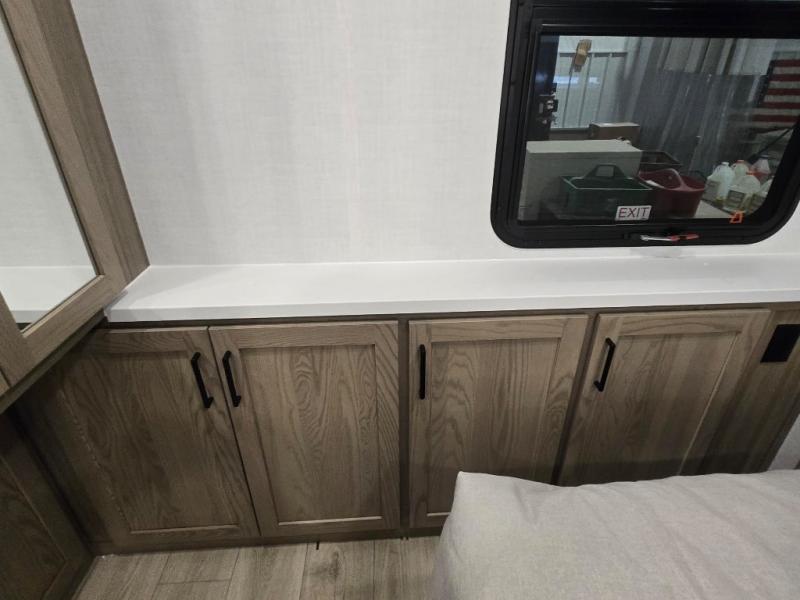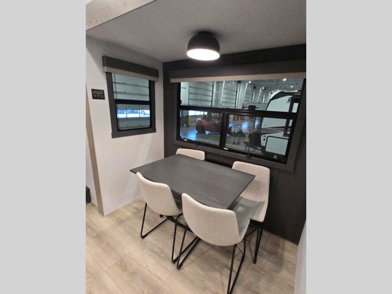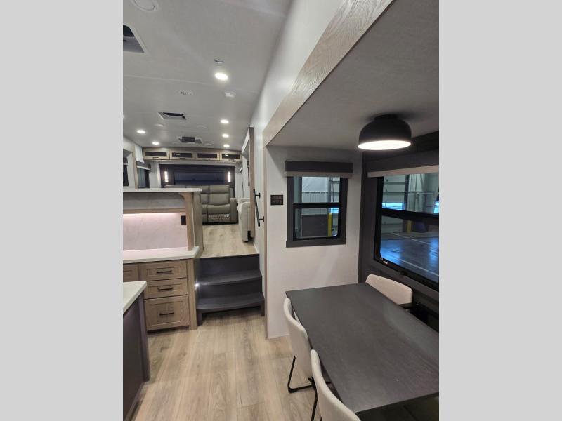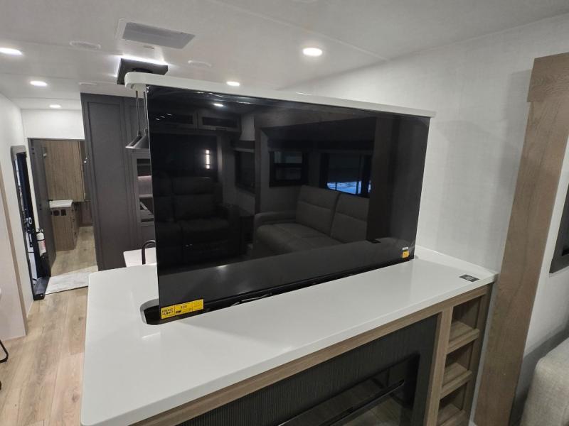 This fifth wheel is designed for comfort, connection, and relaxation on the road. The 72" x 80" king bed in the bedroom offers a spacious and restful retreat after a long day. Mealtime is a time to gather, and the rotating table with chairs creates the perfect setting to sit down, share stories, and reflect on the day’s adventures. For more laid-back evenings, the front living area features a Televator TV, turning the space into a cozy home theater for movie nights with the whole crew. When it’s time to wind down, two 68" hide-a-beds provide additional sleeping space, ensuring everyone has a comfortable place to rest.