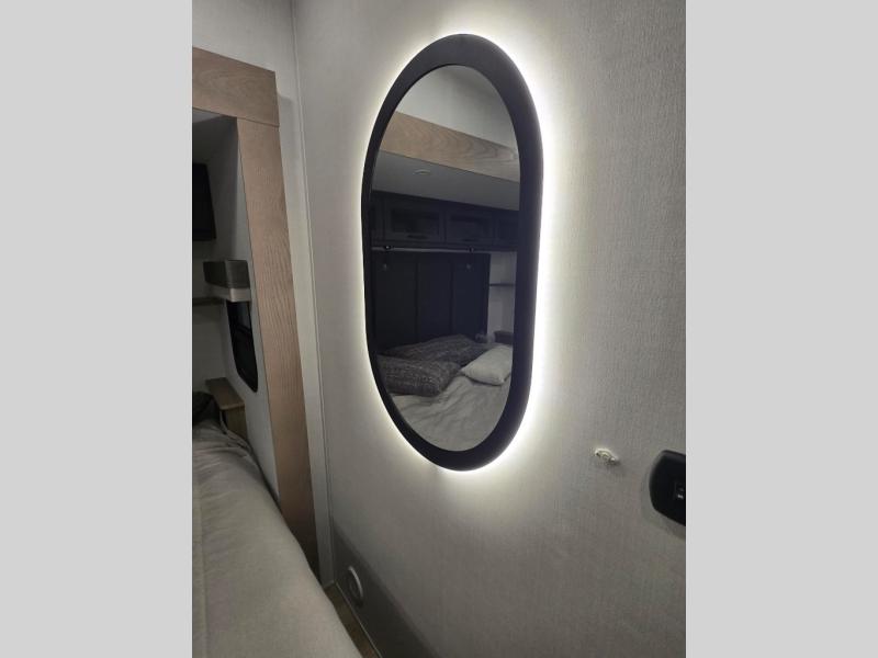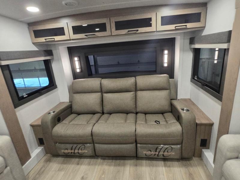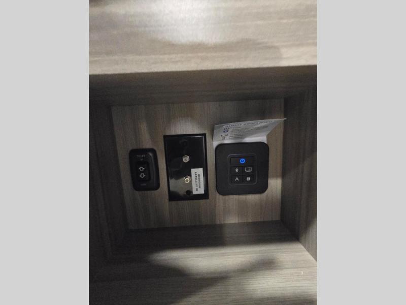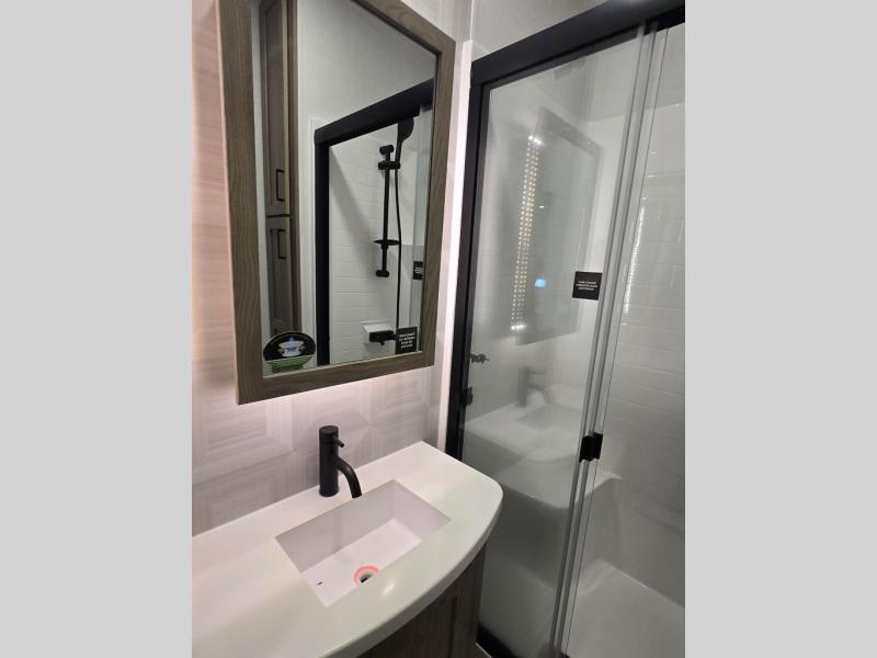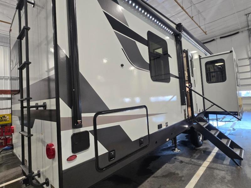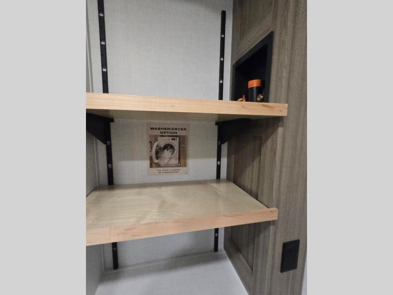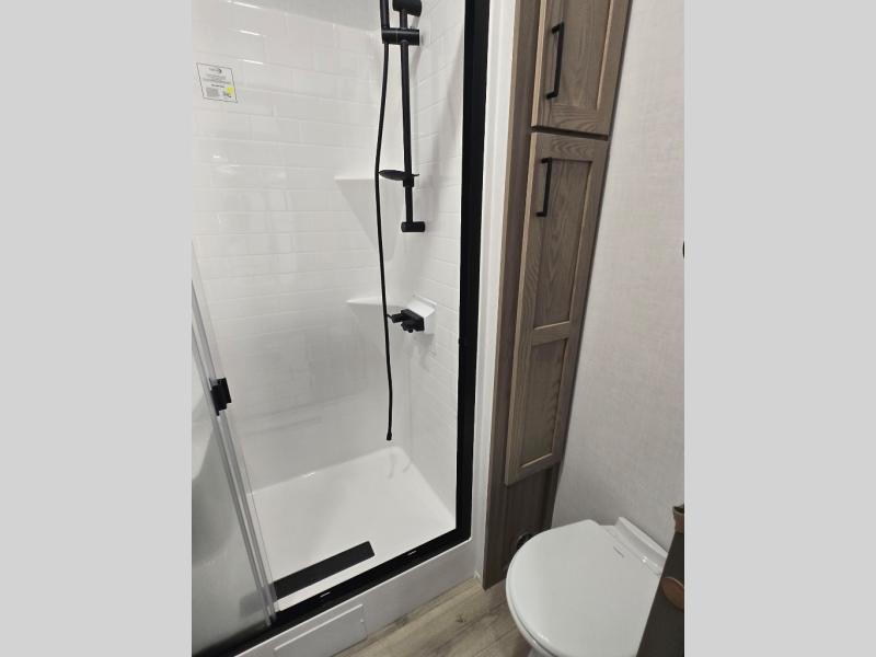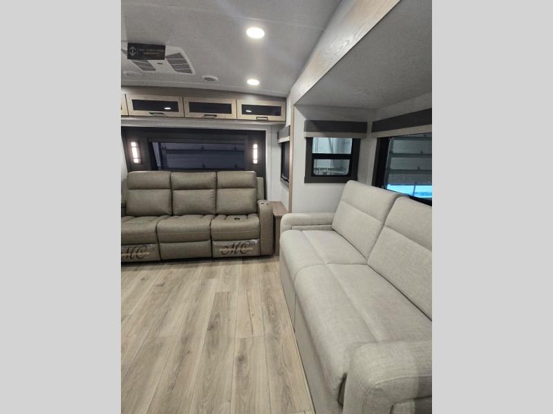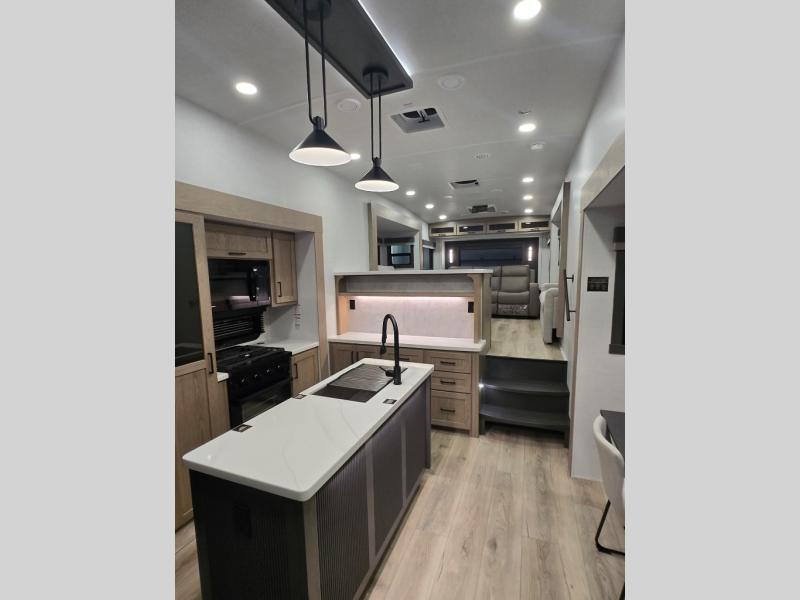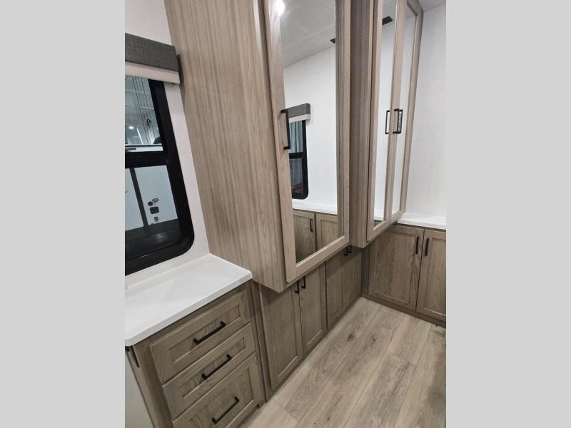 This fifth wheel is designed for comfort, connection, and relaxation on the road. The 72" x 80" king bed in the bedroom offers a spacious and restful retreat after a long day. Mealtime is a time to gather, and the rotating table with chairs creates the perfect setting to sit down, share stories, and reflect on the day’s adventures. For more laid-back evenings, the front living area features a Televator TV, turning the space into a cozy home theater for movie nights with the whole crew. When it’s time to wind down, two 68" hide-a-beds provide additional sleeping space, ensuring everyone has a comfortable place to rest.