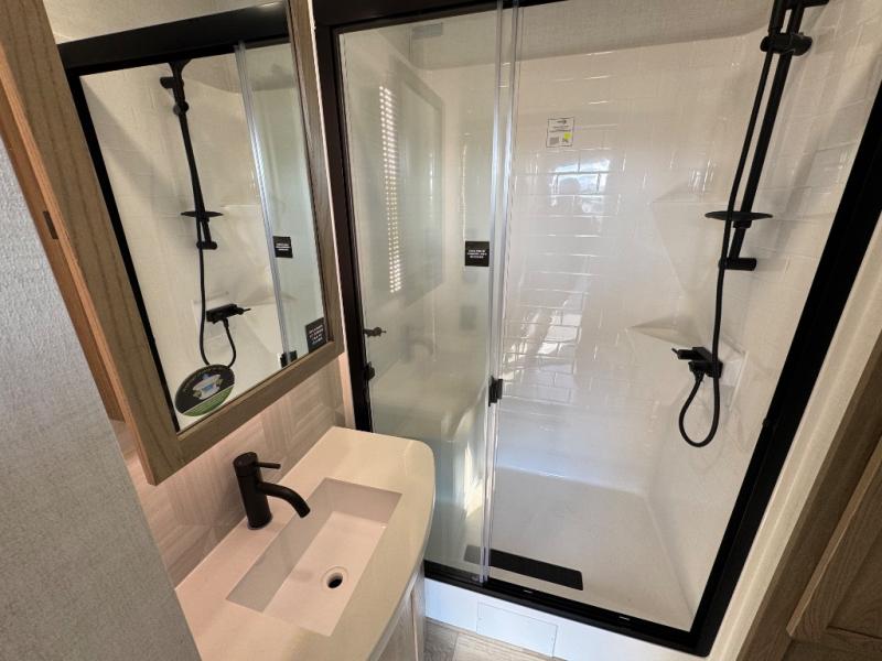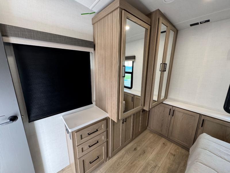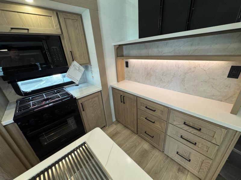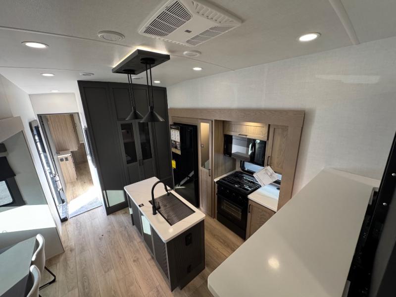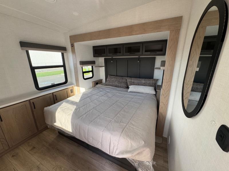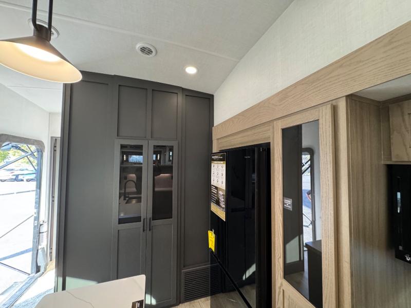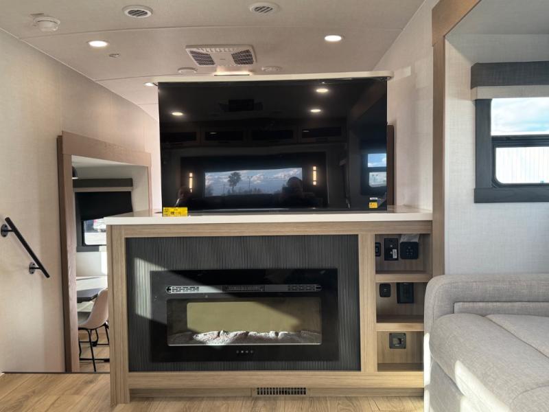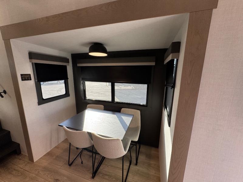 This fifth wheel is designed for comfort, connection, and relaxation on the road. The 72" x 80" king bed in the bedroom offers a spacious and restful retreat after a long day. Mealtime is a time to gather, and the rotating table with chairs creates the perfect setting to sit down, share stories, and reflect on the day’s adventures. For more laid-back evenings, the front living area features a Televator TV, turning the space into a cozy home theater for movie nights with the whole crew. When it’s time to wind down, two 68" hide-a-beds provide additional sleeping space, ensuring everyone has a comfortable place to rest.