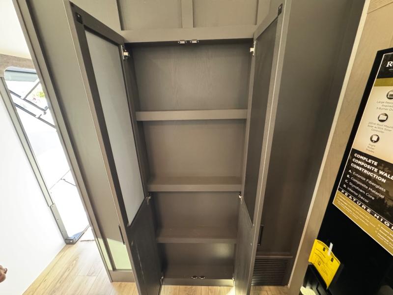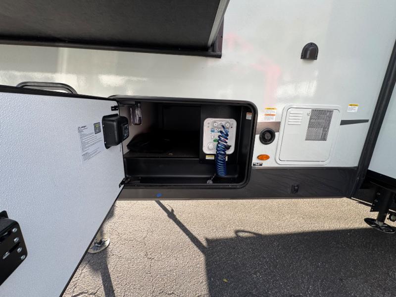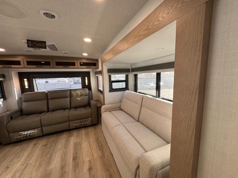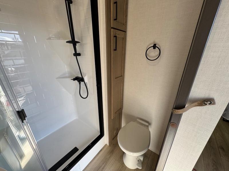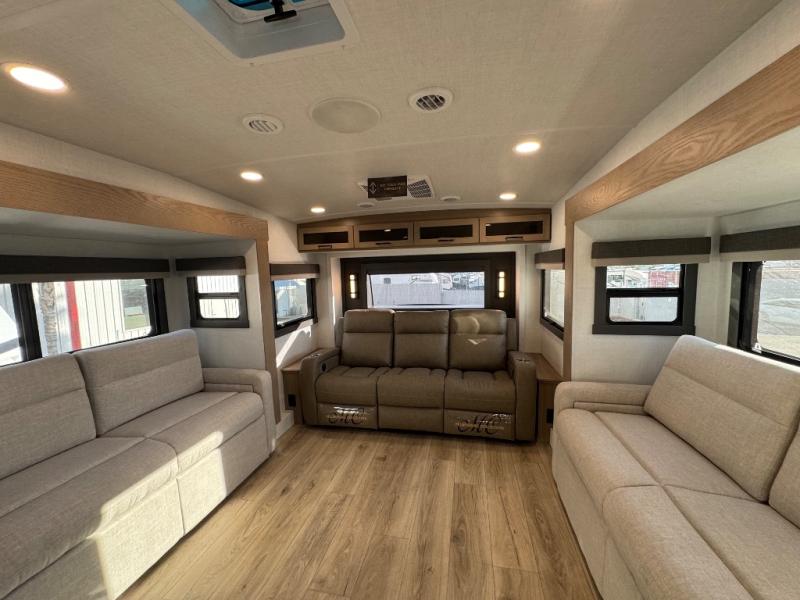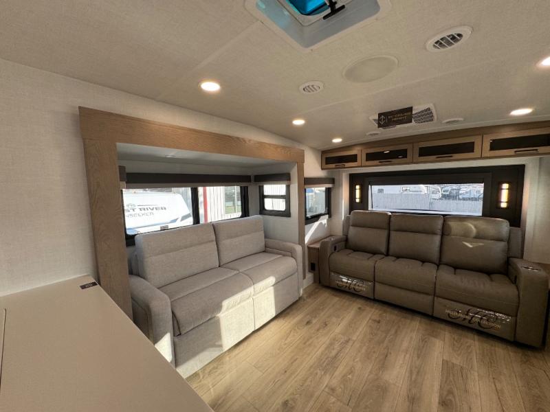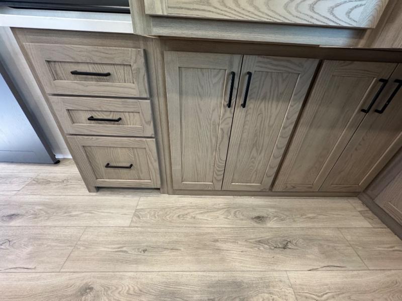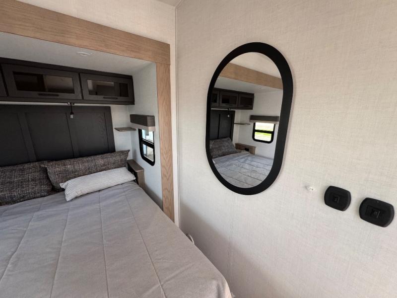 This fifth wheel is designed for comfort, connection, and relaxation on the road. The 72" x 80" king bed in the bedroom offers a spacious and restful retreat after a long day. Mealtime is a time to gather, and the rotating table with chairs creates the perfect setting to sit down, share stories, and reflect on the day’s adventures. For more laid-back evenings, the front living area features a Televator TV, turning the space into a cozy home theater for movie nights with the whole crew. When it’s time to wind down, two 68" hide-a-beds provide additional sleeping space, ensuring everyone has a comfortable place to rest.