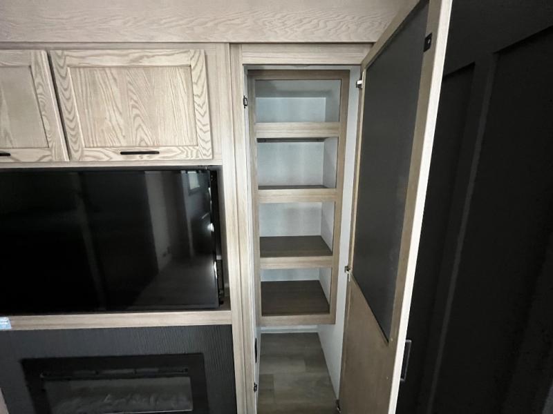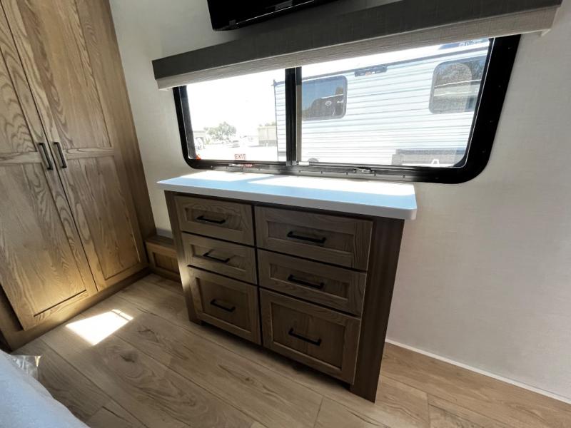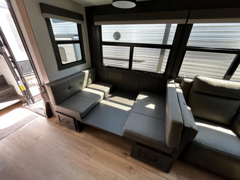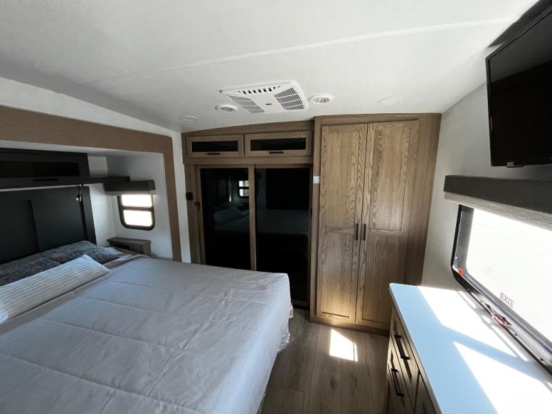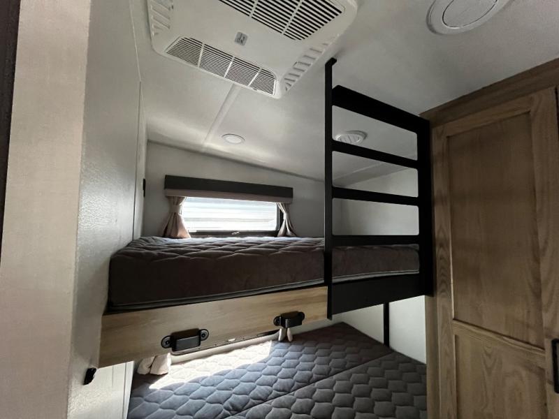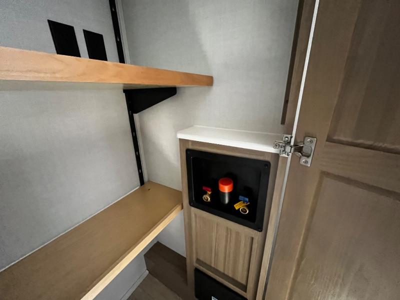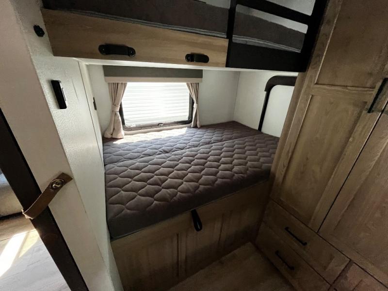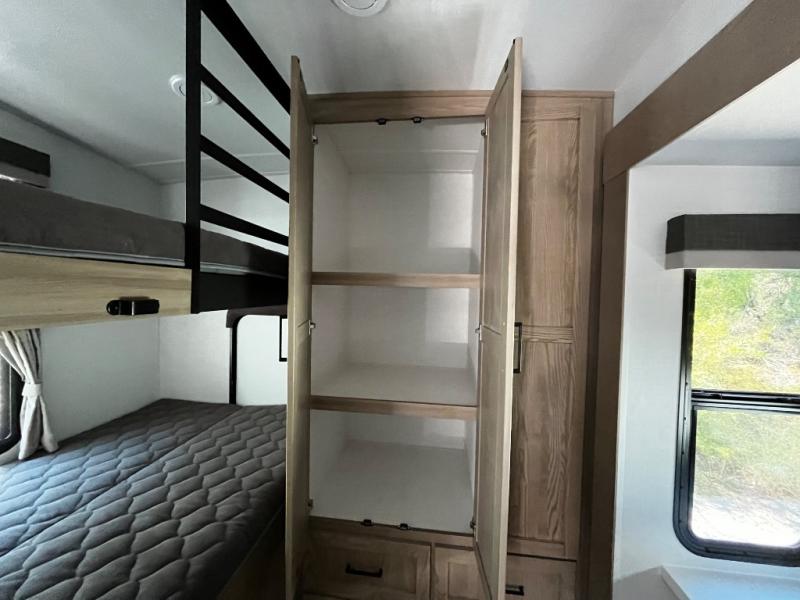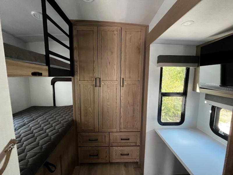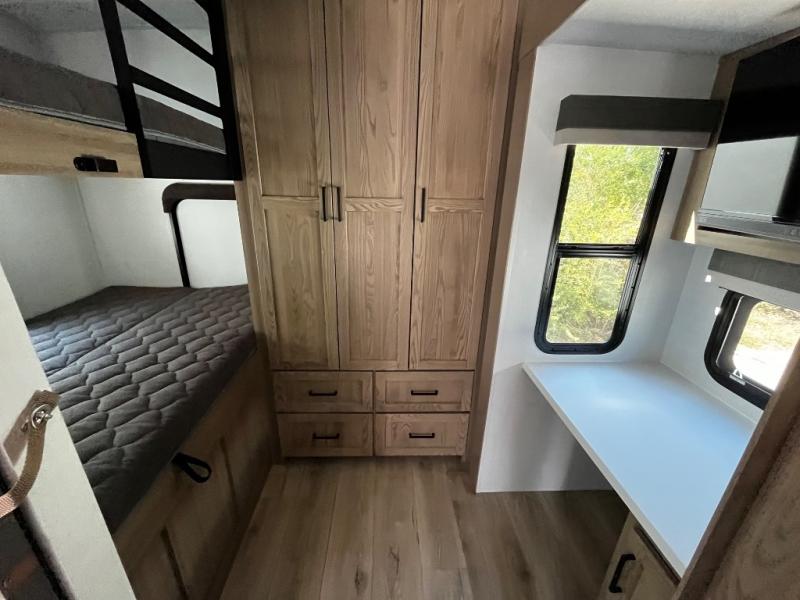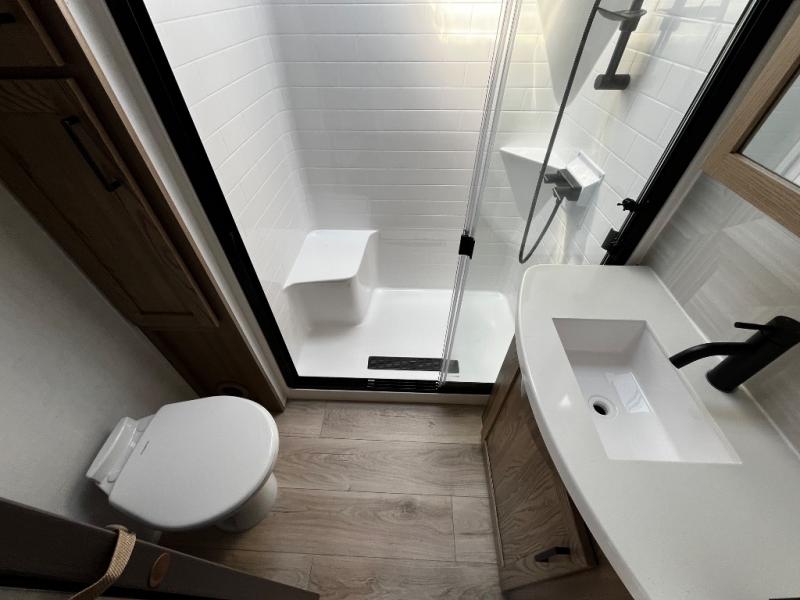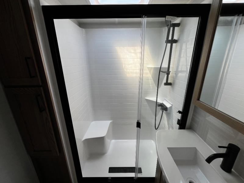 Designed with comfort and practicality in mind, this fifth wheel RV makes extended travel feel just like home. Each room is equipped with two large wardrobes, offering abundant space for clothing and storage this is perfect for families or long getaways with the whole gang. The spacious living and dining area allows everyone to move around freely without feeling cramped. A shower with a built-in seat adds a layer of comfort and accessibility. In the rear bunkhouse, a unique double bunk setup provides extra sleeping space so more friends or family members can join in on the adventure.