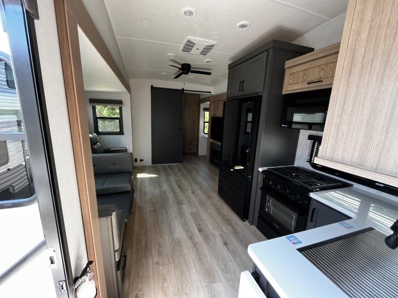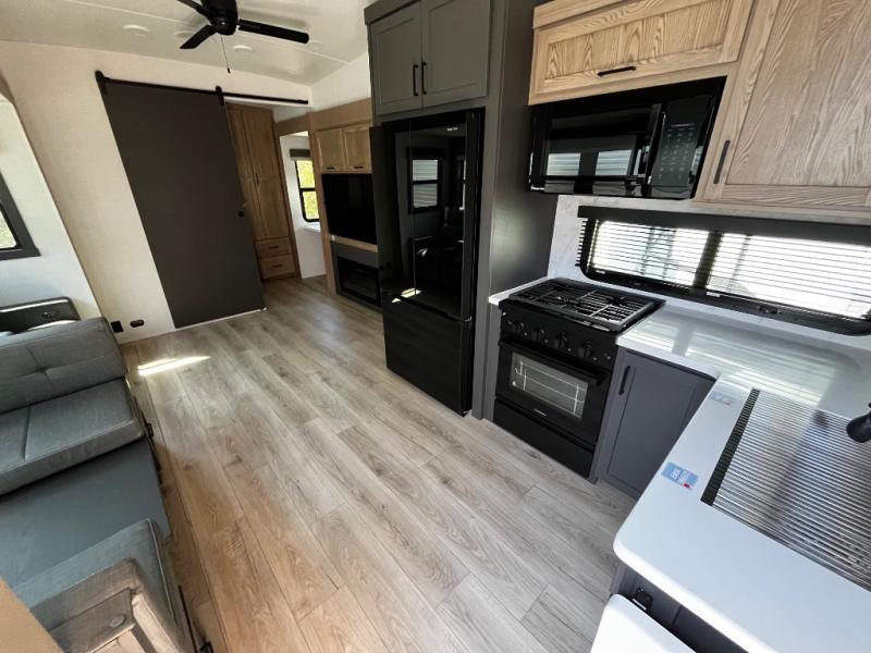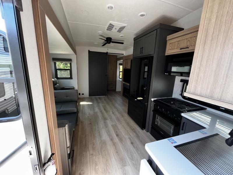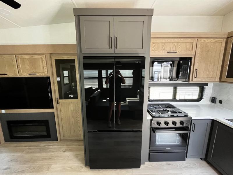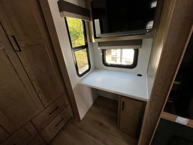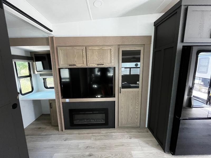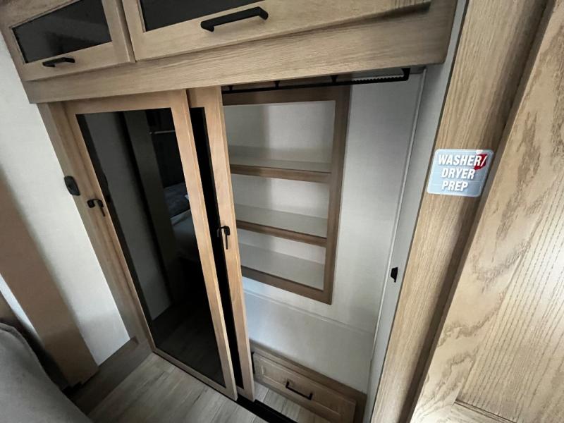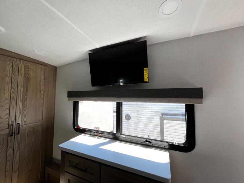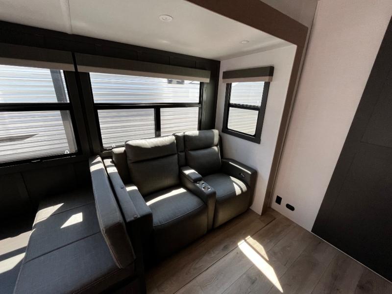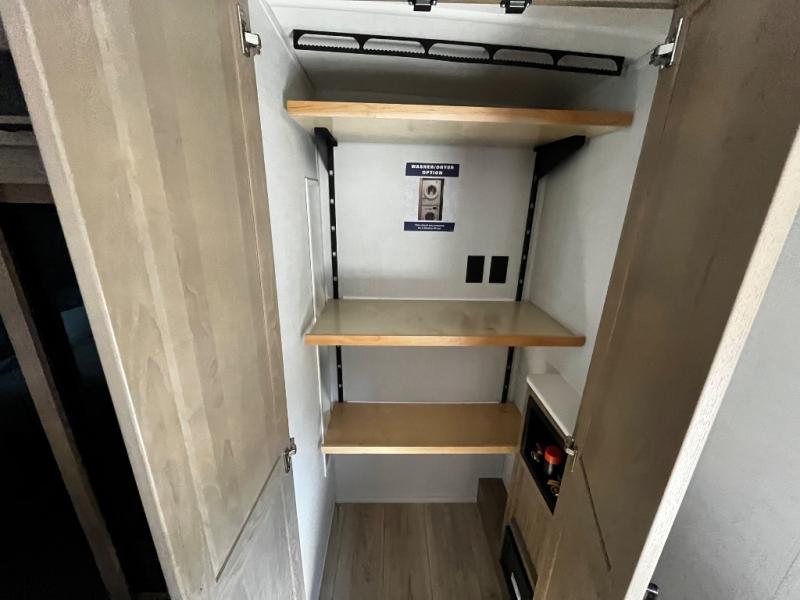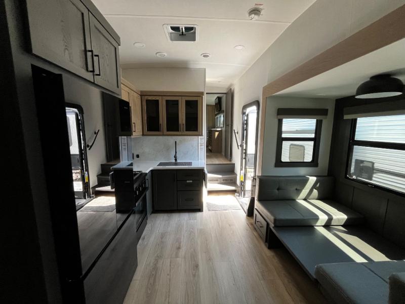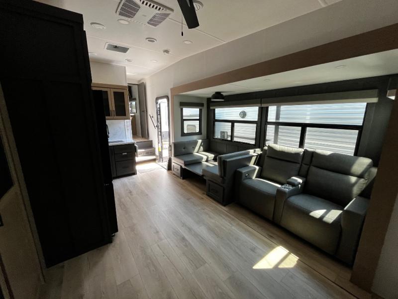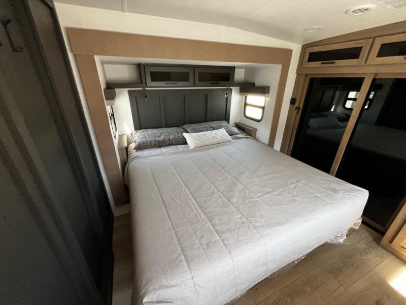 Designed with comfort and practicality in mind, this fifth wheel RV makes extended travel feel just like home. Each room is equipped with two large wardrobes, offering abundant space for clothing and storage this is perfect for families or long getaways with the whole gang. The spacious living and dining area allows everyone to move around freely without feeling cramped. A shower with a built-in seat adds a layer of comfort and accessibility. In the rear bunkhouse, a unique double bunk setup provides extra sleeping space so more friends or family members can join in on the adventure.