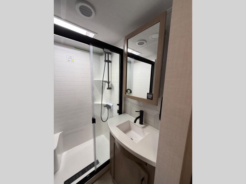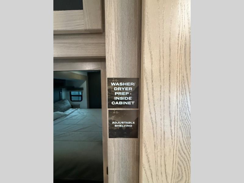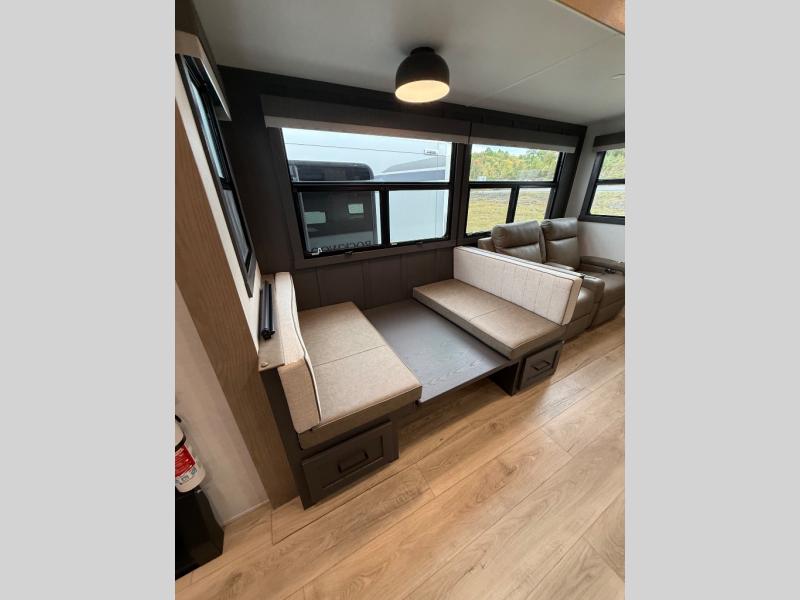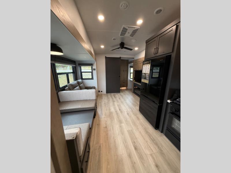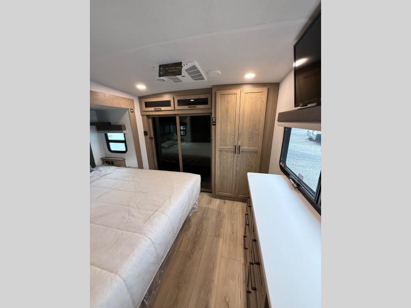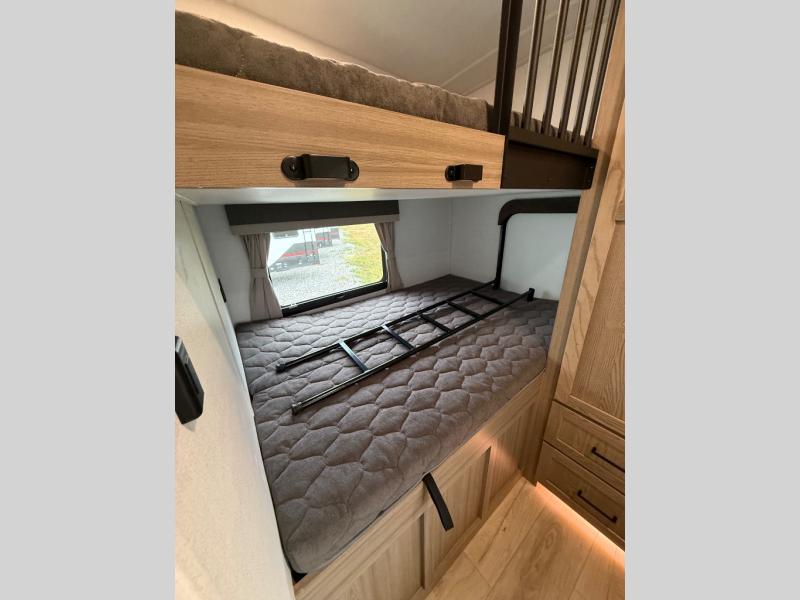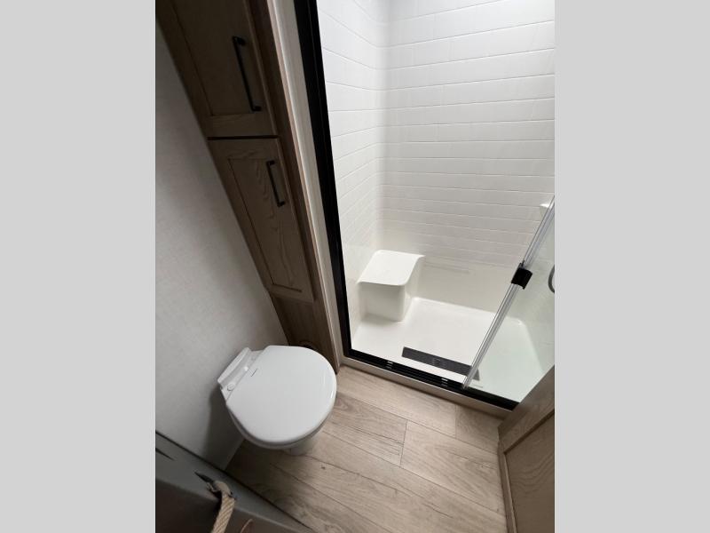 Designed with comfort and practicality in mind, this fifth wheel RV makes extended travel feel just like home. Each room is equipped with two large wardrobes, offering abundant space for clothing and storage this is perfect for families or long getaways with the whole gang. The spacious living and dining area allows everyone to move around freely without feeling cramped. A shower with a built-in seat adds a layer of comfort and accessibility. In the rear bunkhouse, a unique double bunk setup provides extra sleeping space so more friends or family members can join in on the adventure.
