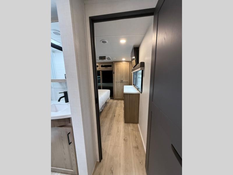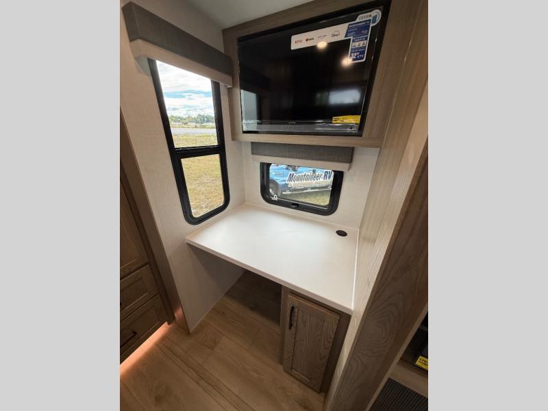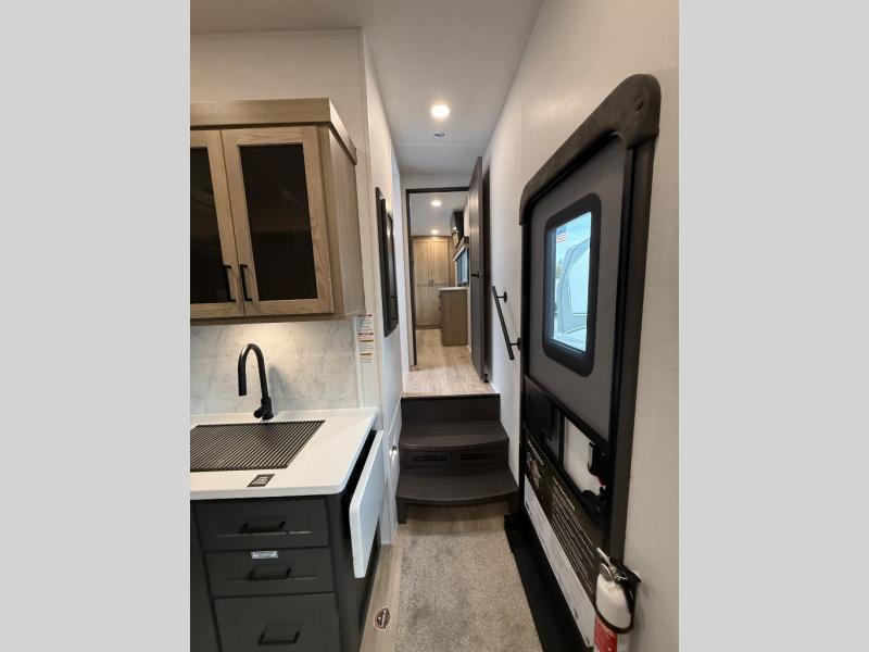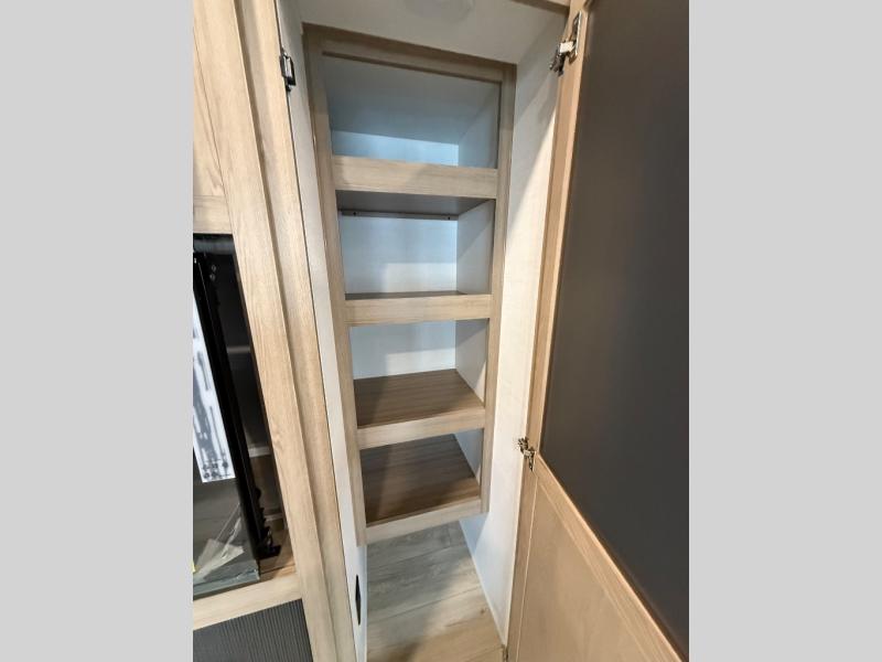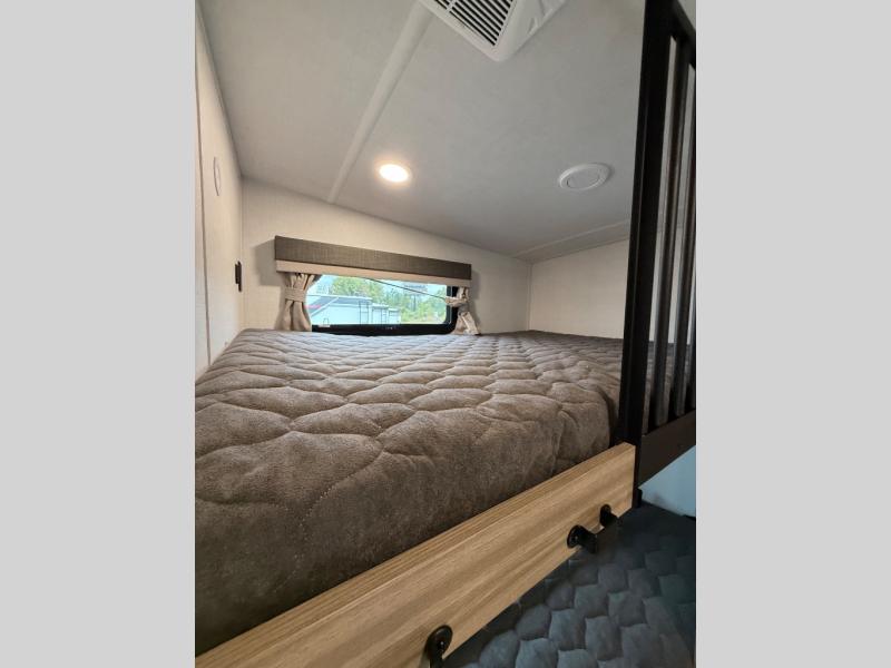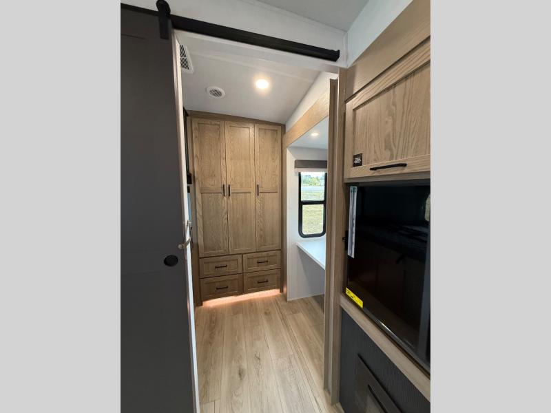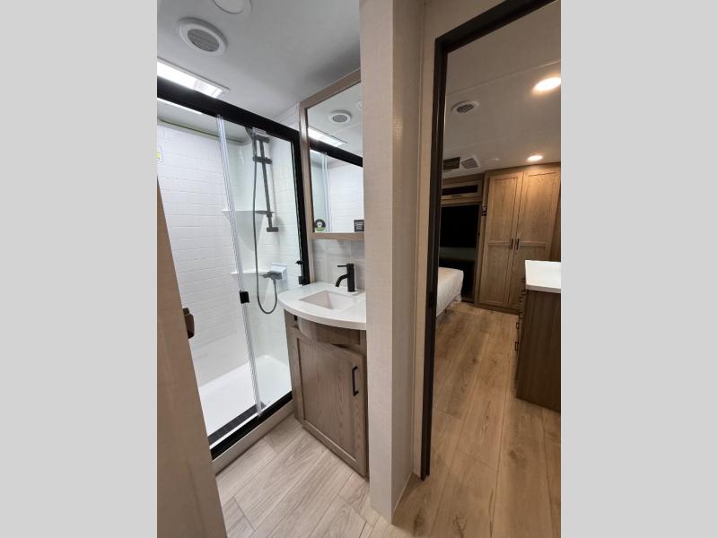 Designed with comfort and practicality in mind, this fifth wheel RV makes extended travel feel just like home. Each room is equipped with two large wardrobes, offering abundant space for clothing and storage this is perfect for families or long getaways with the whole gang. The spacious living and dining area allows everyone to move around freely without feeling cramped. A shower with a built-in seat adds a layer of comfort and accessibility. In the rear bunkhouse, a unique double bunk setup provides extra sleeping space so more friends or family members can join in on the adventure.
