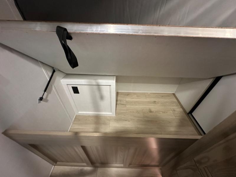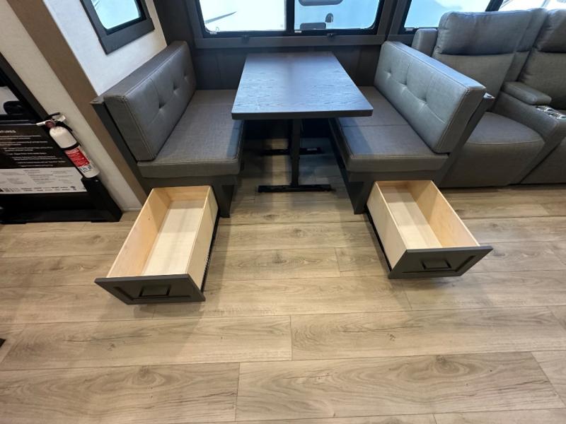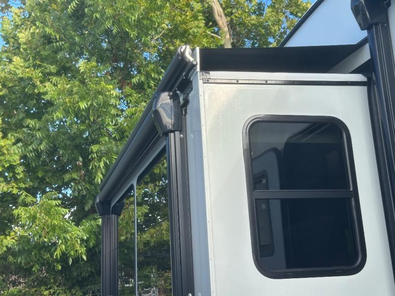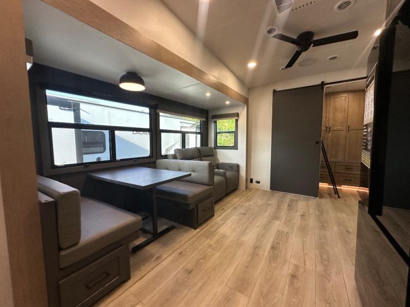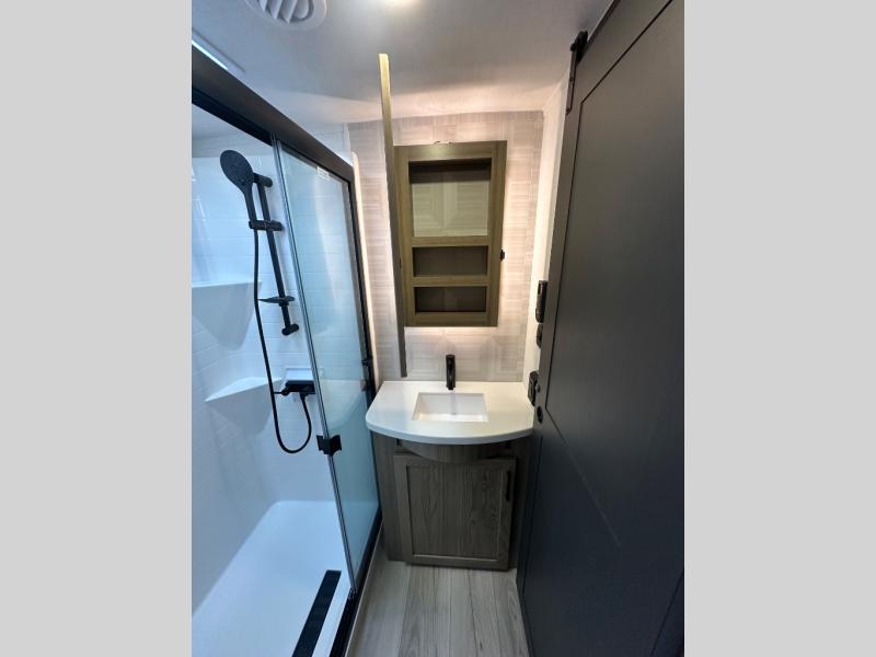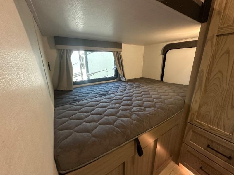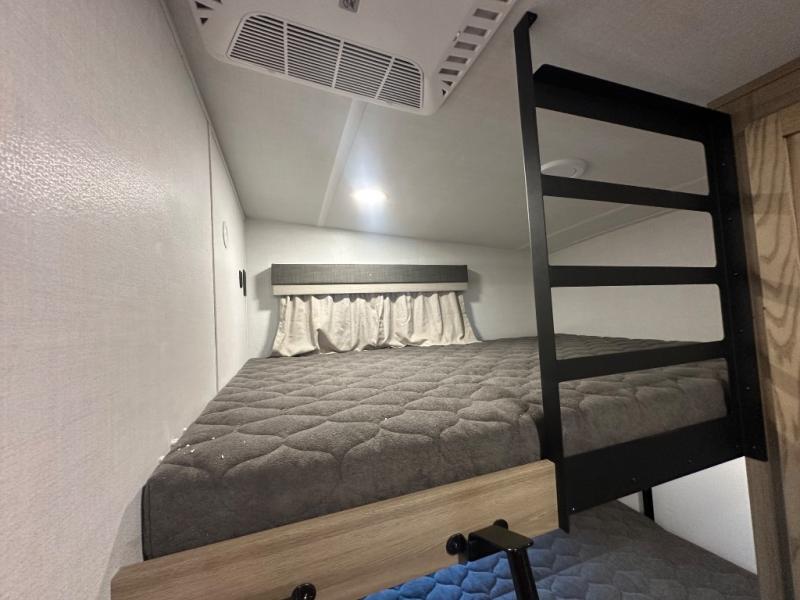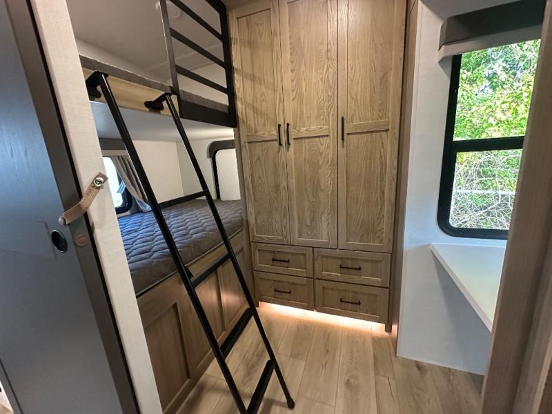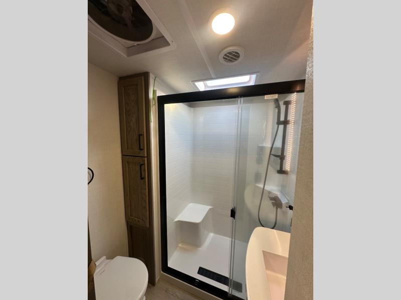 Designed with comfort and practicality in mind, this fifth wheel RV makes extended travel feel just like home. Each room is equipped with two large wardrobes, offering abundant space for clothing and storage this is perfect for families or long getaways with the whole gang. The spacious living and dining area allows everyone to move around freely without feeling cramped. A shower with a built-in seat adds a layer of comfort and accessibility. In the rear bunkhouse, a unique double bunk setup provides extra sleeping space so more friends or family members can join in on the adventure.