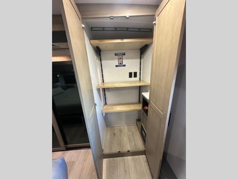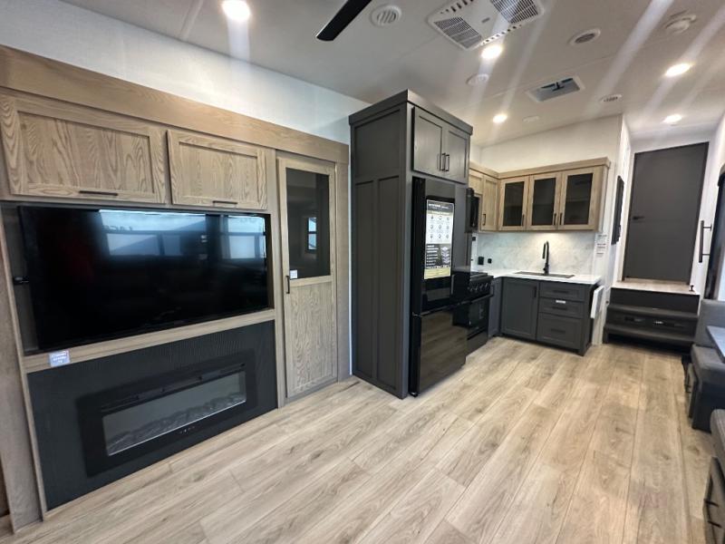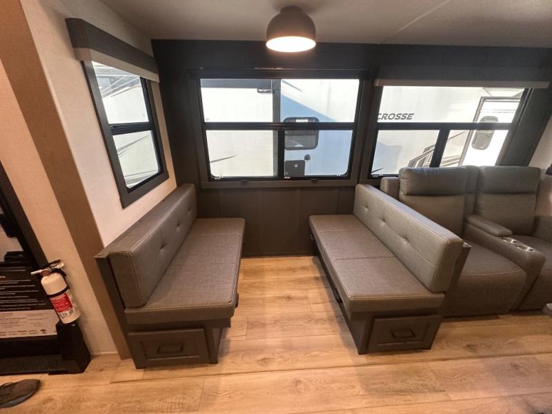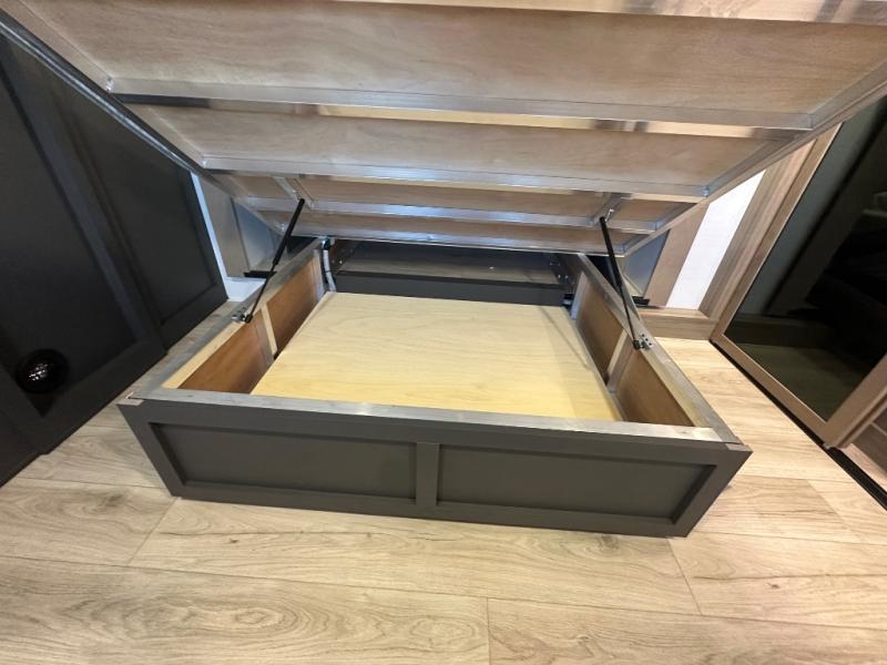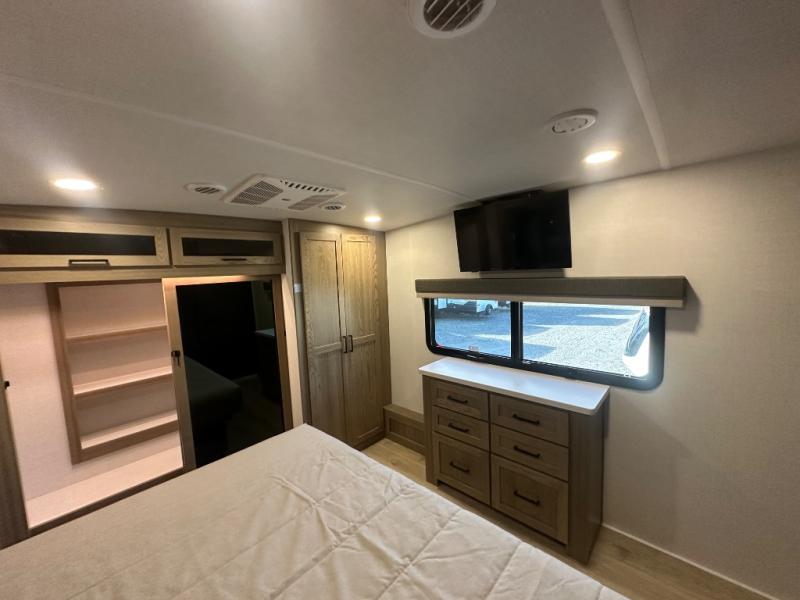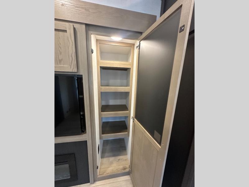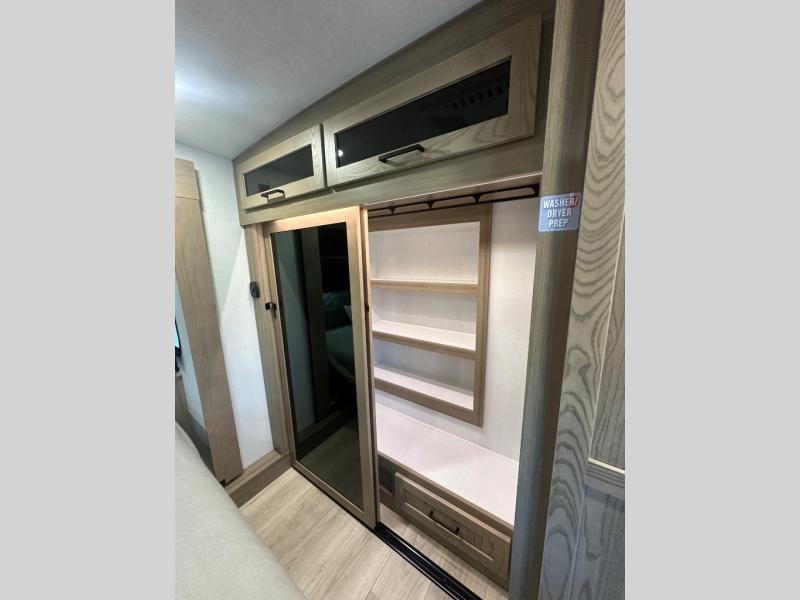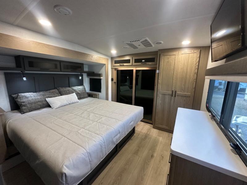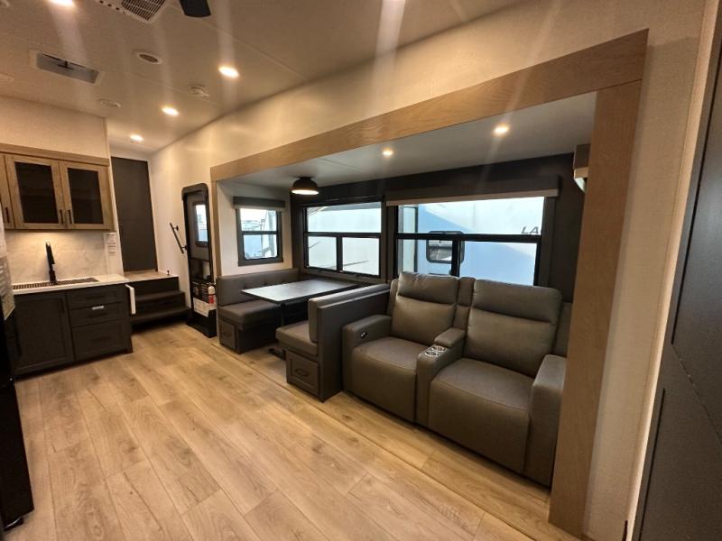 Designed with comfort and practicality in mind, this fifth wheel RV makes extended travel feel just like home. Each room is equipped with two large wardrobes, offering abundant space for clothing and storage this is perfect for families or long getaways with the whole gang. The spacious living and dining area allows everyone to move around freely without feeling cramped. A shower with a built-in seat adds a layer of comfort and accessibility. In the rear bunkhouse, a unique double bunk setup provides extra sleeping space so more friends or family members can join in on the adventure.