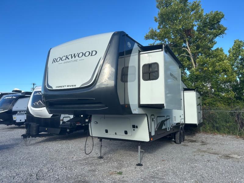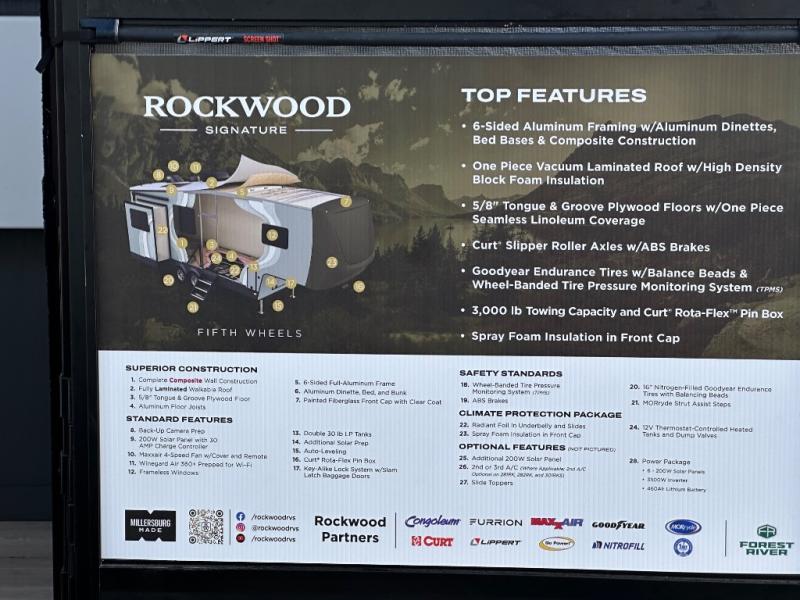 With any Rockwood Signature fifth wheel or travel trailer by Forest River RV, you will enjoy superior construction that includes a fully laminated walkable roof, 6-sided full-aluminum frame, and a painted fiberglass front cap with Clear Coat for added durability. Outside, you'll find a 200W solar panel for off-grid capabilities, slam baggage doors, and Key-Alike lock system for added convenience. Head inside to find soft close roller bearing drawers, roller shades, and residential style gas range. These travel trailer and fifth wheels also feature Goodyear Endurance tires with a tire pressure monitoring system plus Dexter Torflex torsion axles for smooth towing!