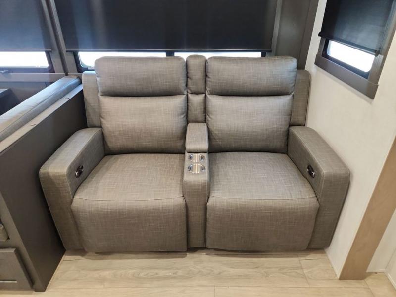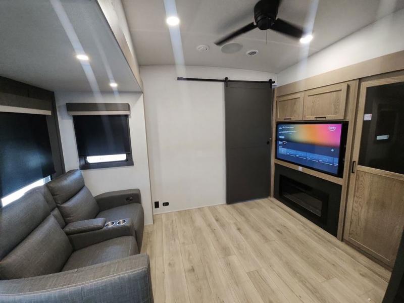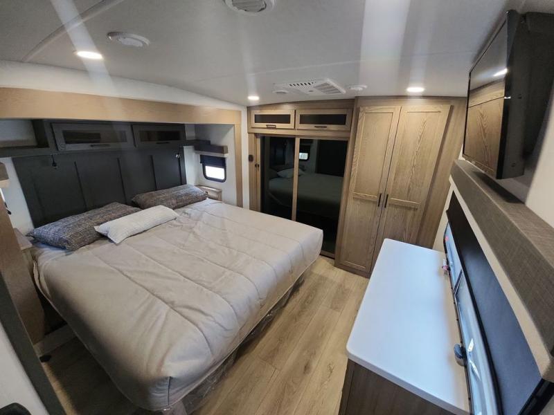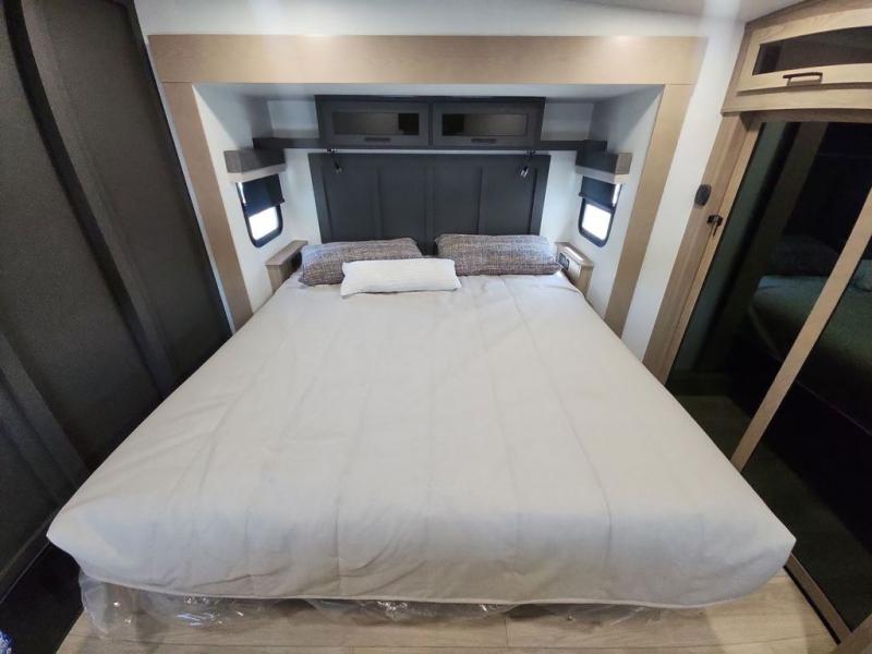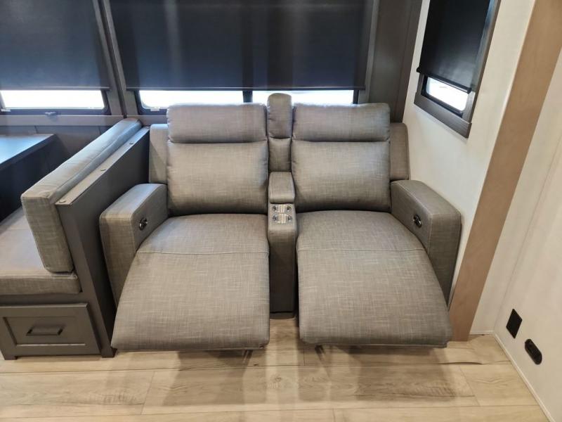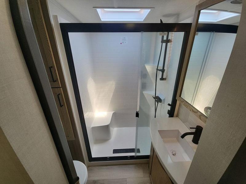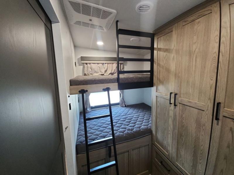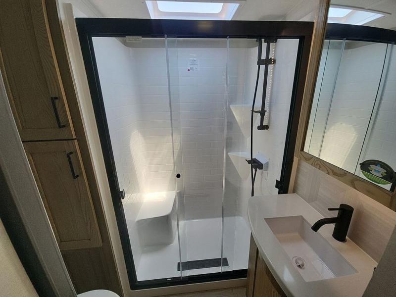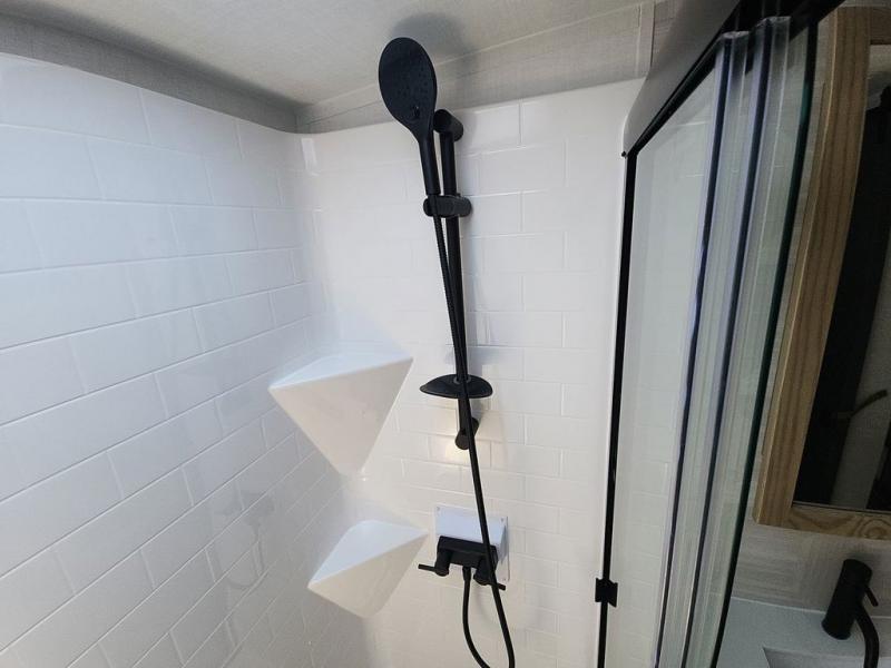 Designed with comfort and practicality in mind, this fifth wheel RV makes extended travel feel just like home. Each room is equipped with two large wardrobes, offering abundant space for clothing and storage this is perfect for families or long getaways with the whole gang. The spacious living and dining area allows everyone to move around freely without feeling cramped. A shower with a built-in seat adds a layer of comfort and accessibility. In the rear bunkhouse, a unique double bunk setup provides extra sleeping space so more friends or family members can join in on the adventure.