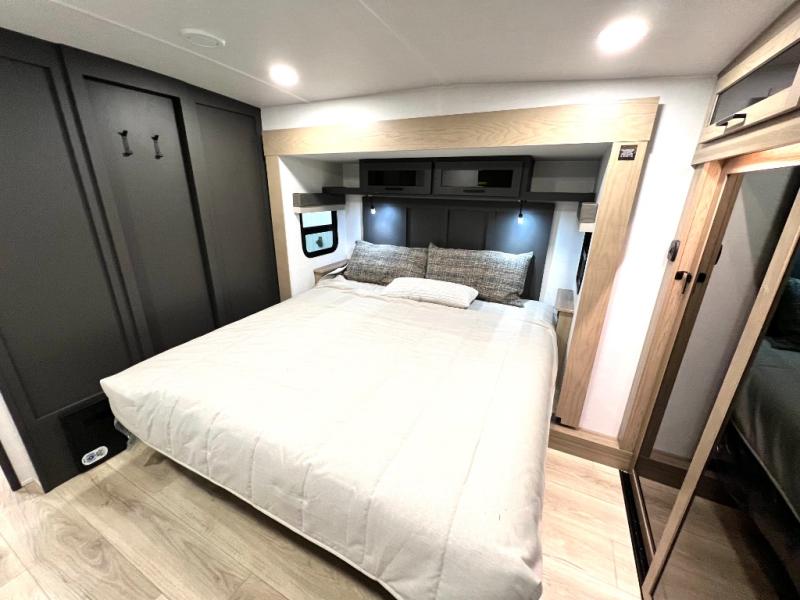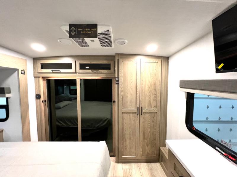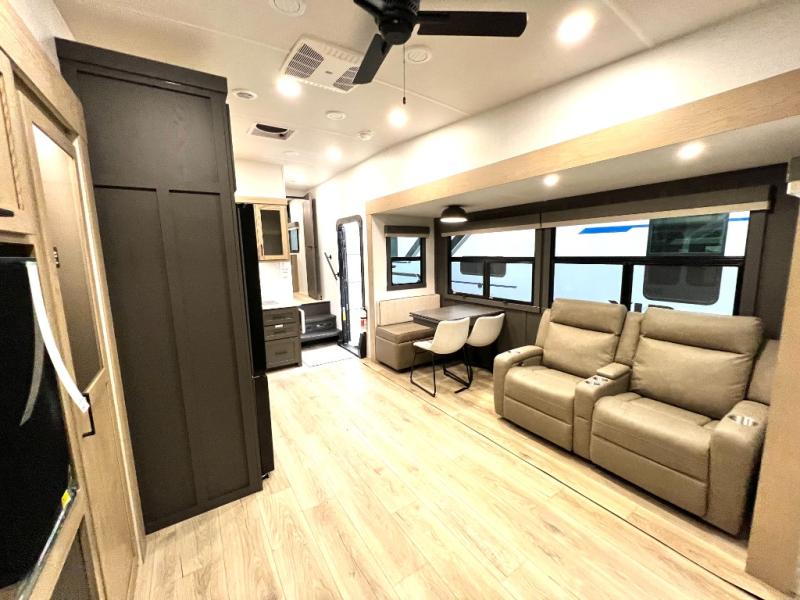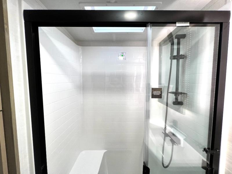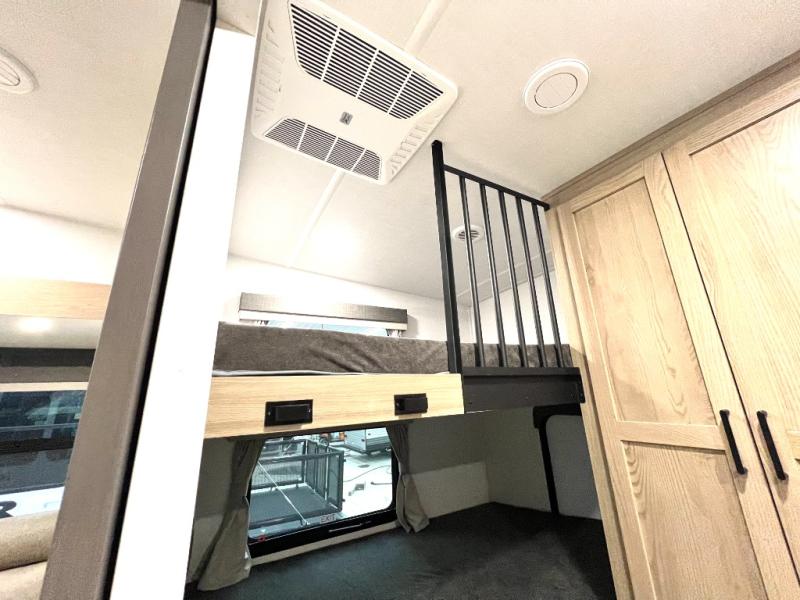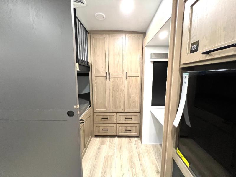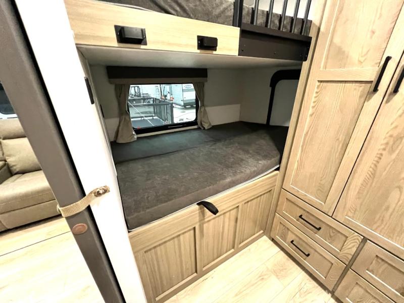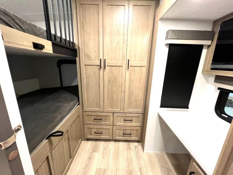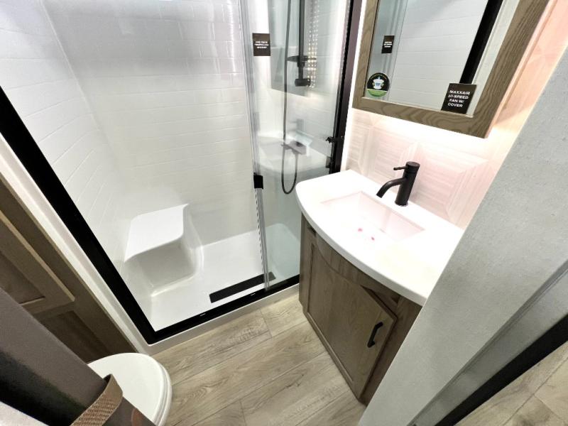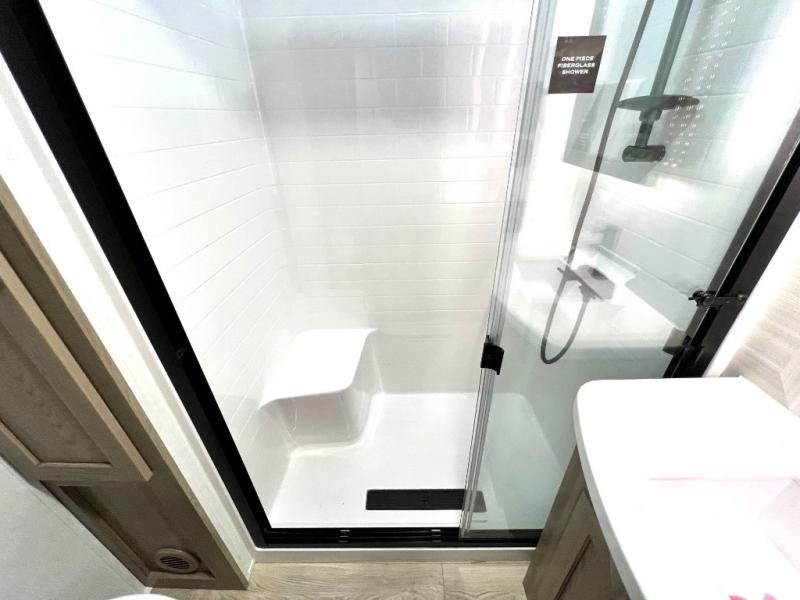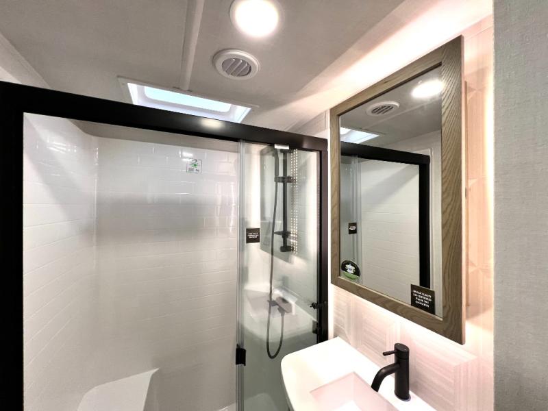 Designed with comfort and practicality in mind, this fifth wheel RV makes extended travel feel just like home. Each room is equipped with two large wardrobes, offering abundant space for clothing and storage this is perfect for families or long getaways with the whole gang. The spacious living and dining area allows everyone to move around freely without feeling cramped. A shower with a built-in seat adds a layer of comfort and accessibility. In the rear bunkhouse, a unique double bunk setup provides extra sleeping space so more friends or family members can join in on the adventure.