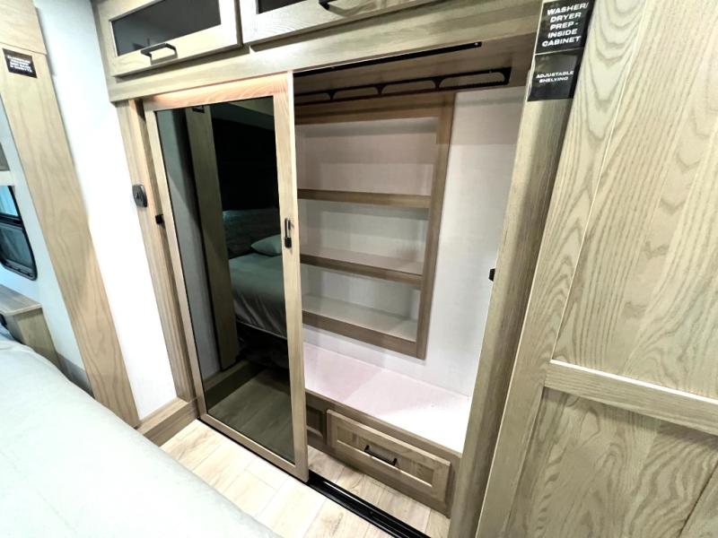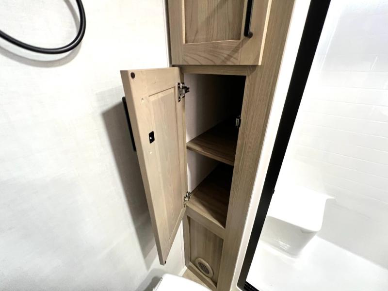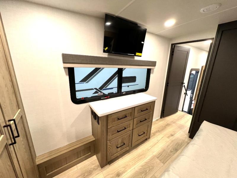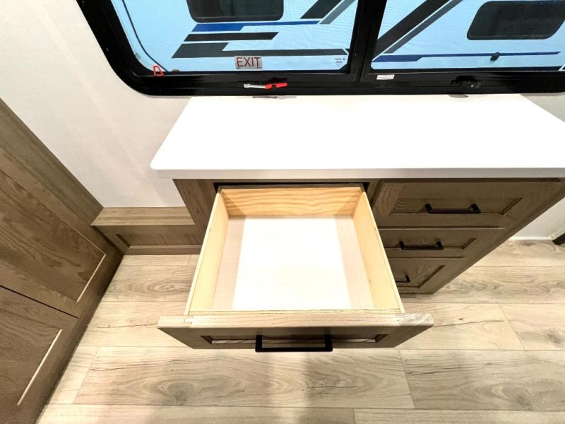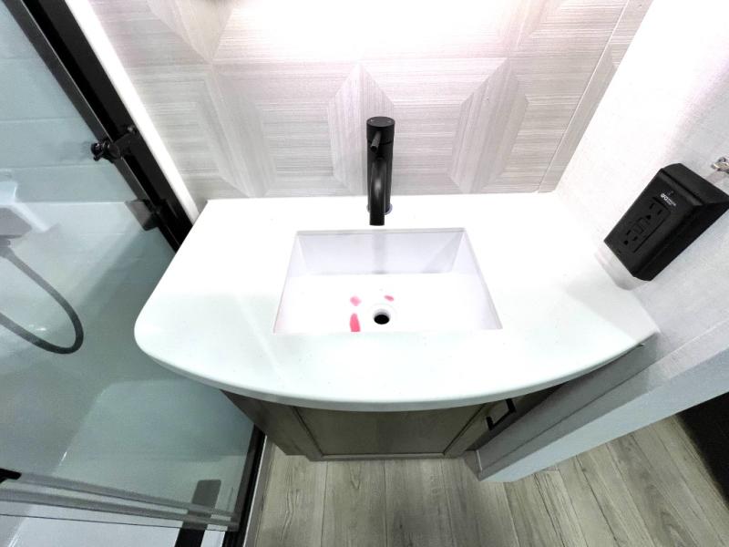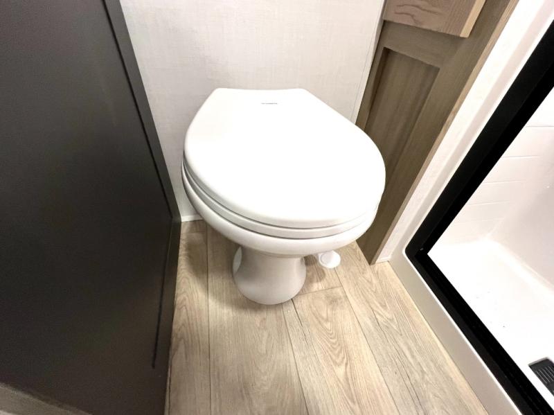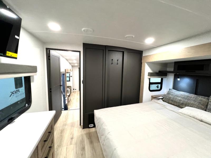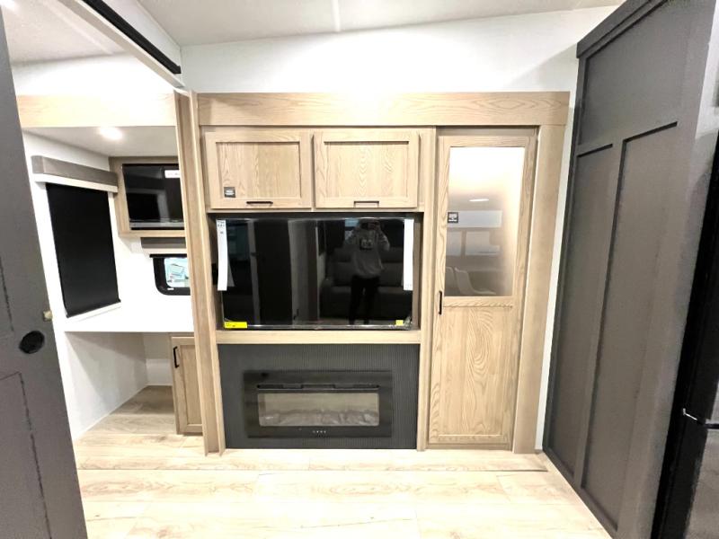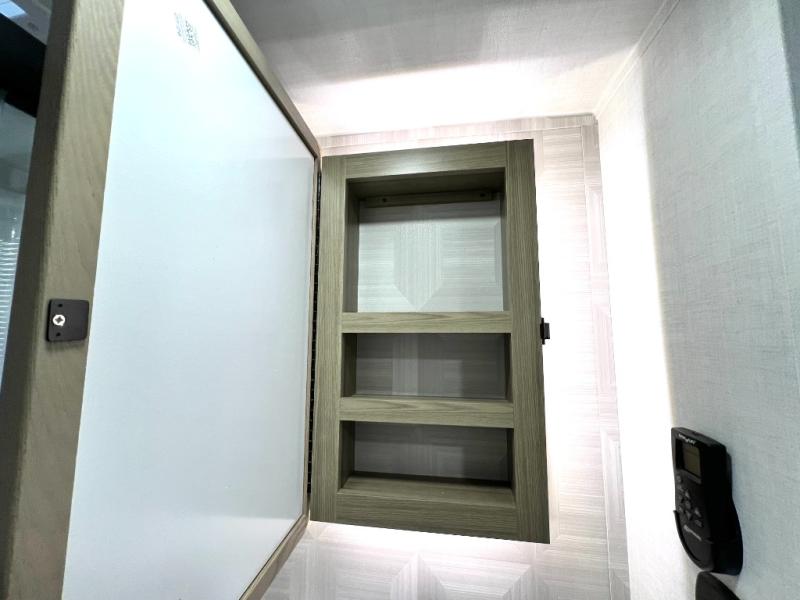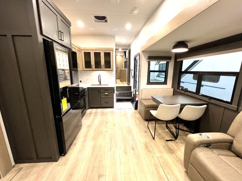 Designed with comfort and practicality in mind, this fifth wheel RV makes extended travel feel just like home. Each room is equipped with two large wardrobes, offering abundant space for clothing and storage this is perfect for families or long getaways with the whole gang. The spacious living and dining area allows everyone to move around freely without feeling cramped. A shower with a built-in seat adds a layer of comfort and accessibility. In the rear bunkhouse, a unique double bunk setup provides extra sleeping space so more friends or family members can join in on the adventure.