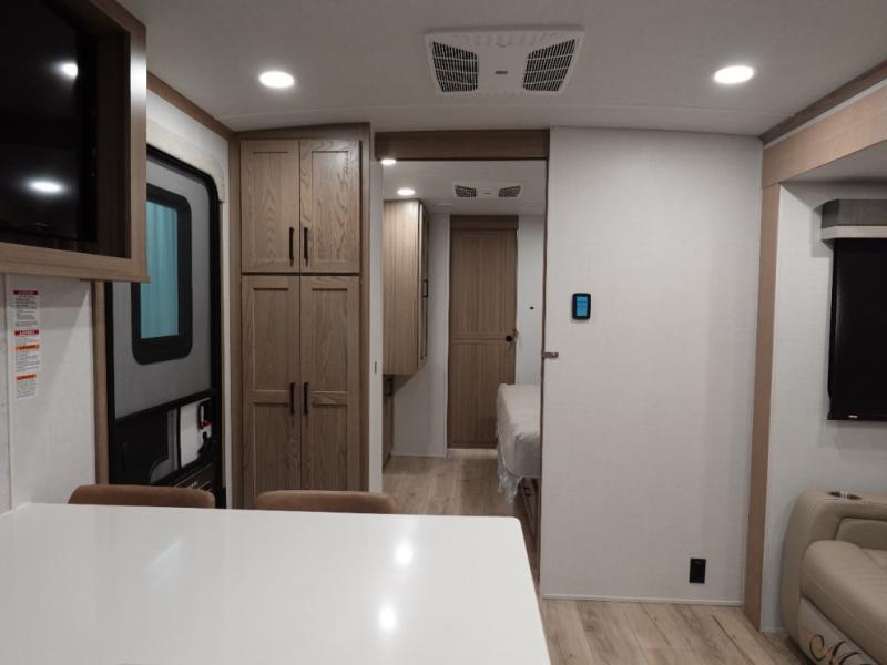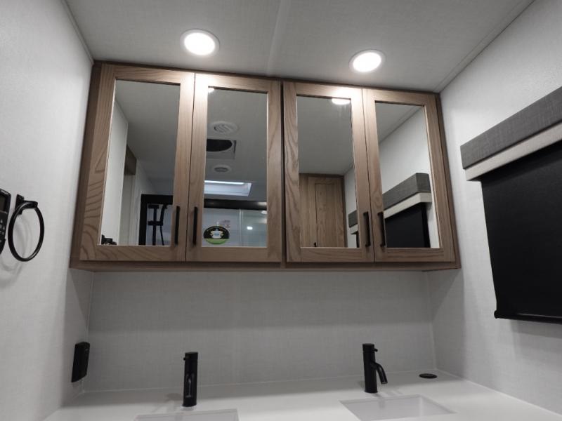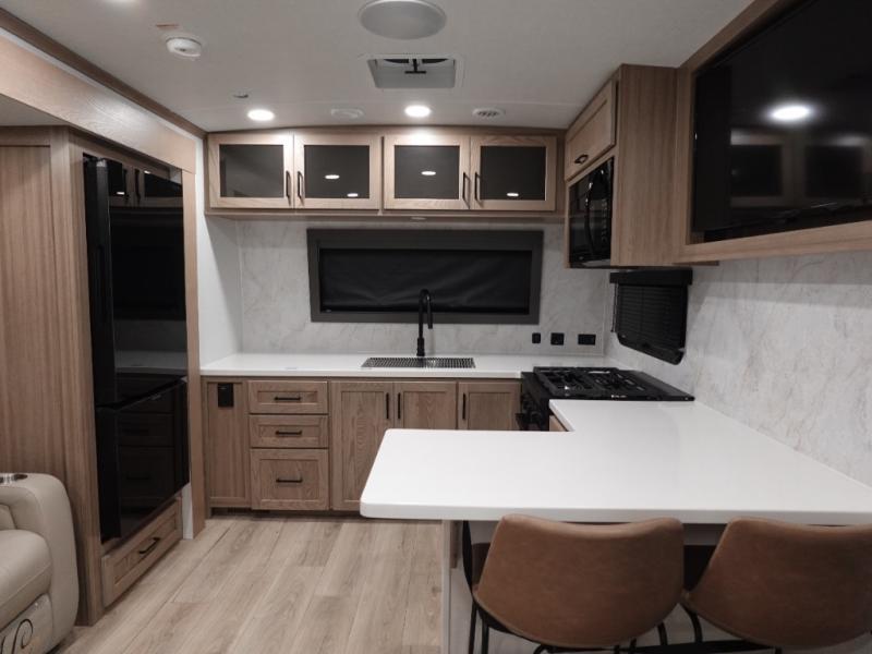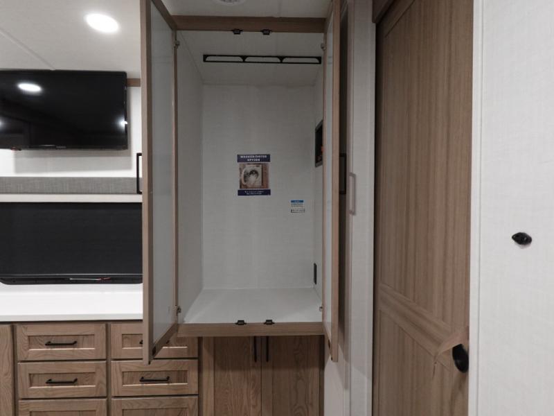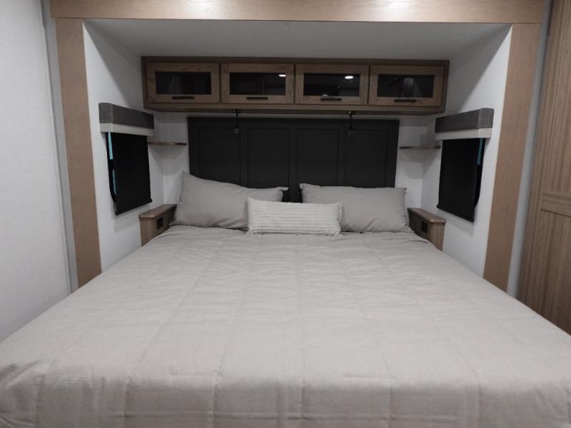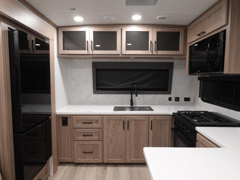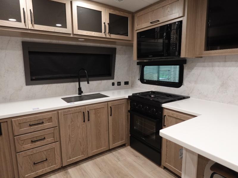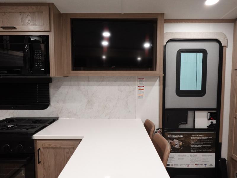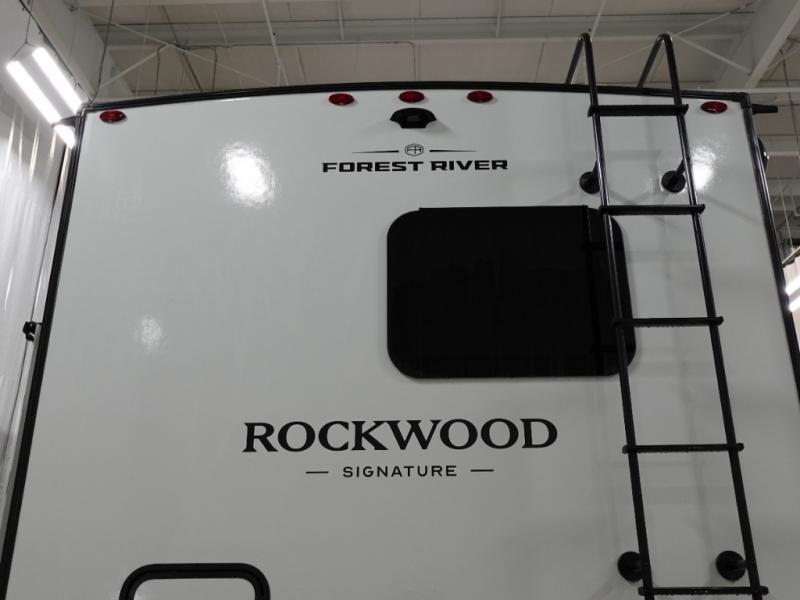 With any Rockwood Signature fifth wheel or travel trailer by Forest River RV, you will enjoy superior construction that includes laminated white fiberglass sidewalls, a radius roof with vaulted interior ceilings, plus radiant foil insulation and an enclosed underbelly for use in all types of weather. Some convenient exterior features include Keyed Alike locks, a rear ladder, a 200W solar panel, and a tire pressure monitor system with a monitor for added safety. The interior offers a One Touch OneControl panel with WeRV app control, for lights, awning, slides, water heater and more, and the Air 360+ omnidirectional antenna with WiFi prep lets you work while away from home if needed. You will also appreciate the interior vaulted ceilings, residential soft close doors and drawers, solid surface kitchen countertops, and designer kitchen backsplash!