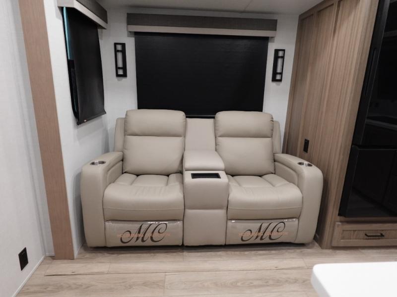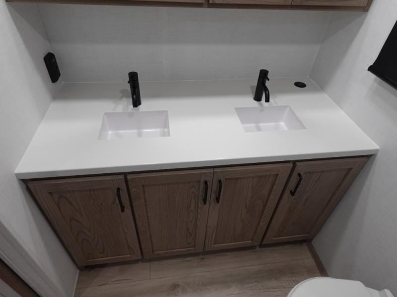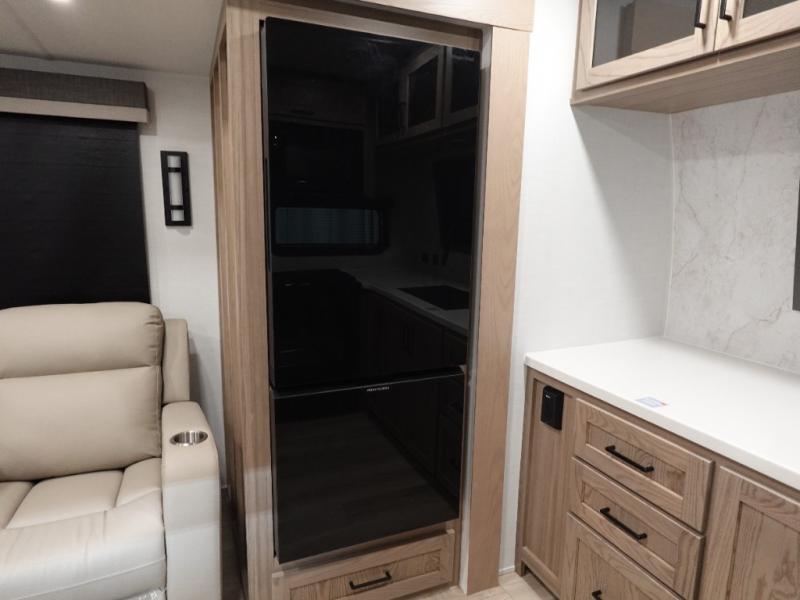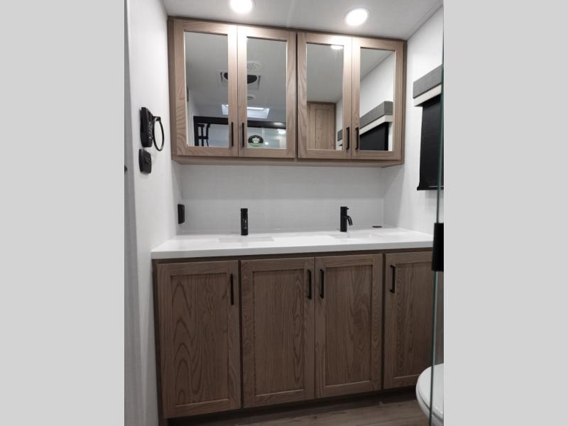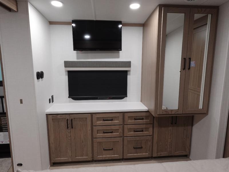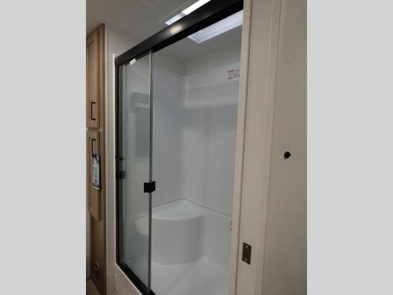 This front kitchen, couple's trailer is ready for adventure when you are! Once you arrive at your destination, prepare a quick lunch on the outside griddle, and enjoy the shade provided by the 19' power awning. You can eat outside, or inside at the counter with stools. The theatre seat will make this travel trailer feel more like home, and the double slides provide more space to stretch out. Within the master bedroom you'll find a king bed, a large wardrobe and a dresser, plus an optional TV. And check out the full rear bath with dual bath sinks and a shower with a seat! Now, that's what I call comfort!