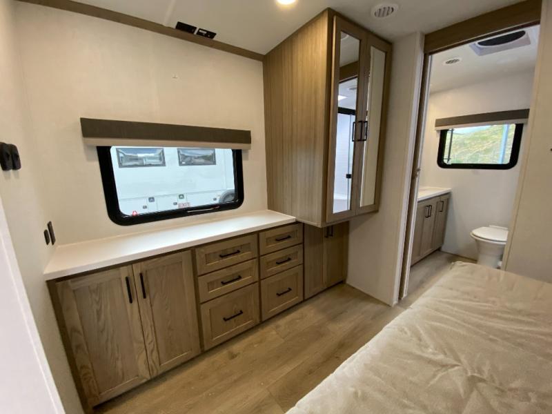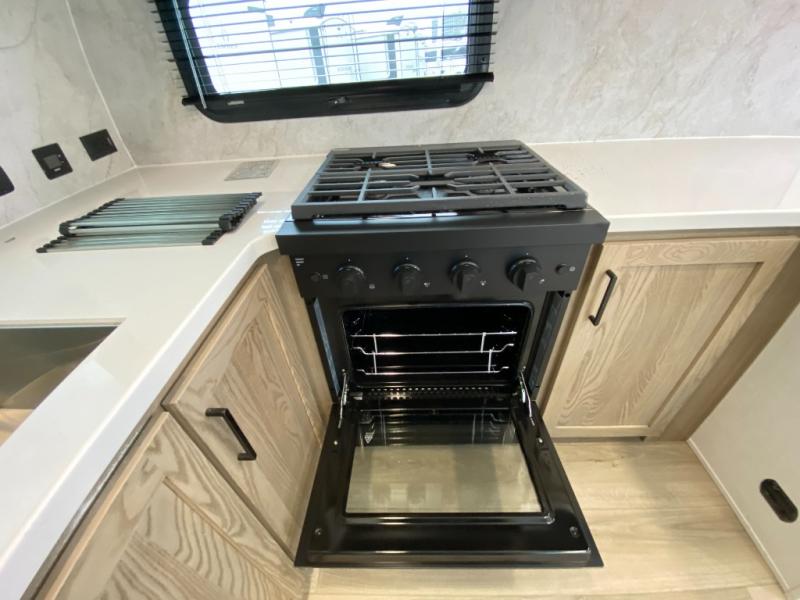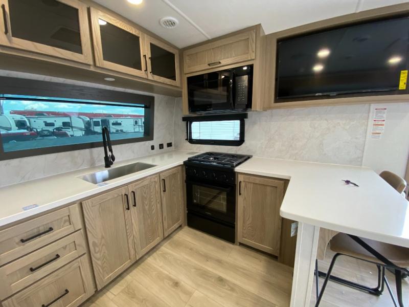 This front kitchen, couple's trailer is ready for adventure when you are! Once you arrive at your destination, prepare a quick lunch on the outside griddle, and enjoy the shade provided by the 19' power awning. You can eat outside, or inside at the counter with stools. The theatre seat will make this travel trailer feel more like home, and the double slides provide more space to stretch out. Within the master bedroom you'll find a king bed, a large wardrobe and a dresser, plus an optional TV. And check out the full rear bath with dual bath sinks and a shower with a seat! Now, that's what I call comfort!