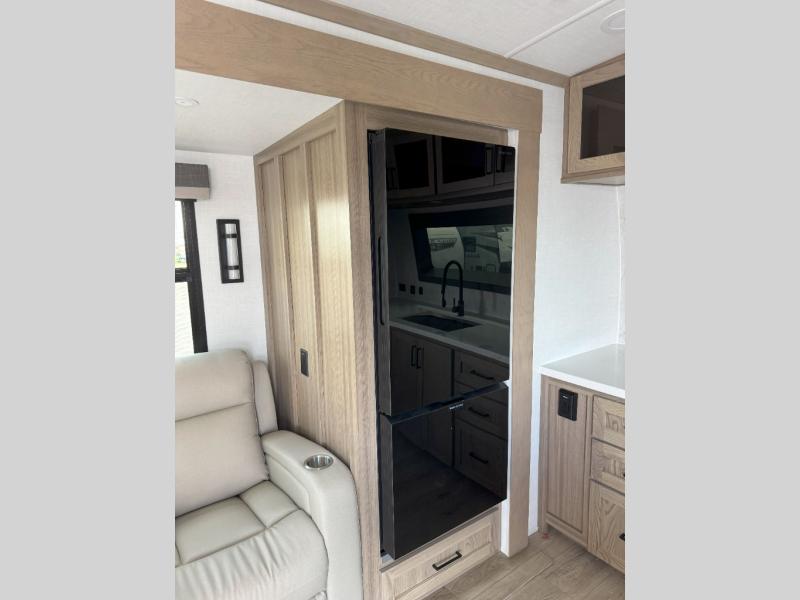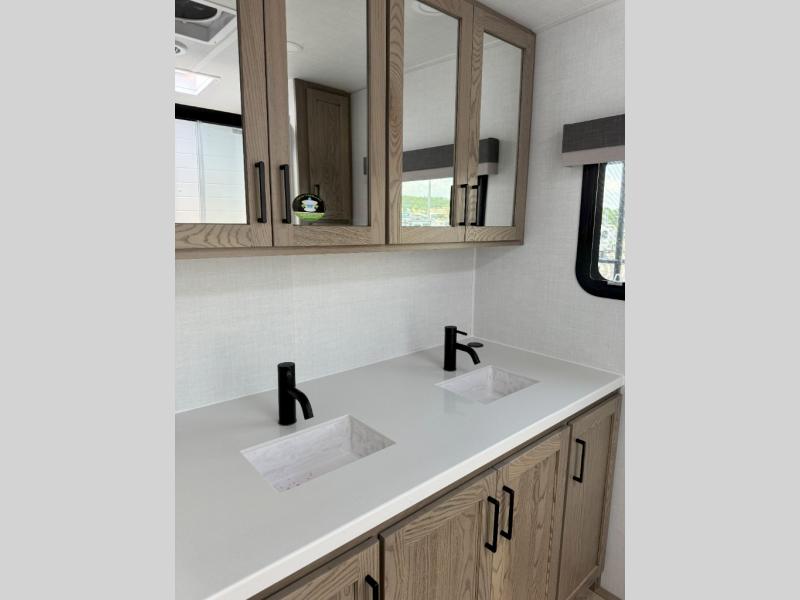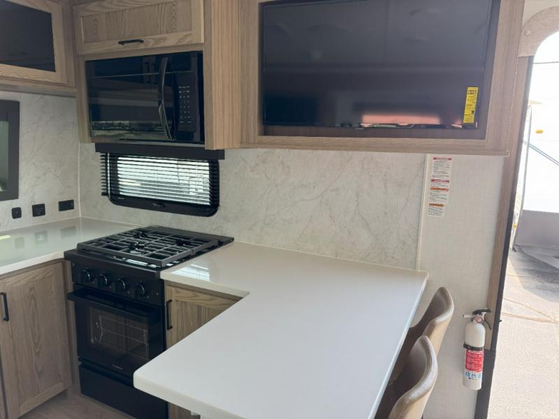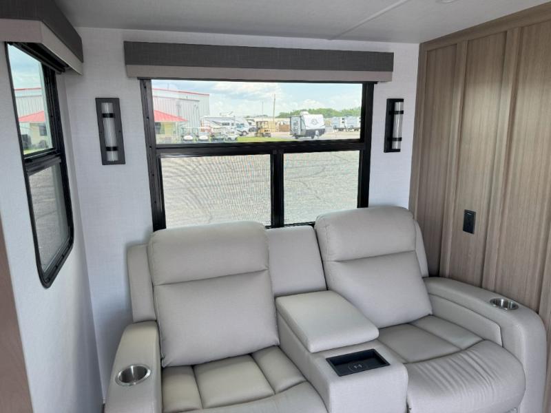 This front kitchen, couple's trailer is ready for adventure when you are! Once you arrive at your destination, prepare a quick lunch on the outside griddle, and enjoy the shade provided by the 19' power awning. You can eat outside, or inside at the counter with stools. The theatre seat will make this travel trailer feel more like home, and the double slides provide more space to stretch out. Within the master bedroom you'll find a king bed, a large wardrobe and a dresser, plus an optional TV. And check out the full rear bath with dual bath sinks and a shower with a seat! Now, that's what I call comfort!