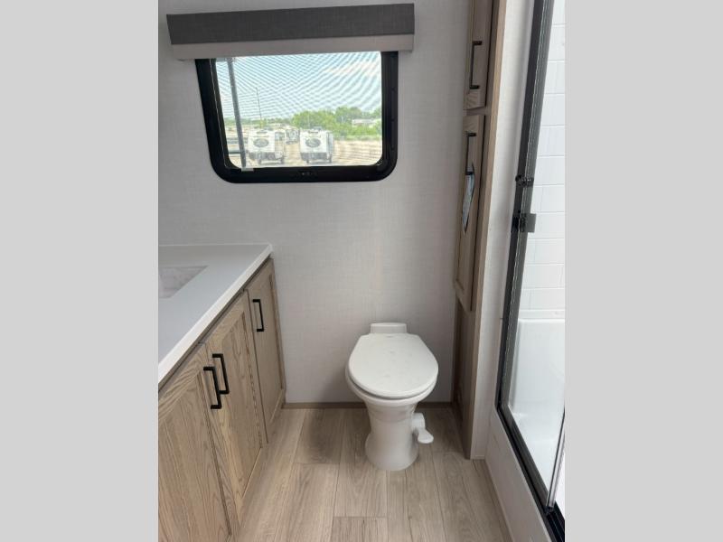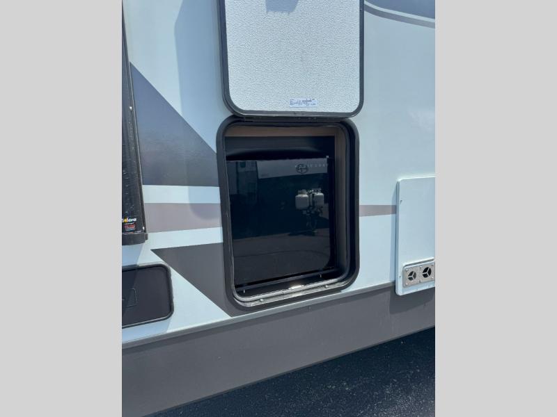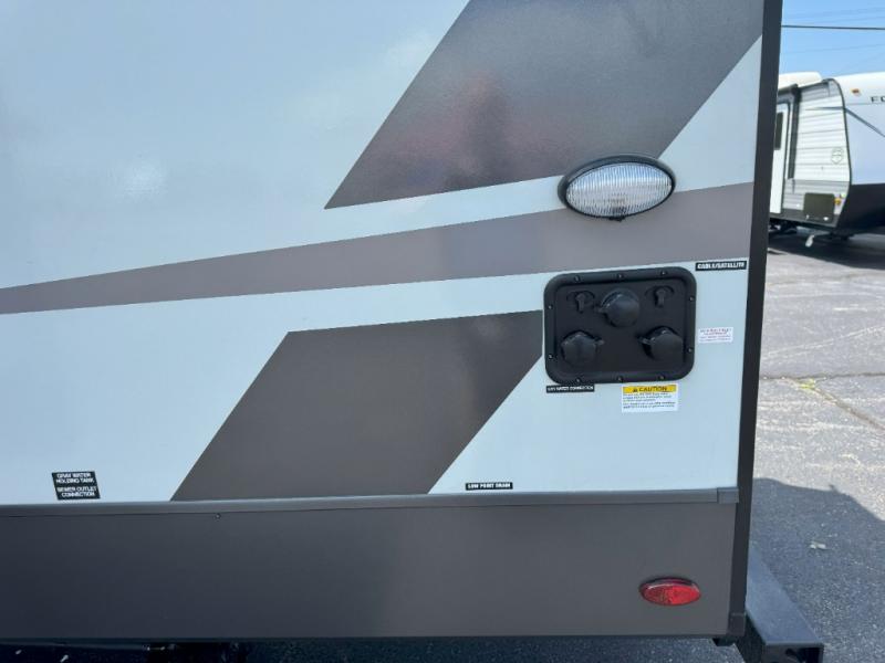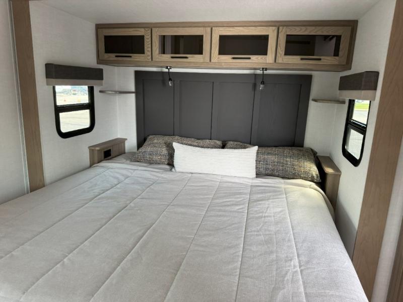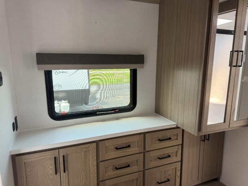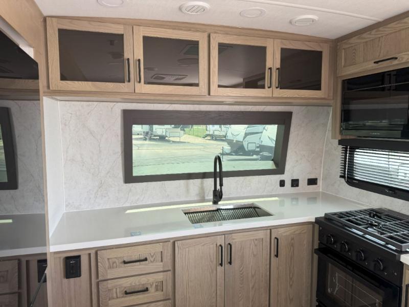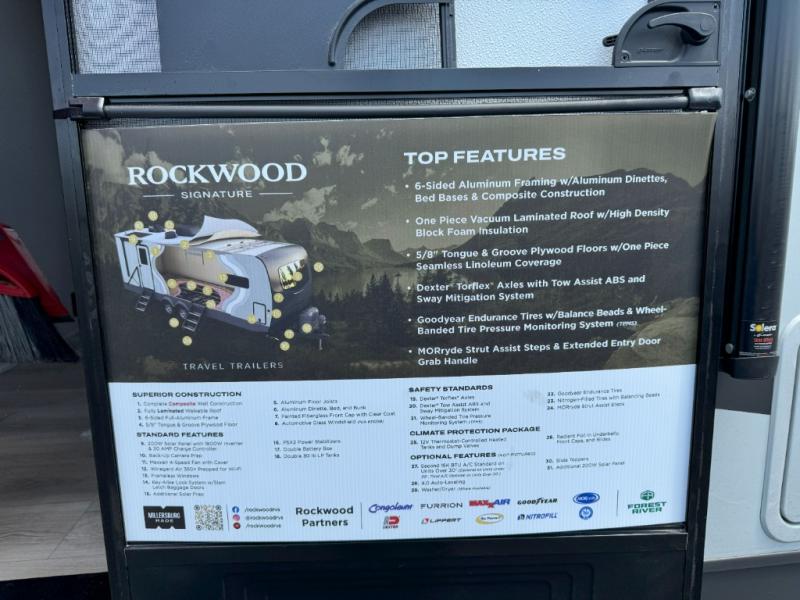 With any Rockwood Signature fifth wheel or travel trailer by Forest River RV, you will enjoy superior construction that includes laminated white fiberglass sidewalls, a radius roof with vaulted interior ceilings, plus radiant foil insulation and an enclosed underbelly for use in all types of weather. Some convenient exterior features include Keyed Alike locks, a rear ladder, a 200W solar panel, and a tire pressure monitor system with a monitor for added safety. The interior offers a One Touch OneControl panel with WeRV app control, for lights, awning, slides, water heater and more, and the Air 360+ omnidirectional antenna with WiFi prep lets you work while away from home if needed. You will also appreciate the interior vaulted ceilings, residential soft close doors and drawers, solid surface kitchen countertops, and designer kitchen backsplash!