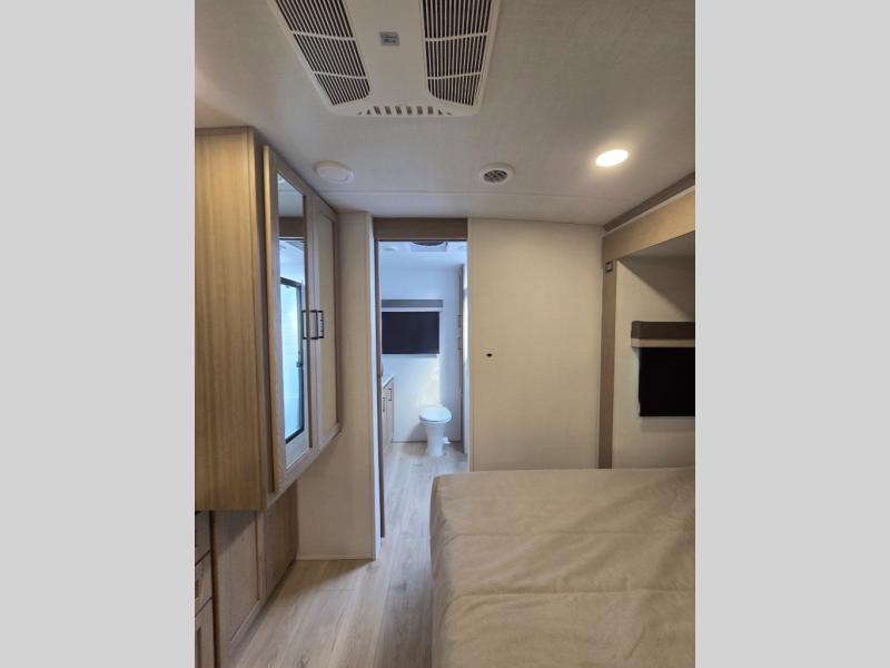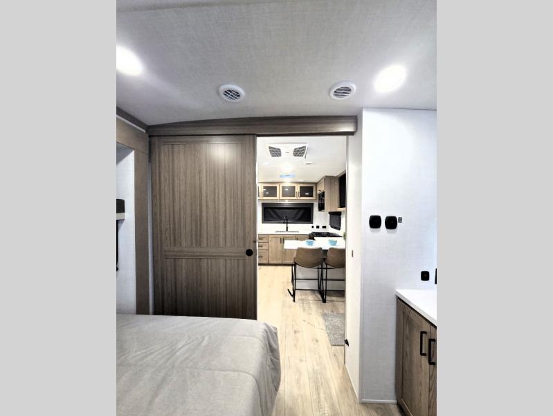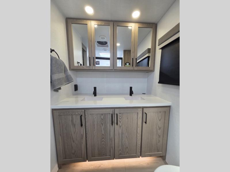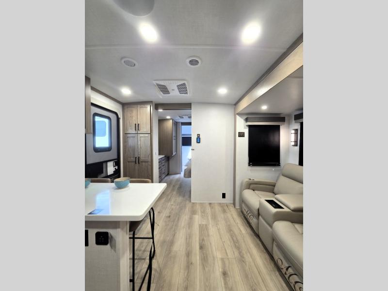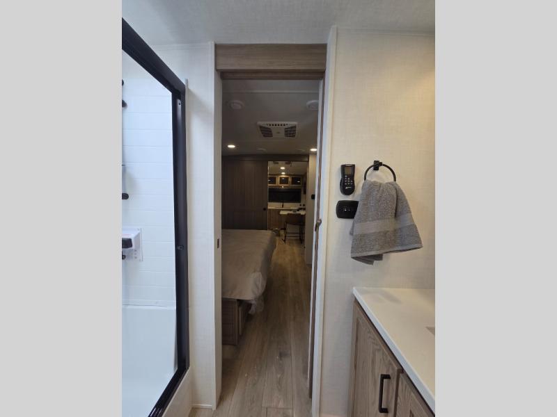 This front kitchen, couple's trailer is ready for adventure when you are! Once you arrive at your destination, prepare a quick lunch with the Griddle Prep, and enjoy the shade provided by the 19' power awning. You can eat outside, or inside at the counter with stools. The 67" theatre seat will make this travel trailer feel more like home, and the double slides provide more space to stretch out. Within the master bedroom you'll find a king bed, a large wardrobe and a dresser, plus an optional TV. And check out the full rear bath with dual bath sinks and a shower with a seat! Now, that's what I call comfort!