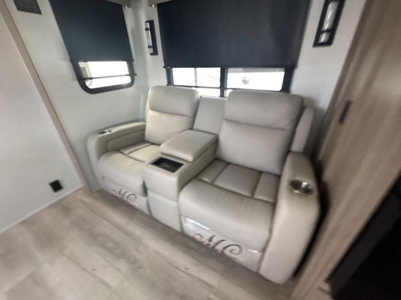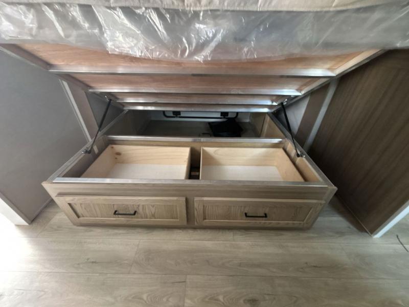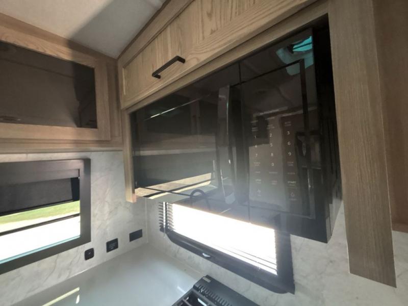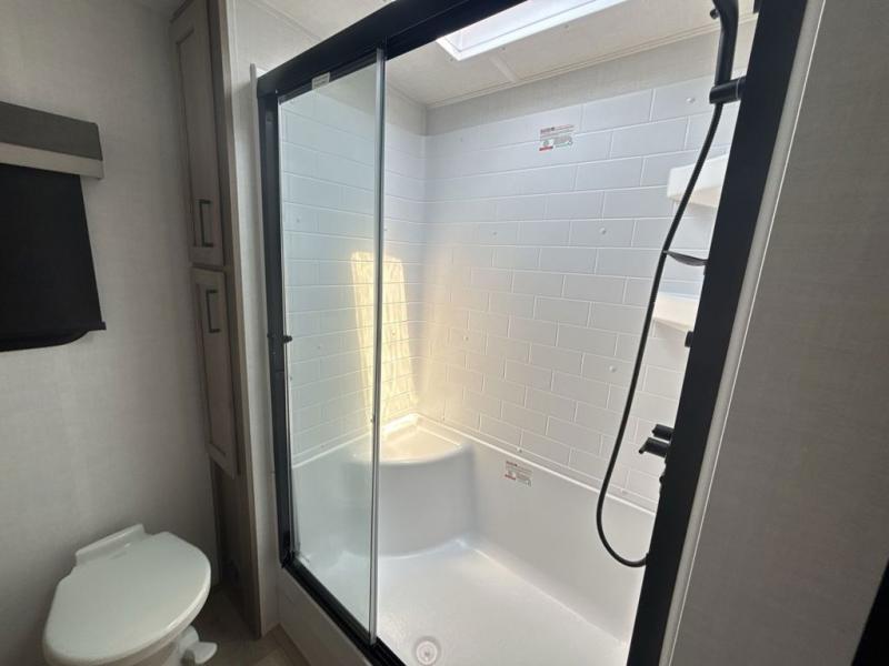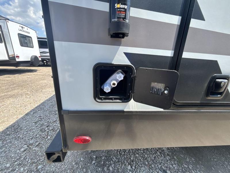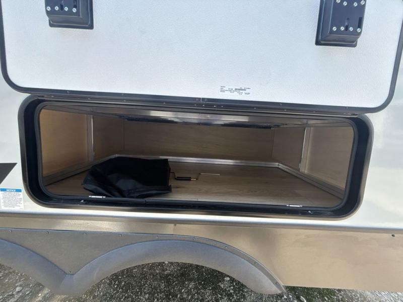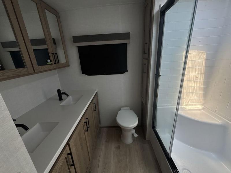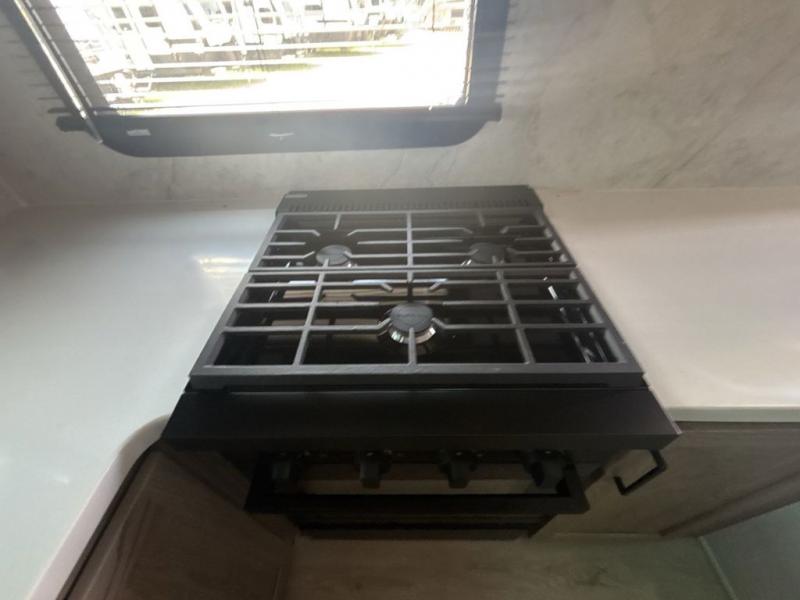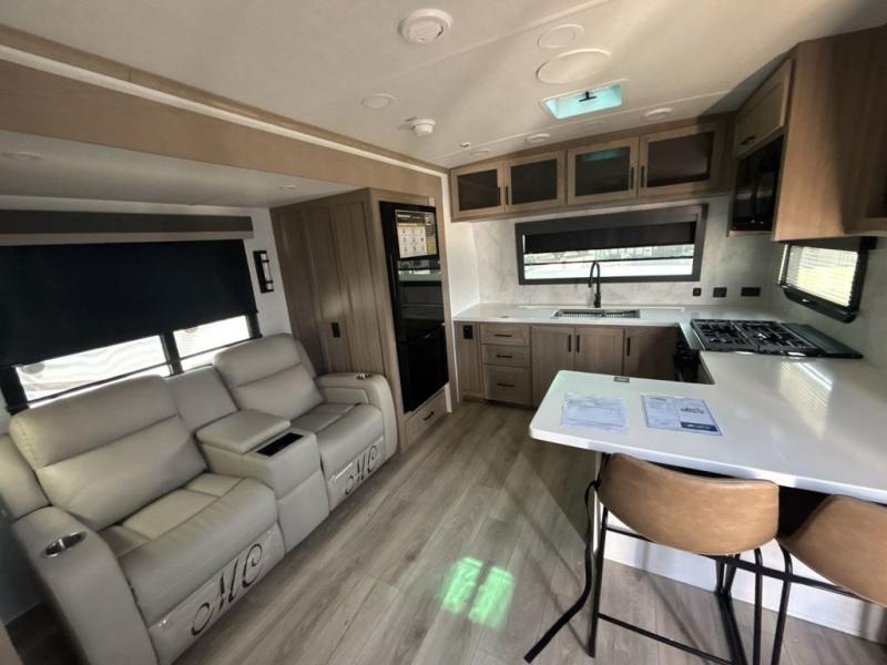 This front kitchen, couple's trailer is ready for adventure when you are! Once you arrive at your destination, prepare a quick lunch with the Griddle Prep, and enjoy the shade provided by the 19' power awning. You can eat outside, or inside at the counter with stools. The 67" theatre seat will make this travel trailer feel more like home, and the double slides provide more space to stretch out. Within the master bedroom you'll find a king bed, a large wardrobe and a dresser, plus an optional TV. And check out the full rear bath with dual bath sinks and a shower with a seat! Now, that's what I call comfort!