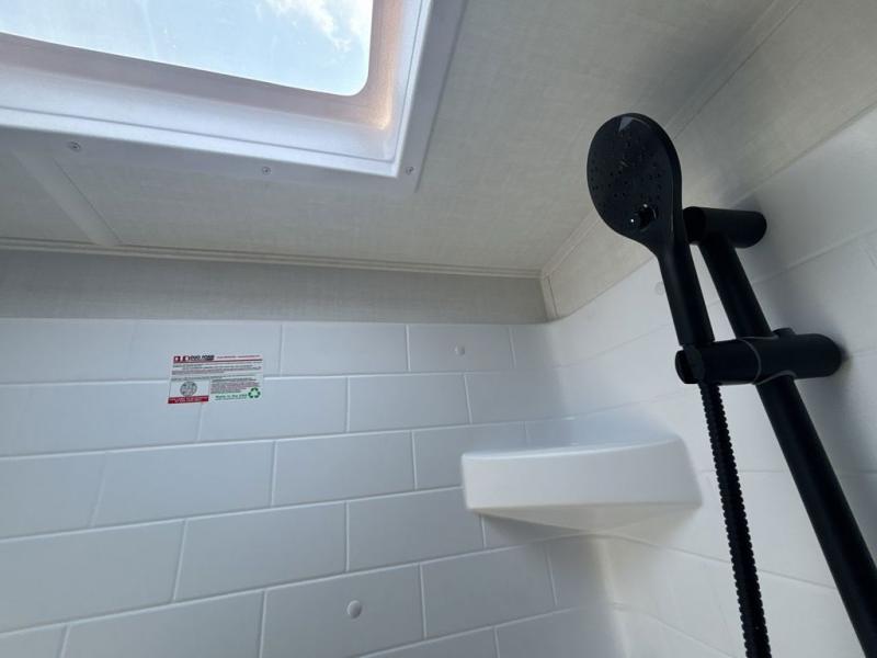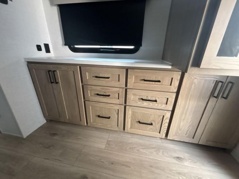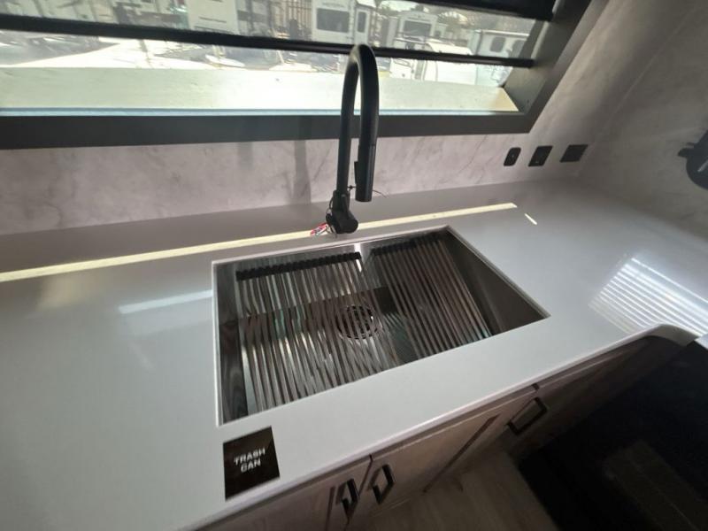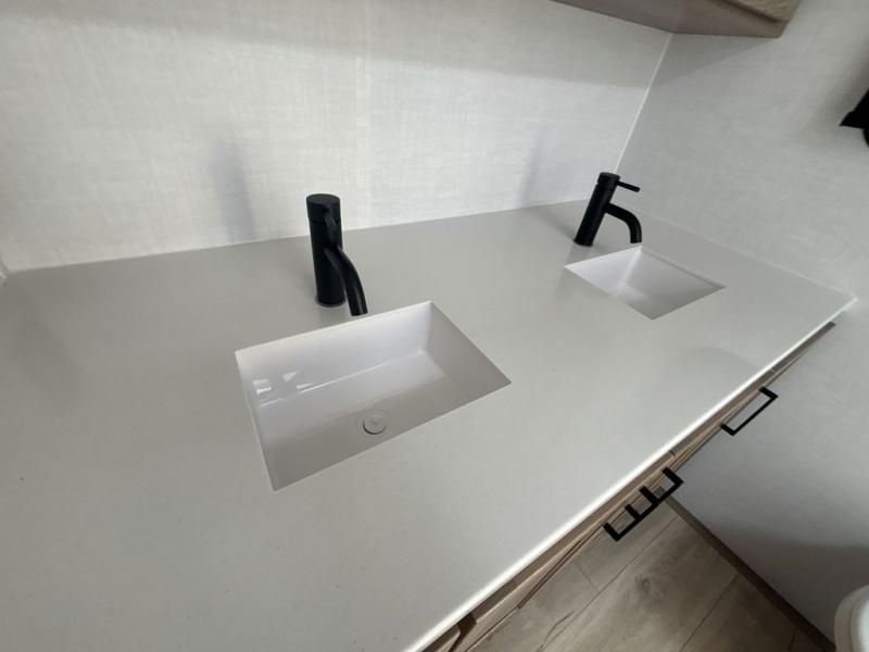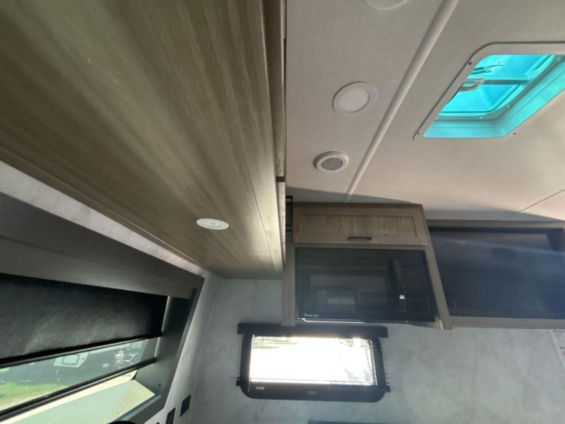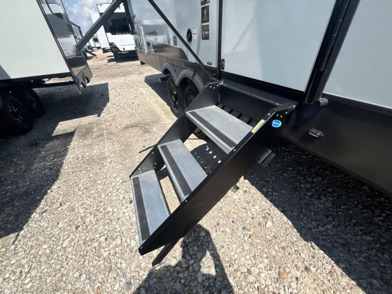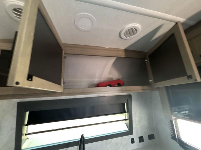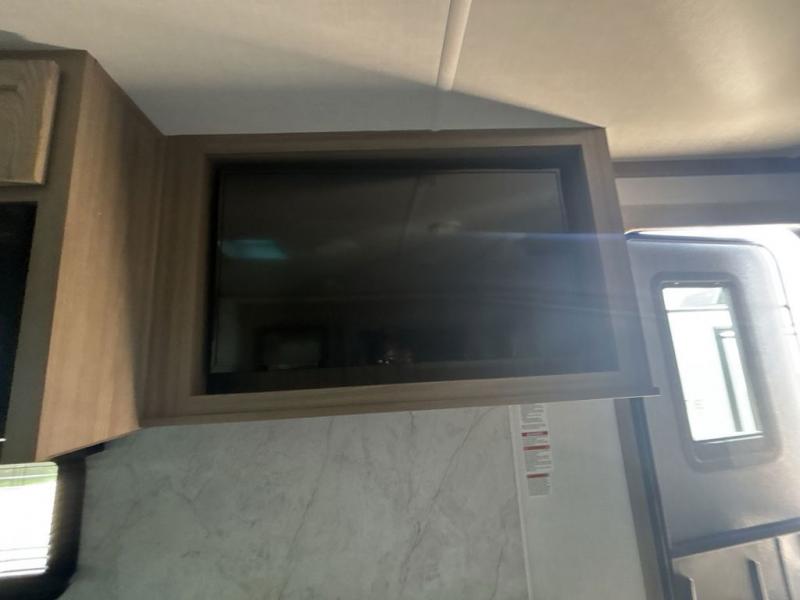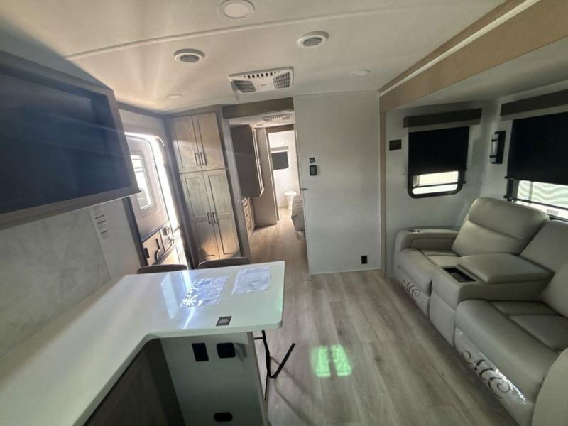 This front kitchen, couple's trailer is ready for adventure when you are! Once you arrive at your destination, prepare a quick lunch with the Griddle Prep, and enjoy the shade provided by the 19' power awning. You can eat outside, or inside at the counter with stools. The 67" theatre seat will make this travel trailer feel more like home, and the double slides provide more space to stretch out. Within the master bedroom you'll find a king bed, a large wardrobe and a dresser, plus an optional TV. And check out the full rear bath with dual bath sinks and a shower with a seat! Now, that's what I call comfort!