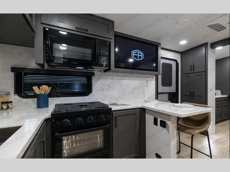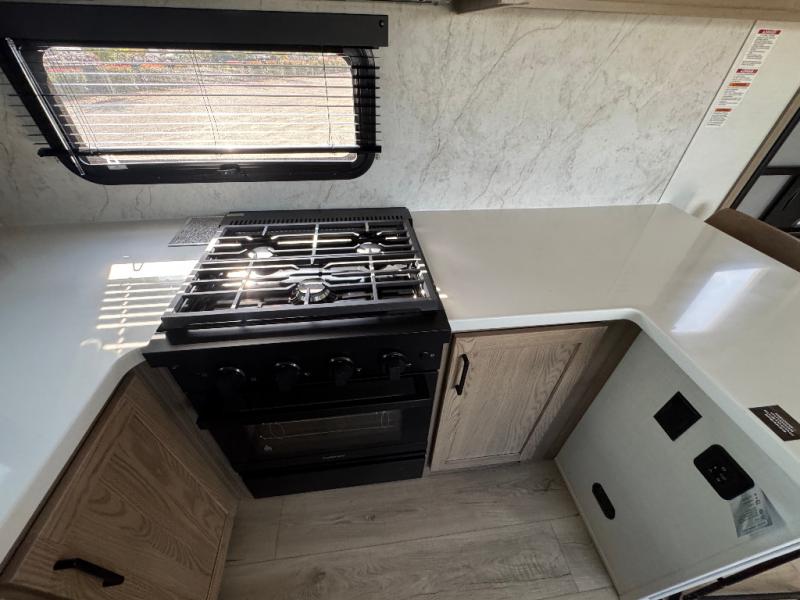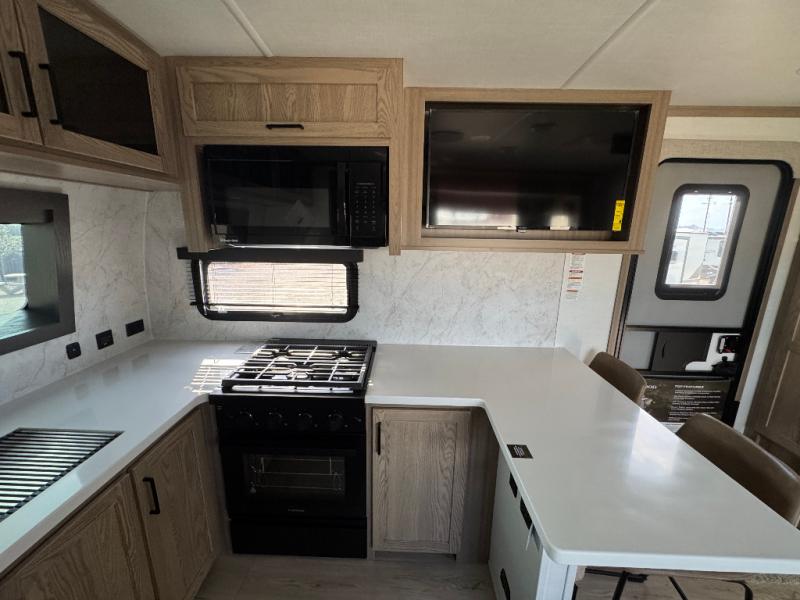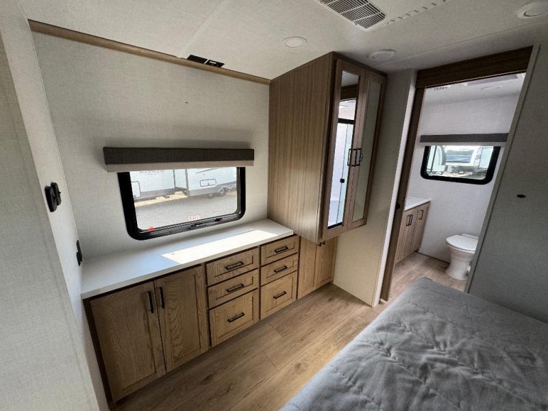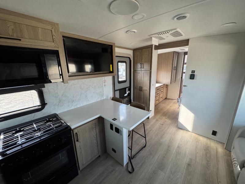 This front kitchen, couple's trailer is ready for adventure when you are! Once you arrive at your destination, prepare a quick lunch with the Griddle Prep, and enjoy the shade provided by the 19' power awning. You can eat outside, or inside at the counter with stools. The 67" theatre seat will make this travel trailer feel more like home, and the double slides provide more space to stretch out. Within the master bedroom you'll find a king bed, a large wardrobe and a dresser, plus an optional TV. And check out the full rear bath with dual bath sinks and a shower with a seat! Now, that's what I call comfort!