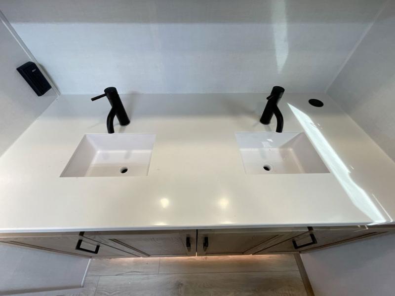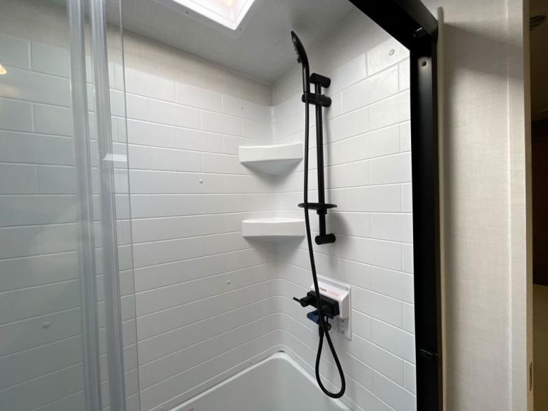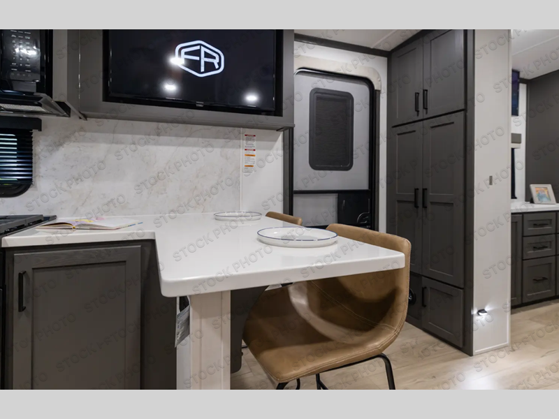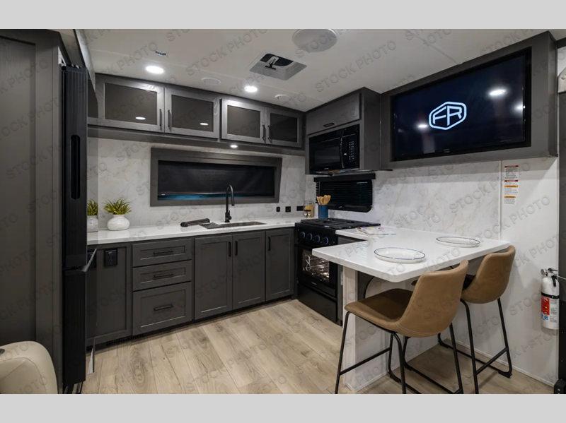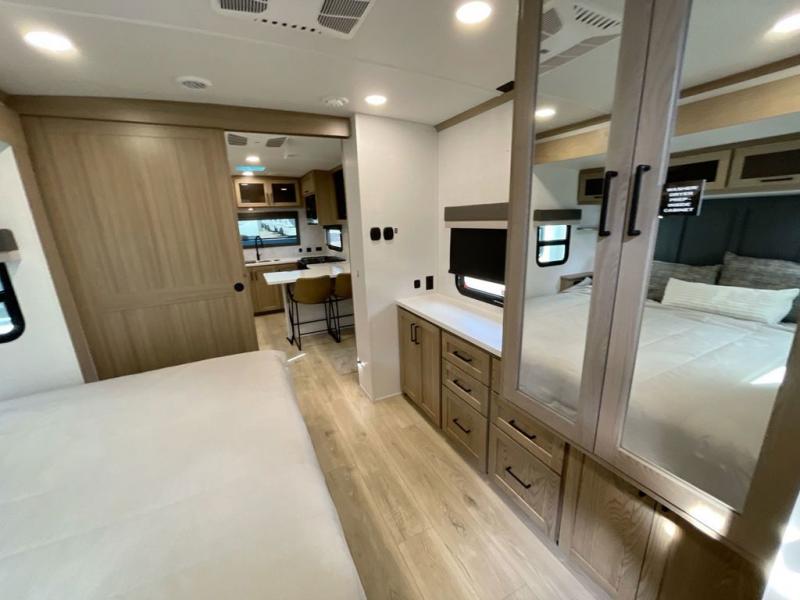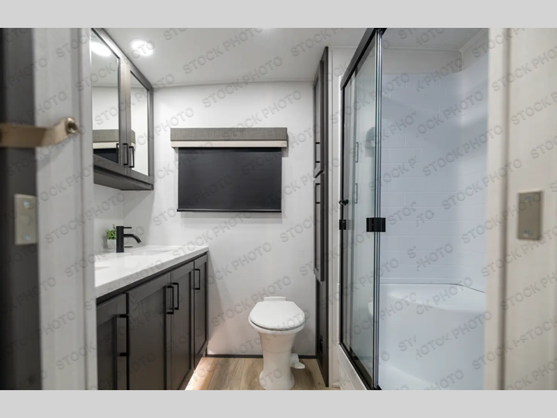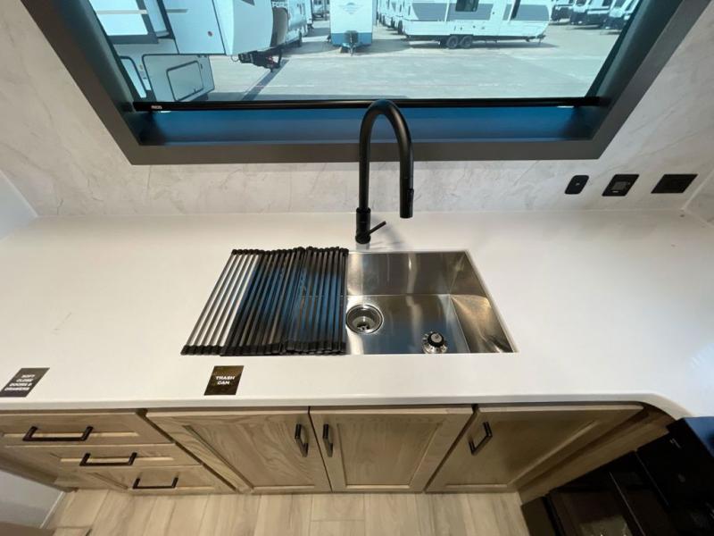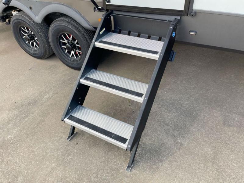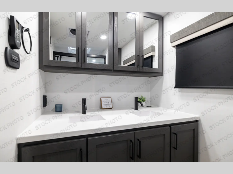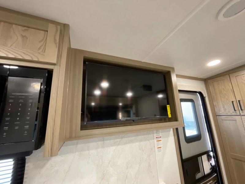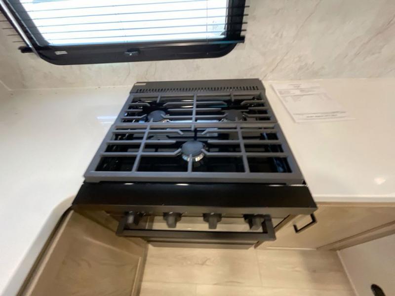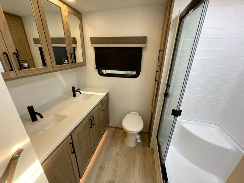 This front kitchen, couple's trailer is ready for adventure when you are! Once you arrive at your destination, prepare a quick lunch with the Griddle Prep, and enjoy the shade provided by the 19' power awning. You can eat outside, or inside at the counter with stools. The 67" theatre seat will make this travel trailer feel more like home, and the double slides provide more space to stretch out. Within the master bedroom you'll find a king bed, a large wardrobe and a dresser, plus an optional TV. And check out the full rear bath with dual bath sinks and a shower with a seat! Now, that's what I call comfort!
