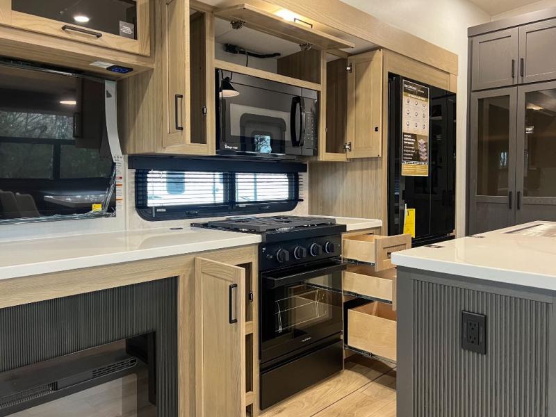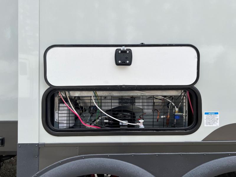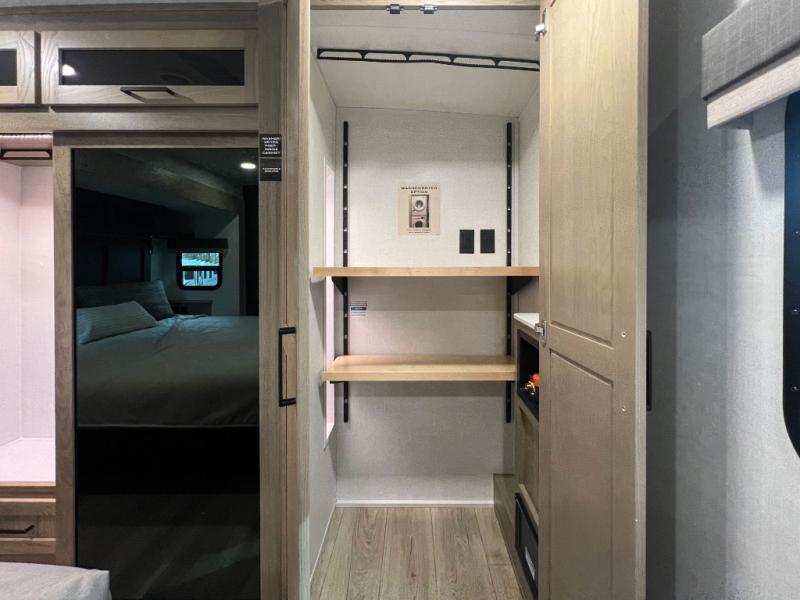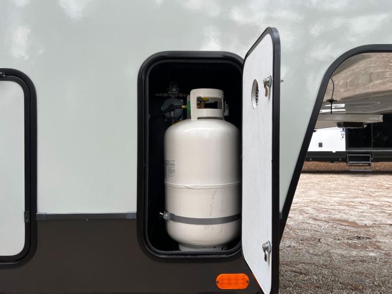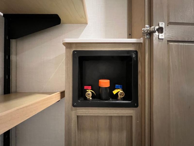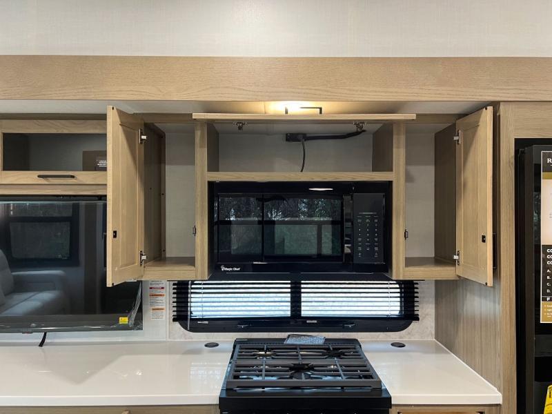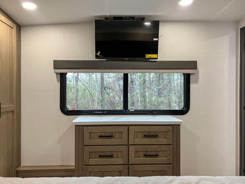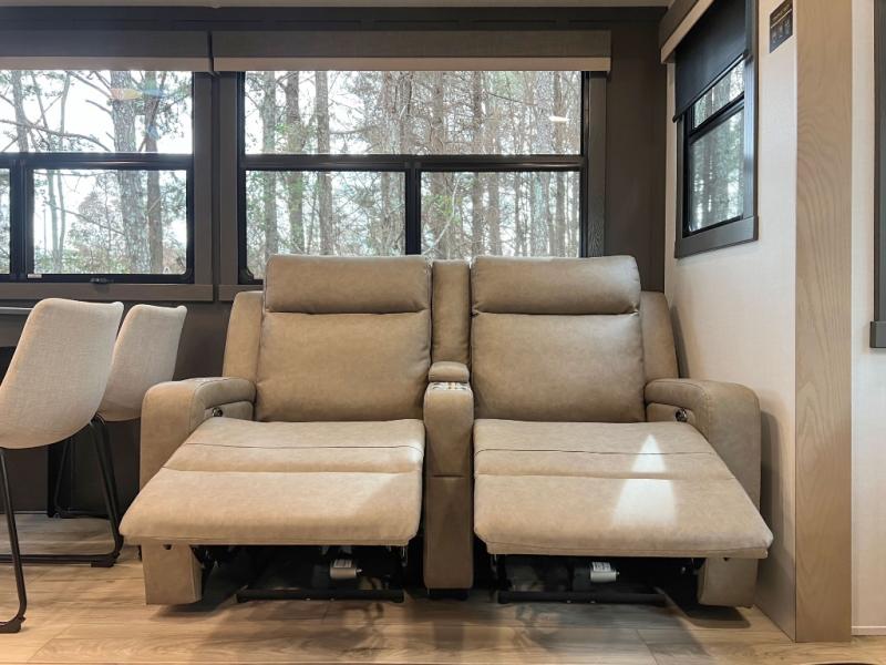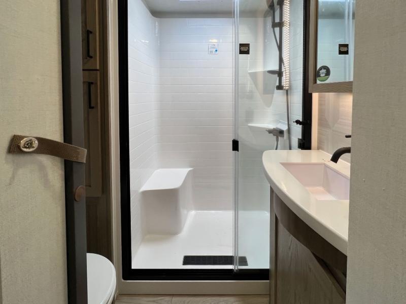 This front kitchen, couple's trailer is ready for adventure when you are! Once you arrive at your destination, prepare a quick lunch with the Griddle Prep, and enjoy the shade provided by the 19' power awning. You can eat outside, or inside at the counter with stools. The 67" theatre seat will make this travel trailer feel more like home, and the double slides provide more space to stretch out. Within the master bedroom you'll find a king bed, a large wardrobe and a dresser, plus an optional TV. And check out the full rear bath with dual bath sinks and a shower with a seat! Now, that's what I call comfort!