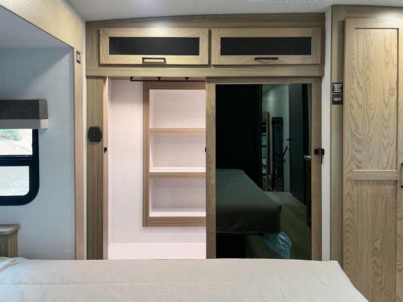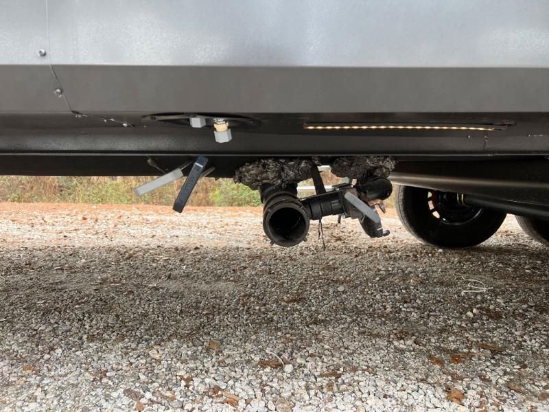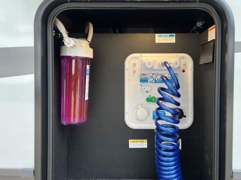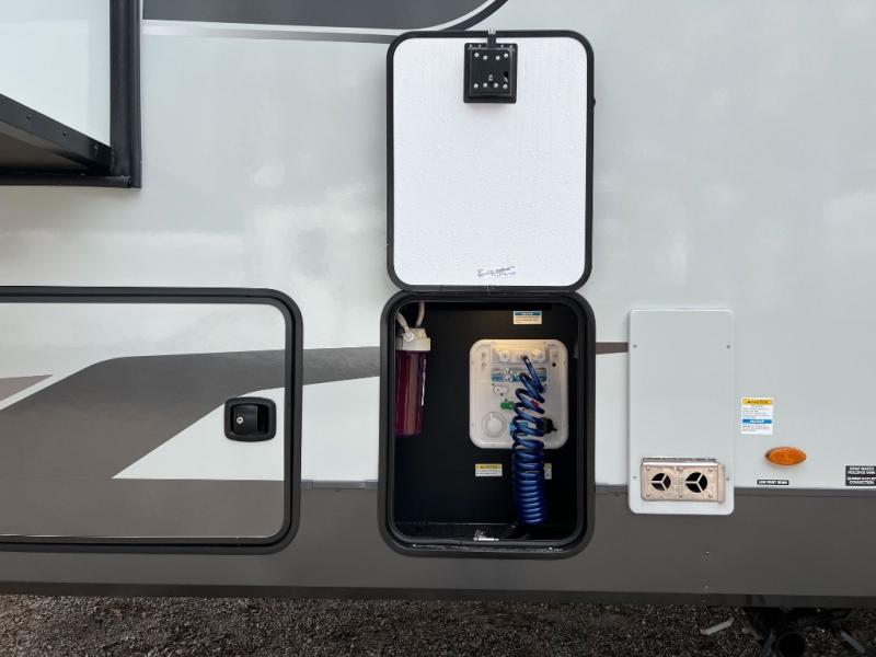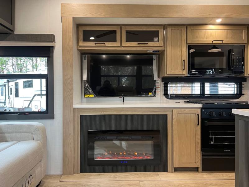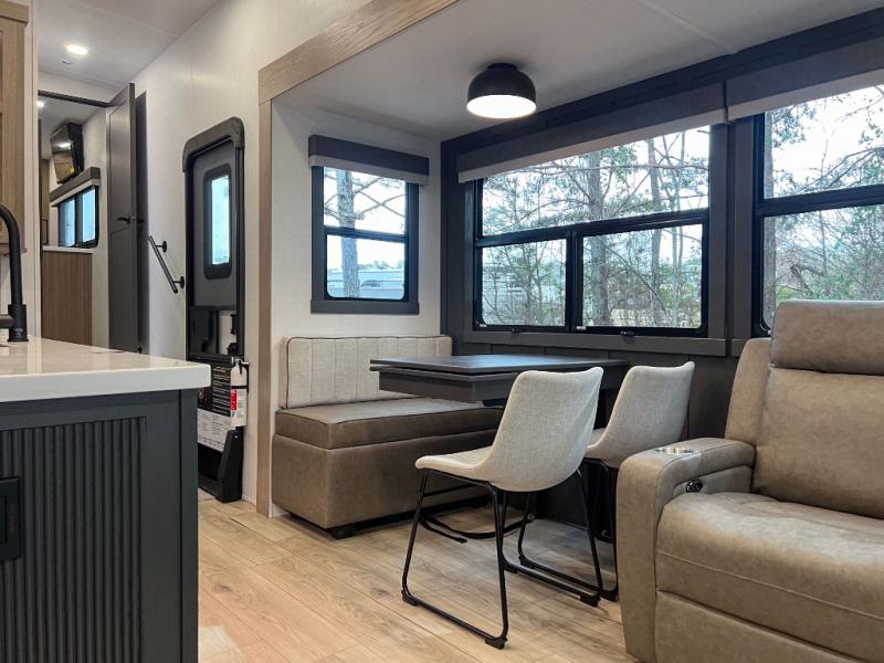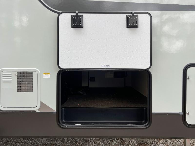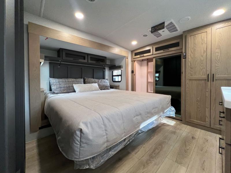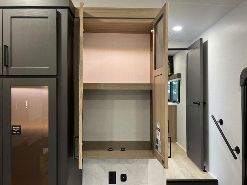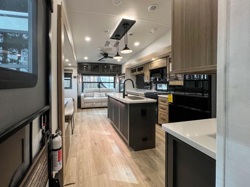 This front kitchen, couple's trailer is ready for adventure when you are! Once you arrive at your destination, prepare a quick lunch with the Griddle Prep, and enjoy the shade provided by the 19' power awning. You can eat outside, or inside at the counter with stools. The 67" theatre seat will make this travel trailer feel more like home, and the double slides provide more space to stretch out. Within the master bedroom you'll find a king bed, a large wardrobe and a dresser, plus an optional TV. And check out the full rear bath with dual bath sinks and a shower with a seat! Now, that's what I call comfort!