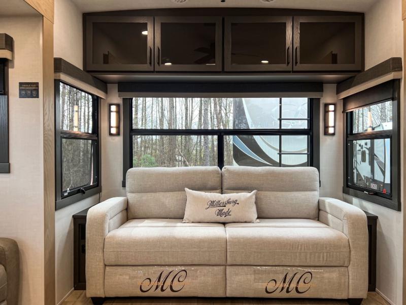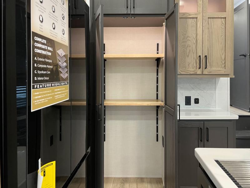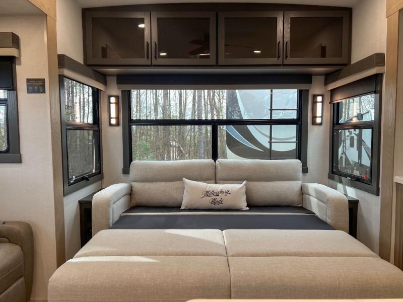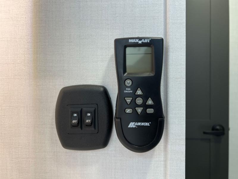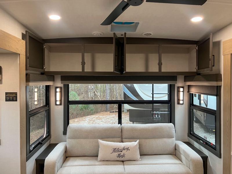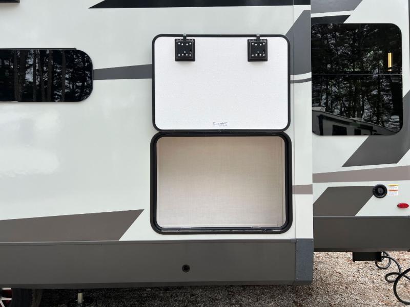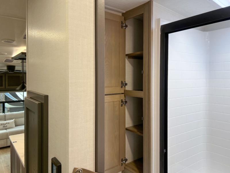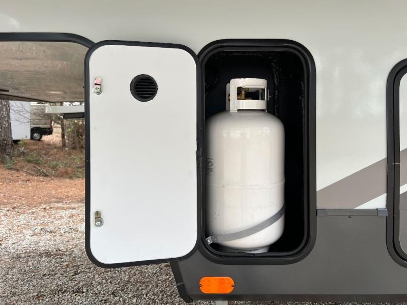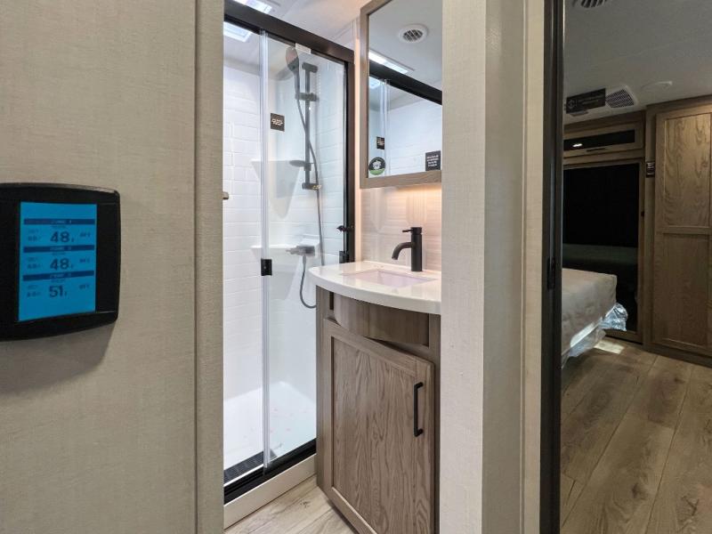 This front kitchen, couple's trailer is ready for adventure when you are! Once you arrive at your destination, prepare a quick lunch with the Griddle Prep, and enjoy the shade provided by the 19' power awning. You can eat outside, or inside at the counter with stools. The 67" theatre seat will make this travel trailer feel more like home, and the double slides provide more space to stretch out. Within the master bedroom you'll find a king bed, a large wardrobe and a dresser, plus an optional TV. And check out the full rear bath with dual bath sinks and a shower with a seat! Now, that's what I call comfort!