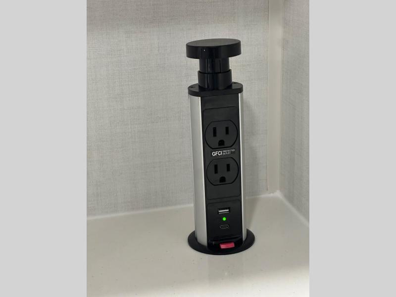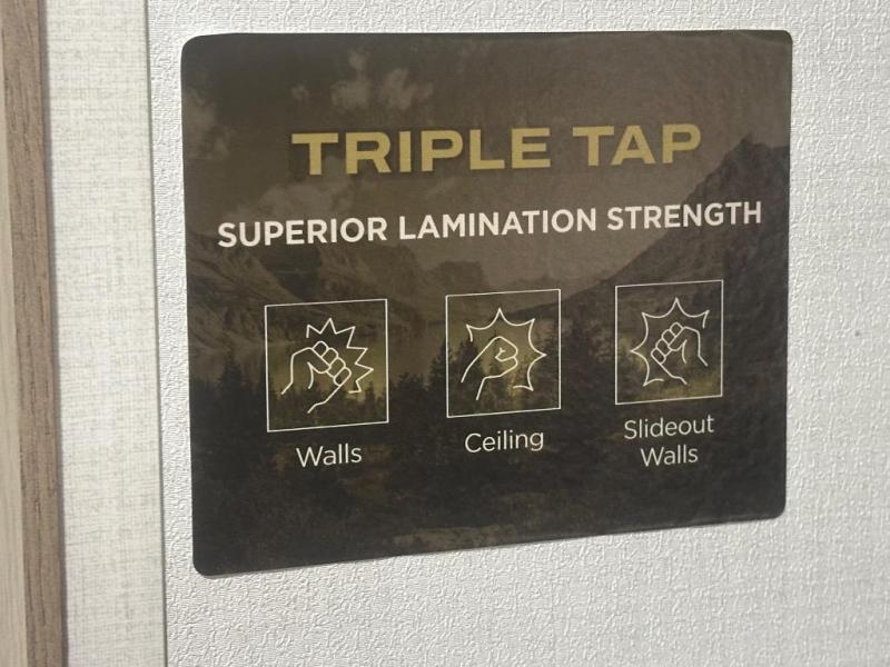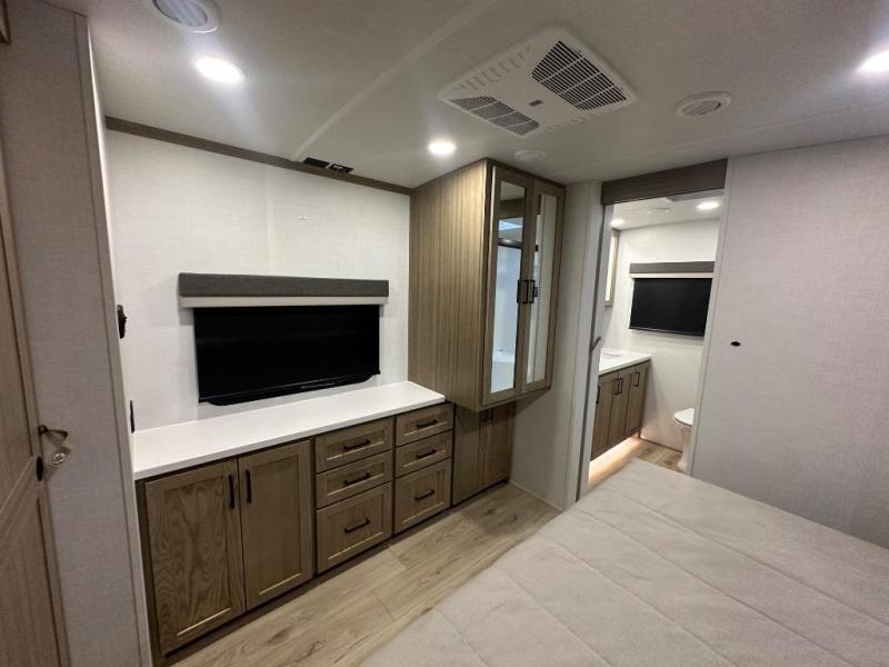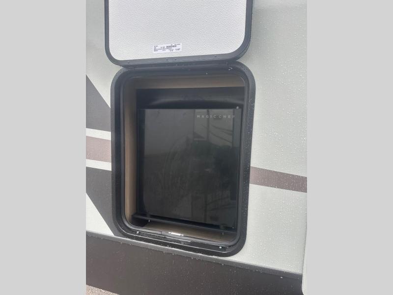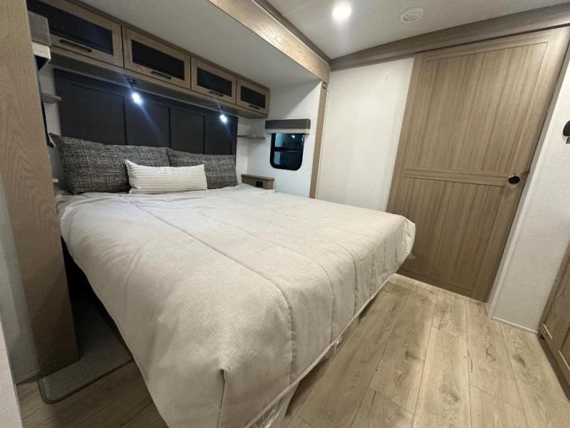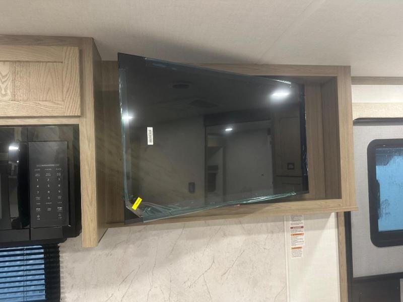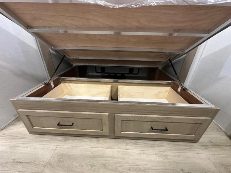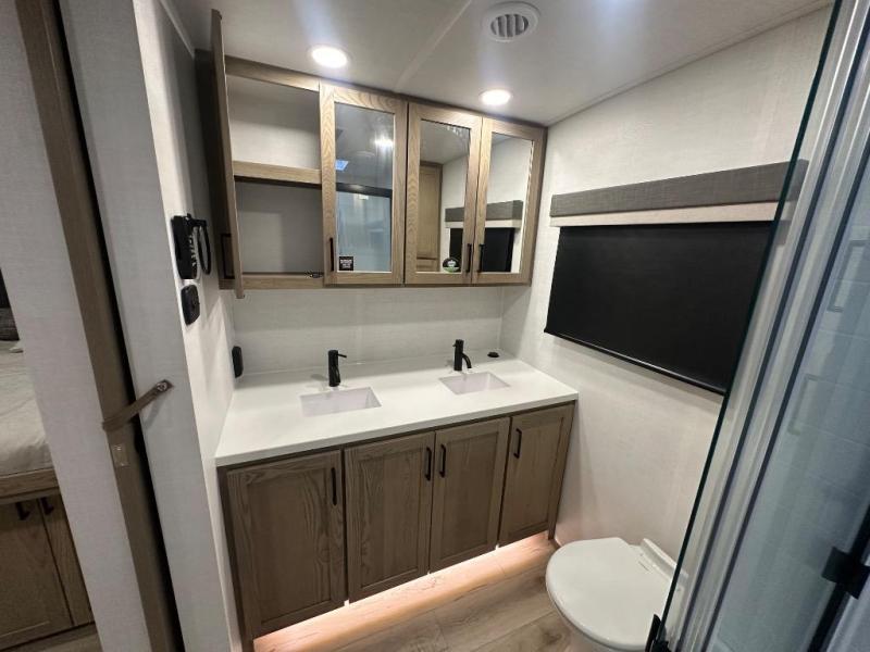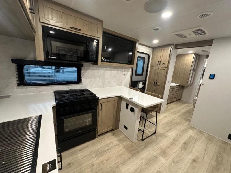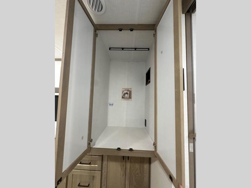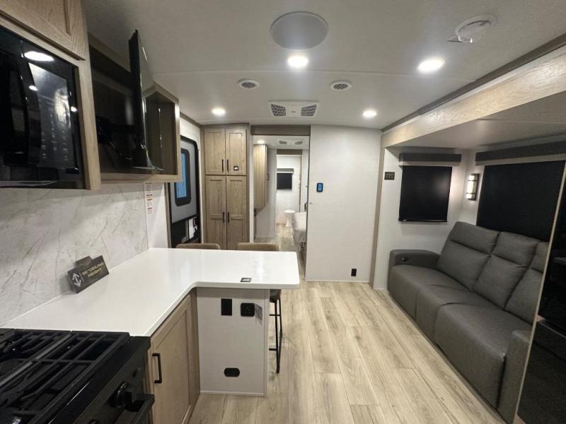 This front kitchen, couple's trailer is ready for adventure when you are! Once you arrive at your destination, prepare a quick lunch with the Griddle Prep, and enjoy the shade provided by the 19' power awning. You can eat outside, or inside at the counter with stools. The 67" theatre seat will make this travel trailer feel more like home, and the double slides provide more space to stretch out. Within the master bedroom you'll find a king bed, a large wardrobe and a dresser, plus an optional TV. And check out the full rear bath with dual bath sinks and a shower with a seat! Now, that's what I call comfort!