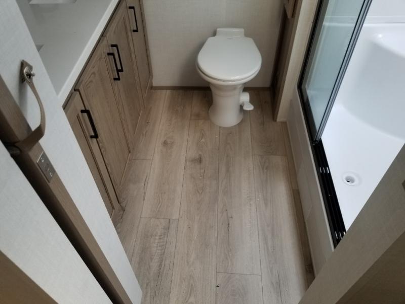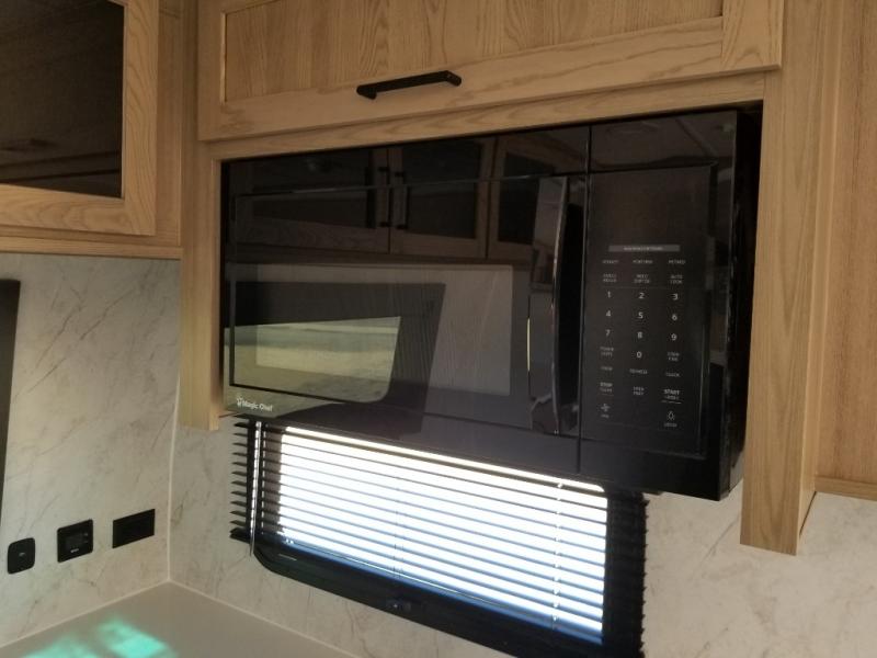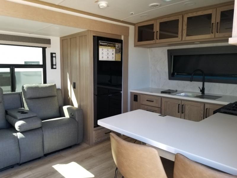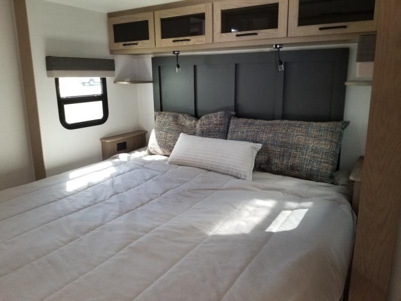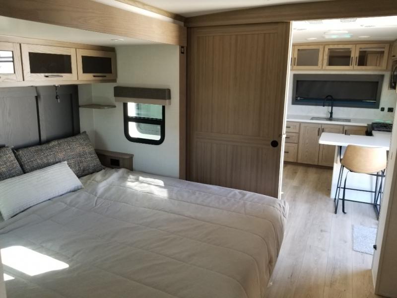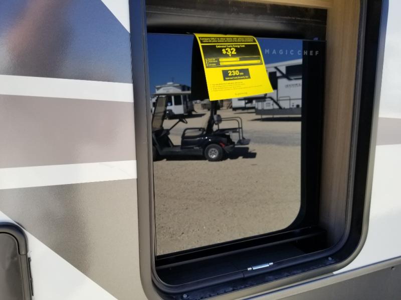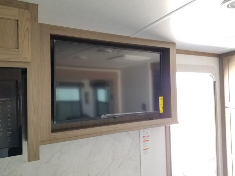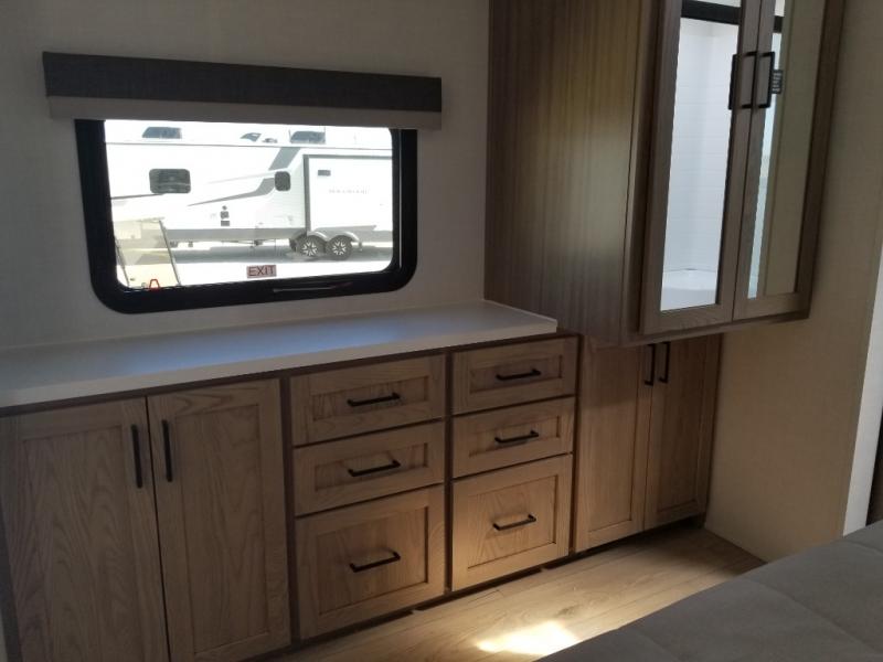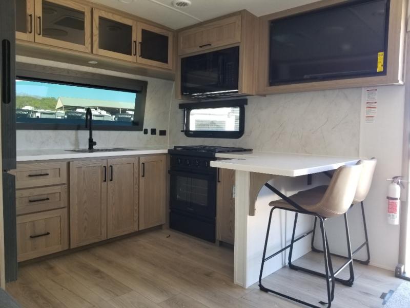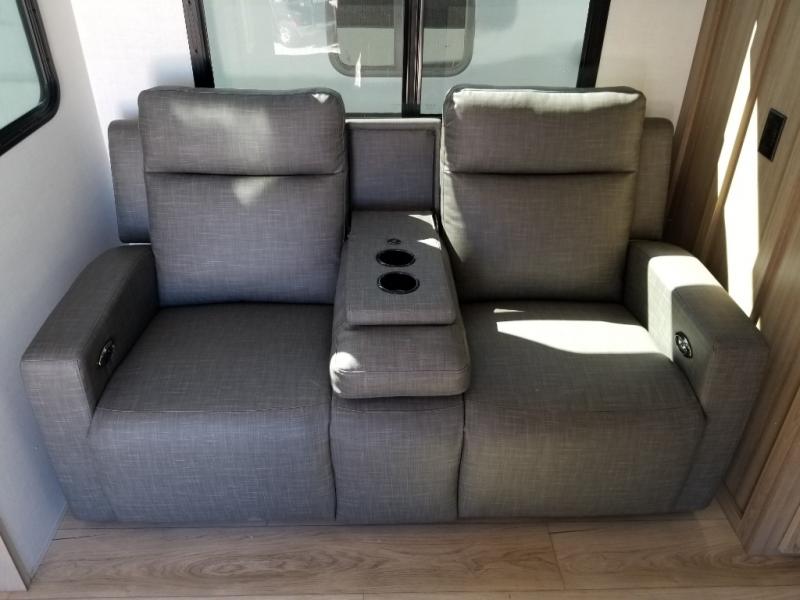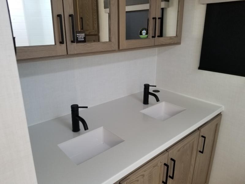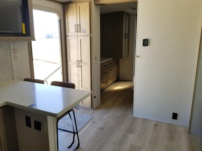 This front kitchen, couple's trailer is ready for adventure when you are! Once you arrive at your destination, prepare a quick lunch with the Griddle Prep, and enjoy the shade provided by the 19' power awning. You can eat outside, or inside at the counter with stools. The 67" theatre seat will make this travel trailer feel more like home, and the double slides provide more space to stretch out. Within the master bedroom you'll find a king bed, a large wardrobe and a dresser, plus an optional TV. And check out the full rear bath with dual bath sinks and a shower with a seat! Now, that's what I call comfort!
