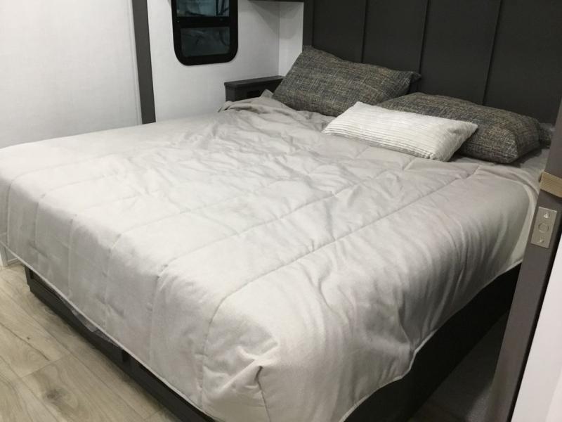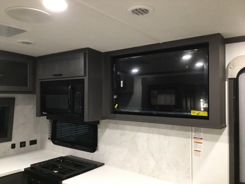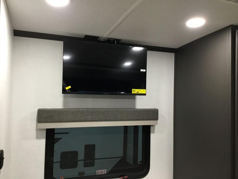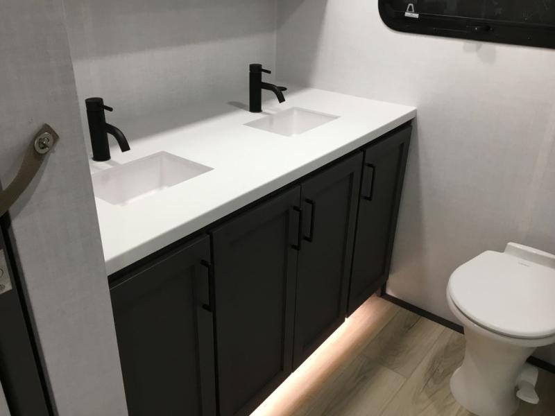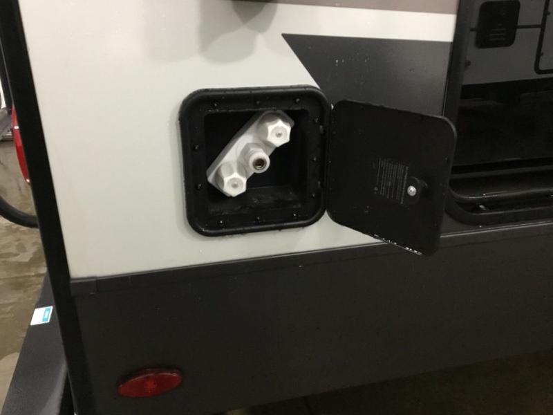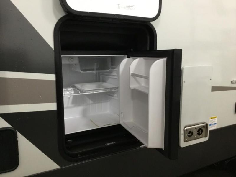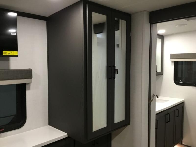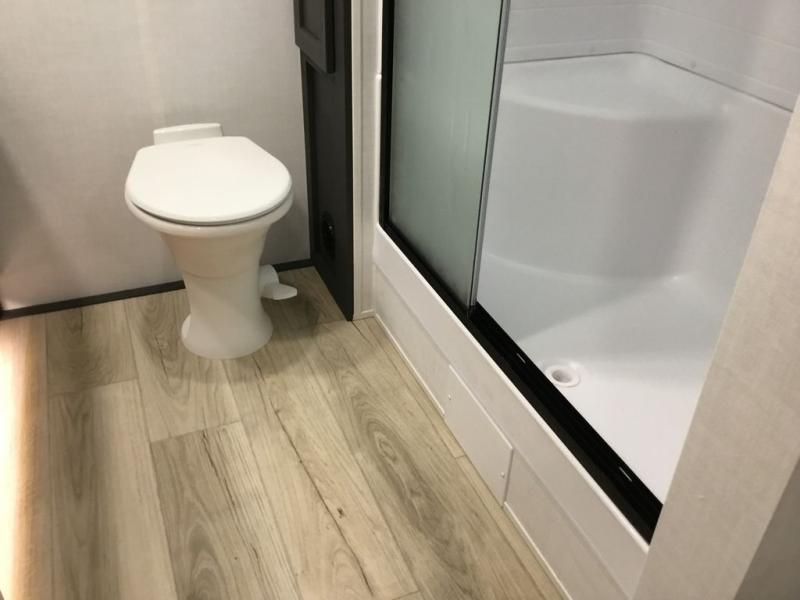 This front kitchen, couple's trailer is ready for adventure when you are! Once you arrive at your destination, prepare a quick lunch with the Griddle Prep, and enjoy the shade provided by the 19' power awning. You can eat outside, or inside at the counter with stools. The 67" theatre seat will make this travel trailer feel more like home, and the double slides provide more space to stretch out. Within the master bedroom you'll find a king bed, a large wardrobe and a dresser, plus an optional TV. And check out the full rear bath with dual bath sinks and a shower with a seat! Now, that's what I call comfort!