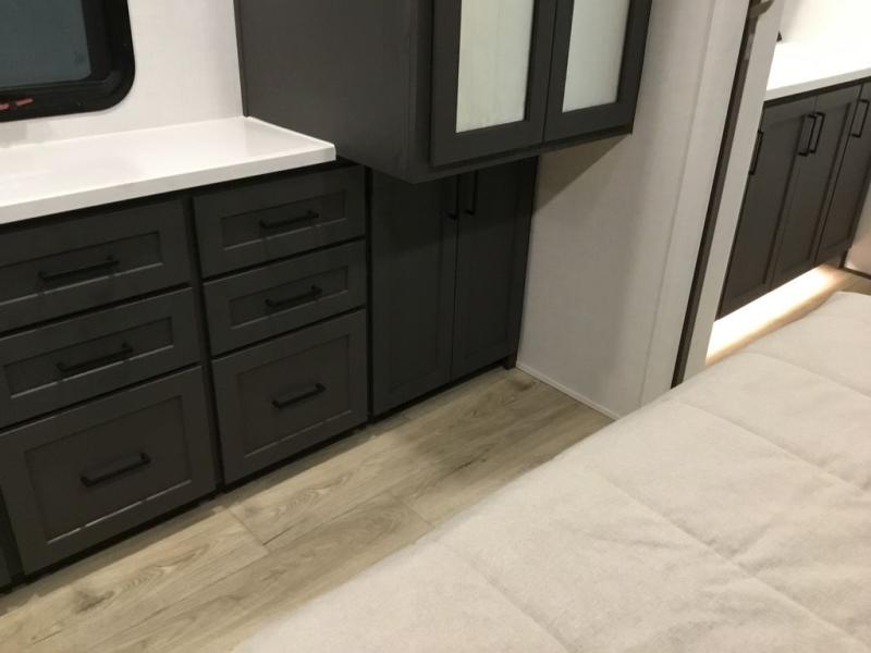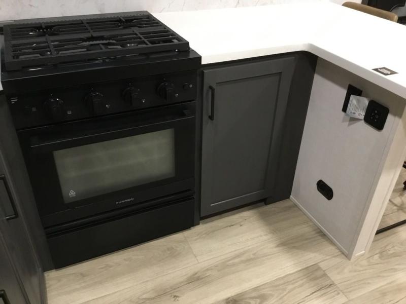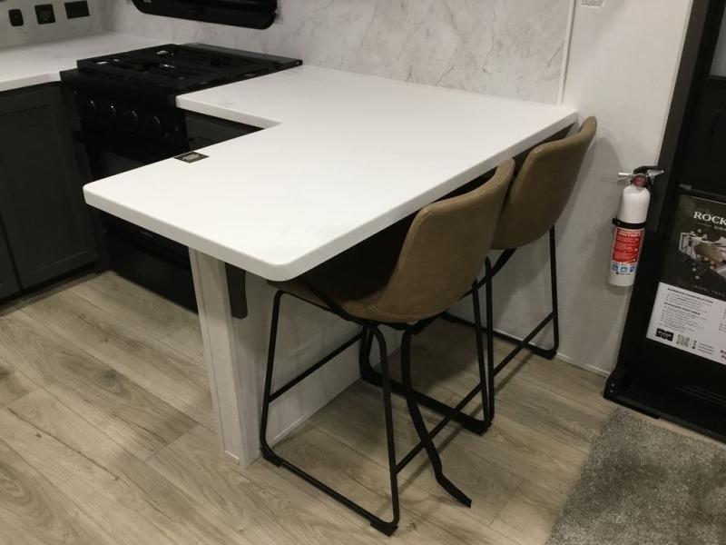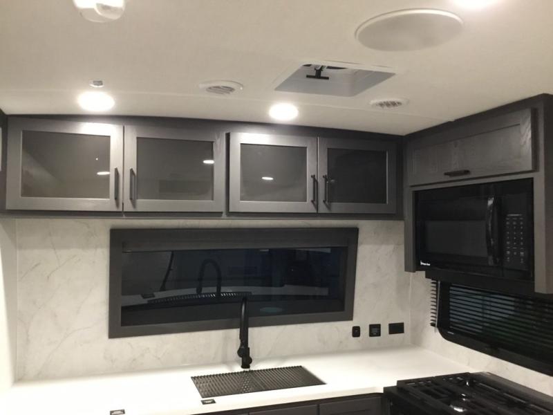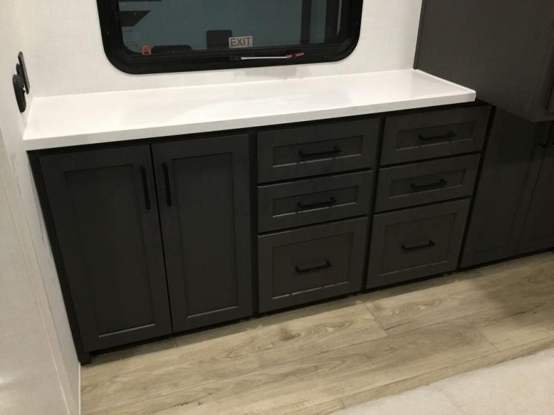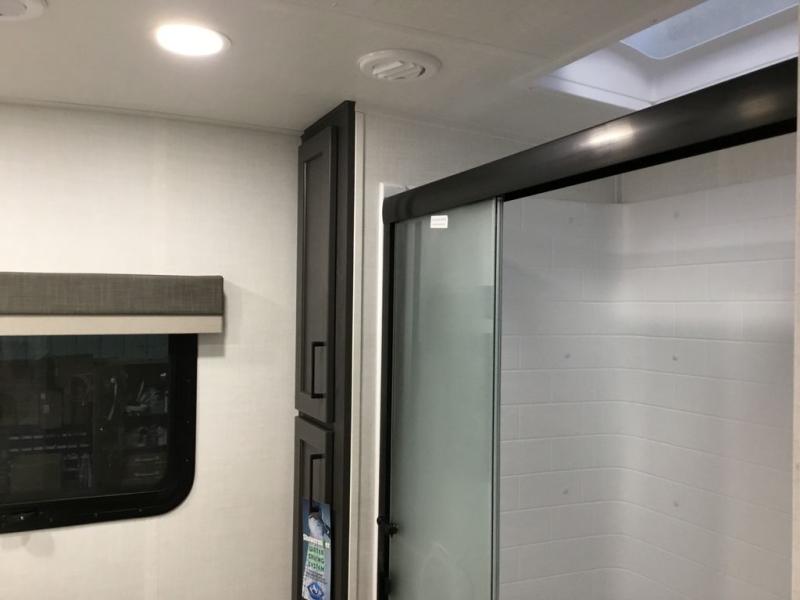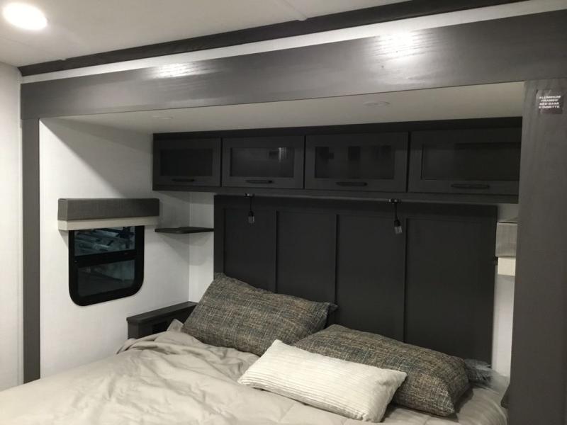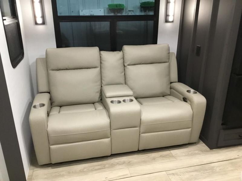 This front kitchen, couple's trailer is ready for adventure when you are! Once you arrive at your destination, prepare a quick lunch with the Griddle Prep, and enjoy the shade provided by the 19' power awning. You can eat outside, or inside at the counter with stools. The 67" theatre seat will make this travel trailer feel more like home, and the double slides provide more space to stretch out. Within the master bedroom you'll find a king bed, a large wardrobe and a dresser, plus an optional TV. And check out the full rear bath with dual bath sinks and a shower with a seat! Now, that's what I call comfort!